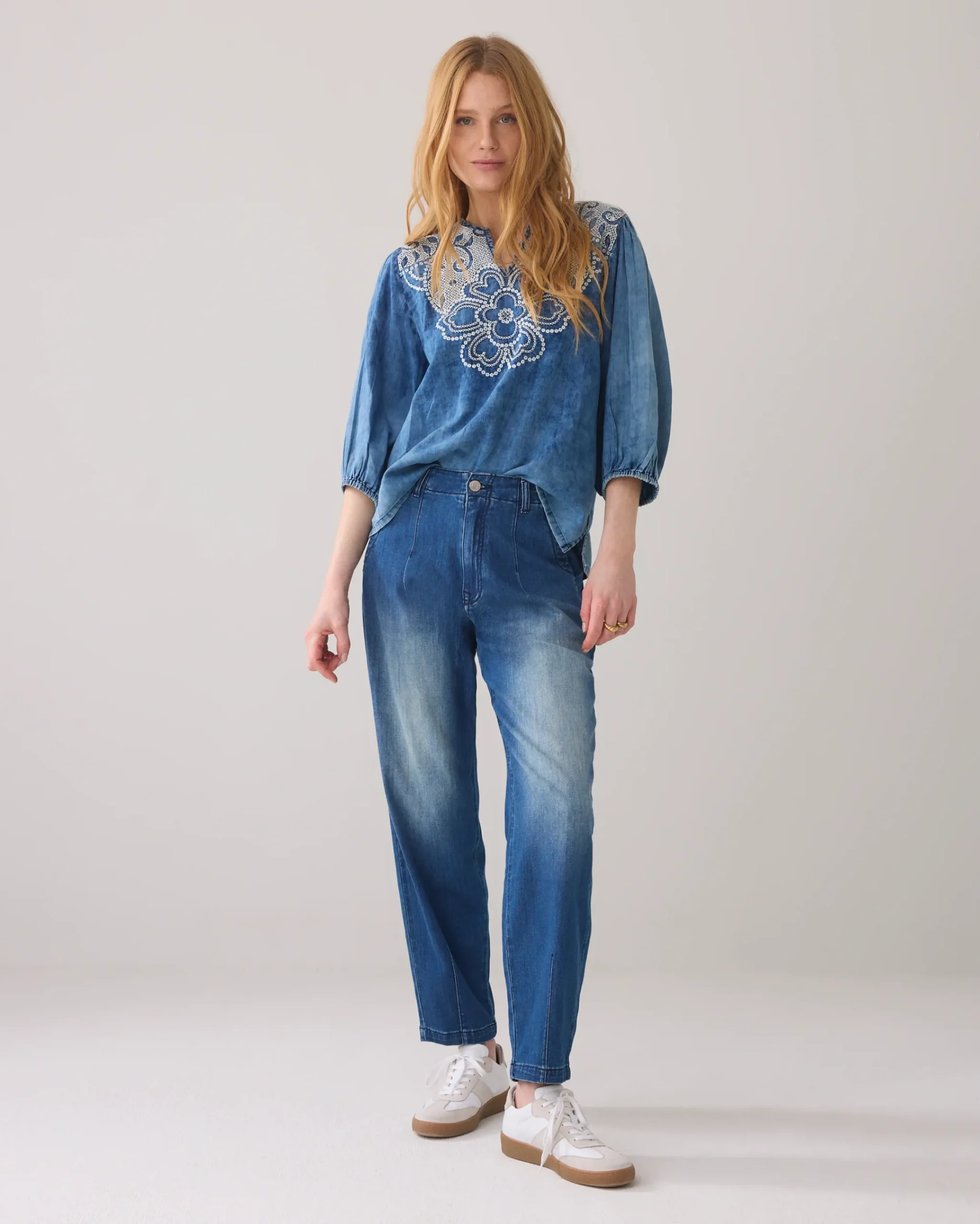 These barrel-fit jeans have a cool look thanks to the rolled-up legs and a low waist. The trousers are made of a soft stretch twill denim.