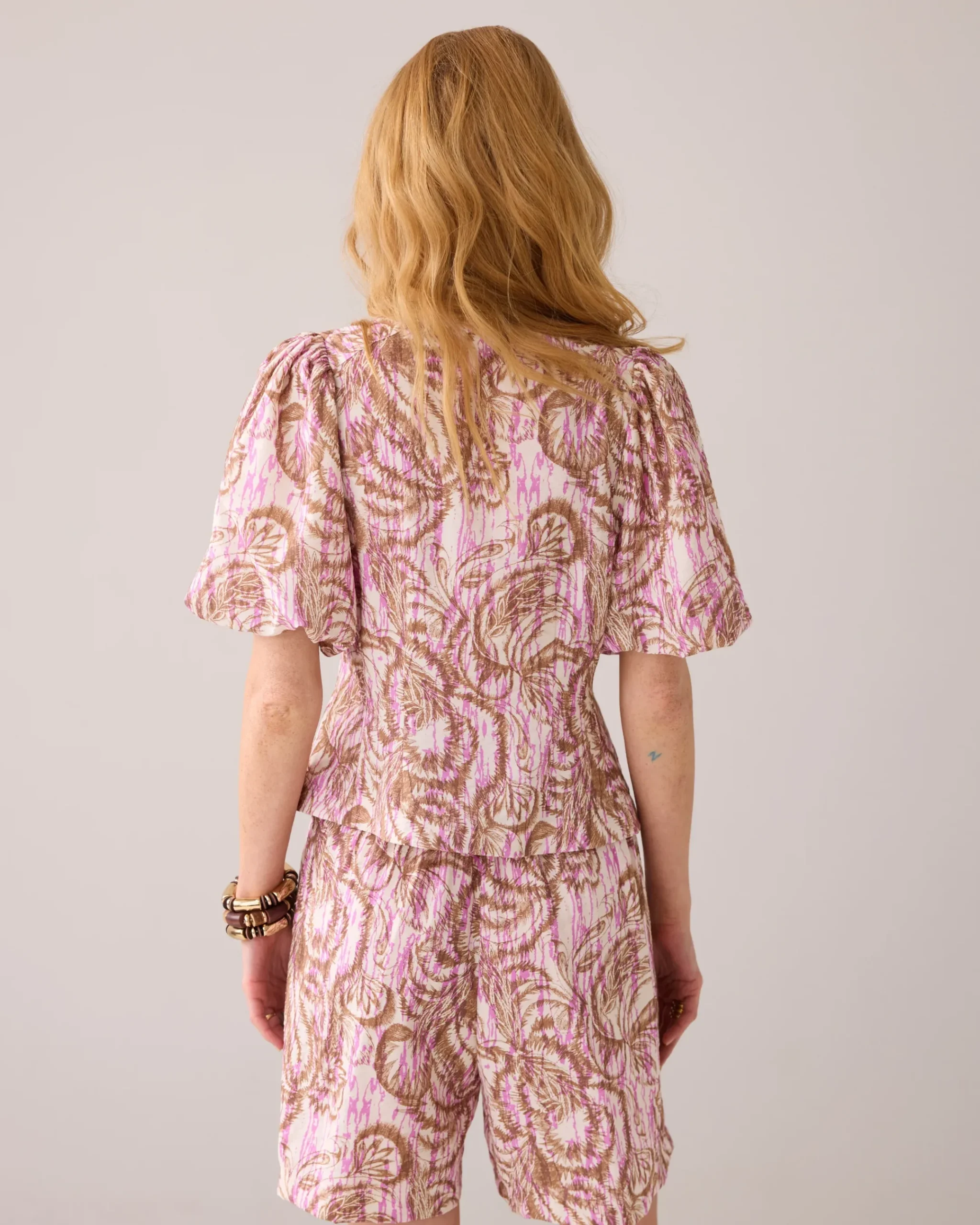 This slightly fitted blouse jacket features an allover print in the collection’s colours. The jacket has a cord bow fastening and lined short sleeves.