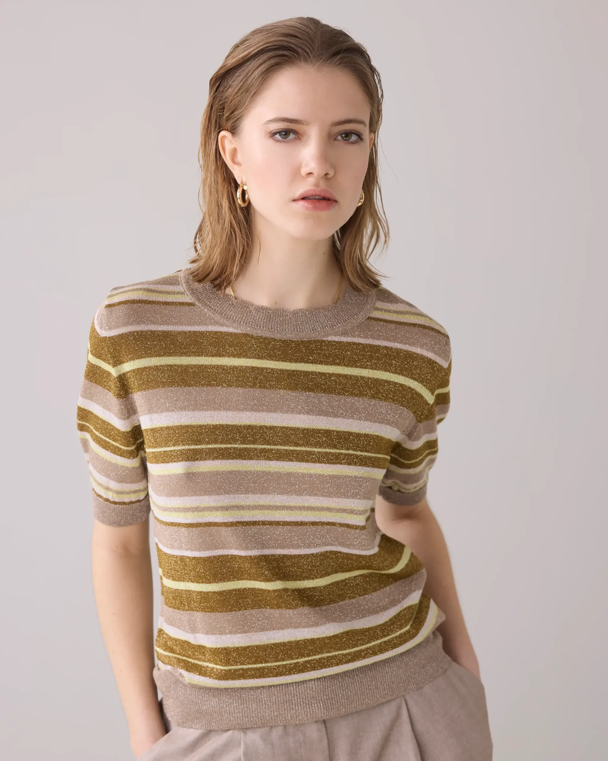 This fine striped jumper with a straight fit is knitted in a lurex yarn. The jumper has short sleeves and a round neckline with scalloped edge.