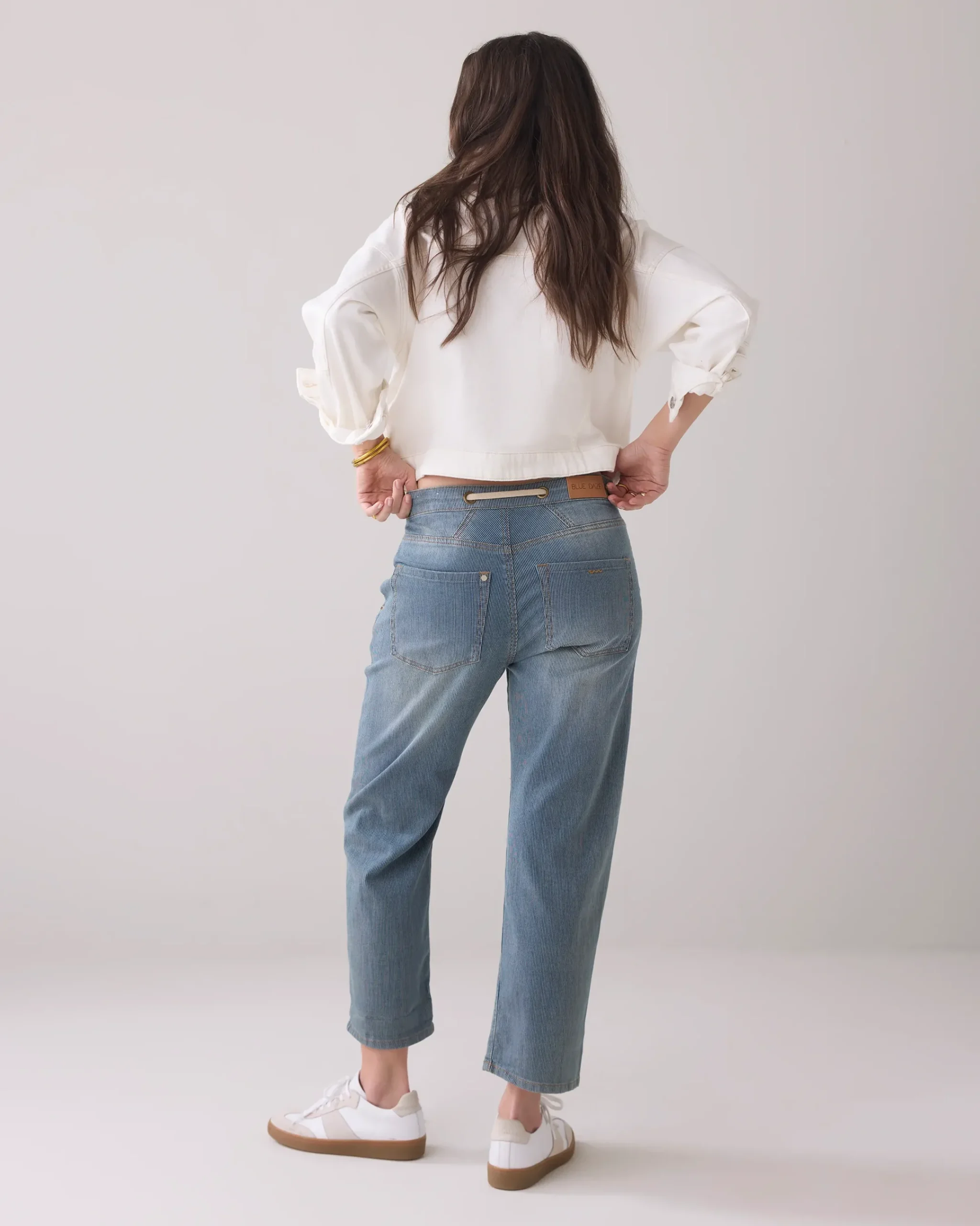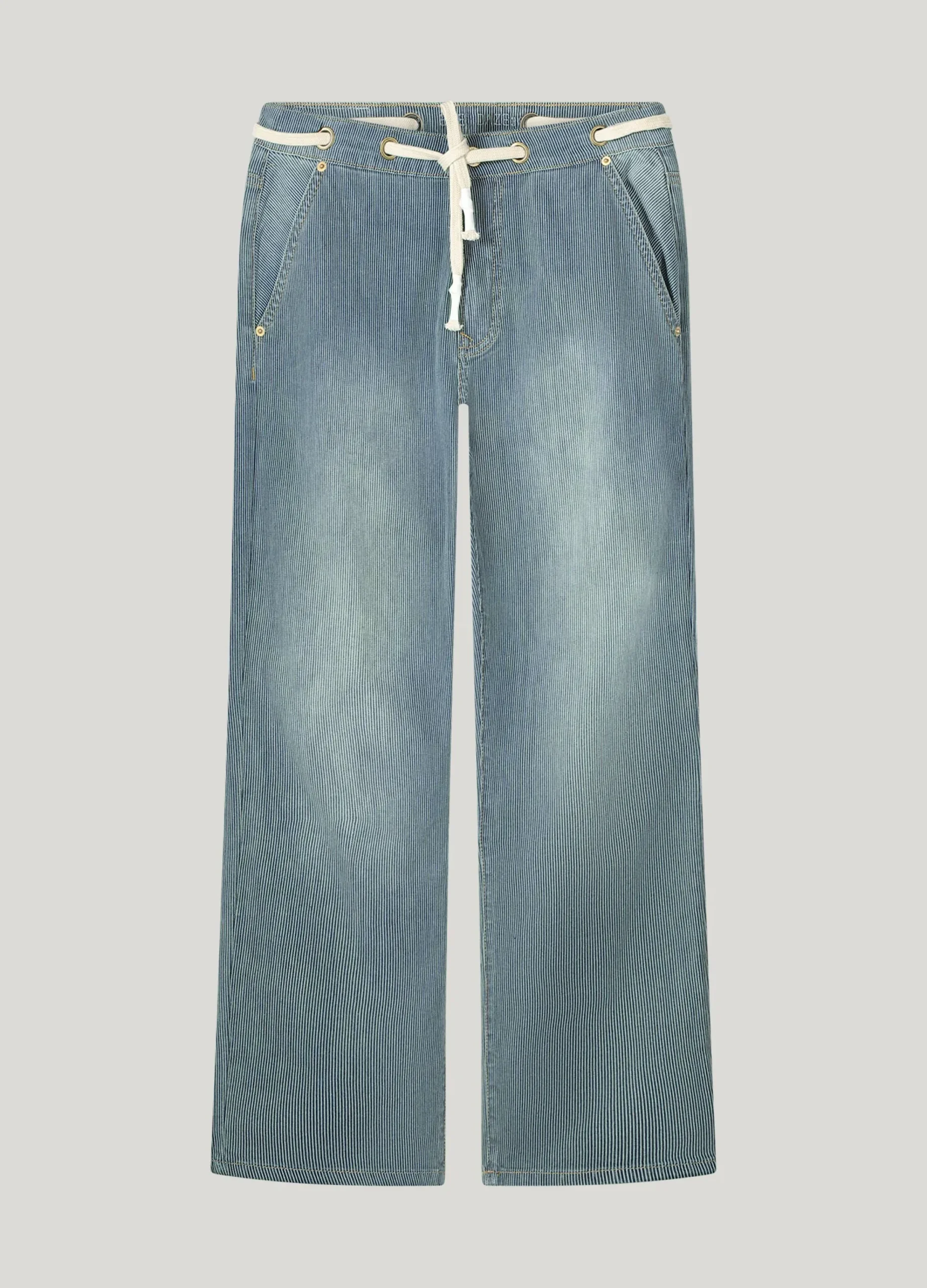 These loose-fit jeans are made of soft stretch denim with woven-in stripe pattern. The trousers have a mid-rise waist with eyelets and drawstring detail.