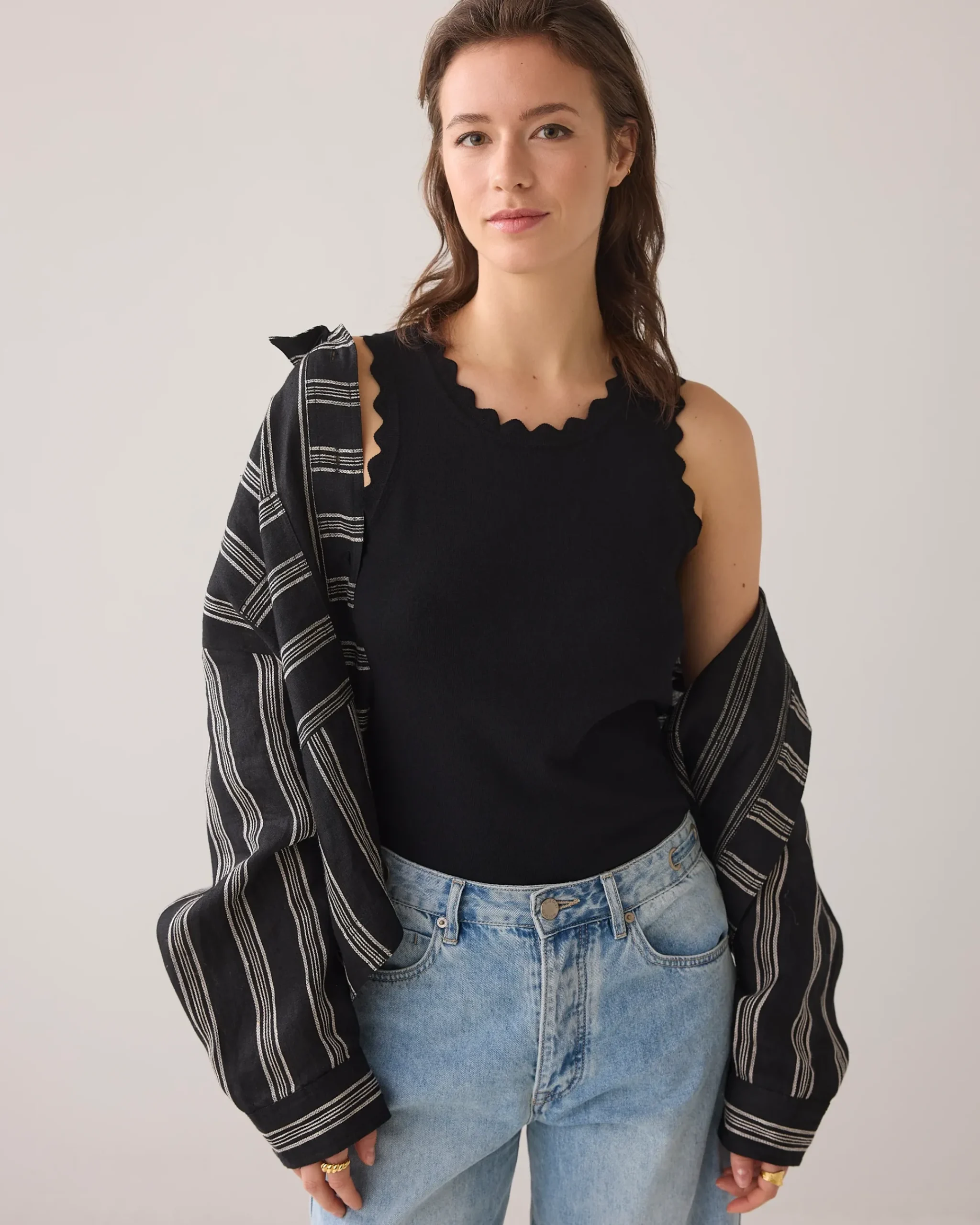This fine-knit singlet has a straight fit and is made of extremely soft viscose polyamide yarn. The scalloped trim along the neckline and armholes adds a sophisticated touch to the design.