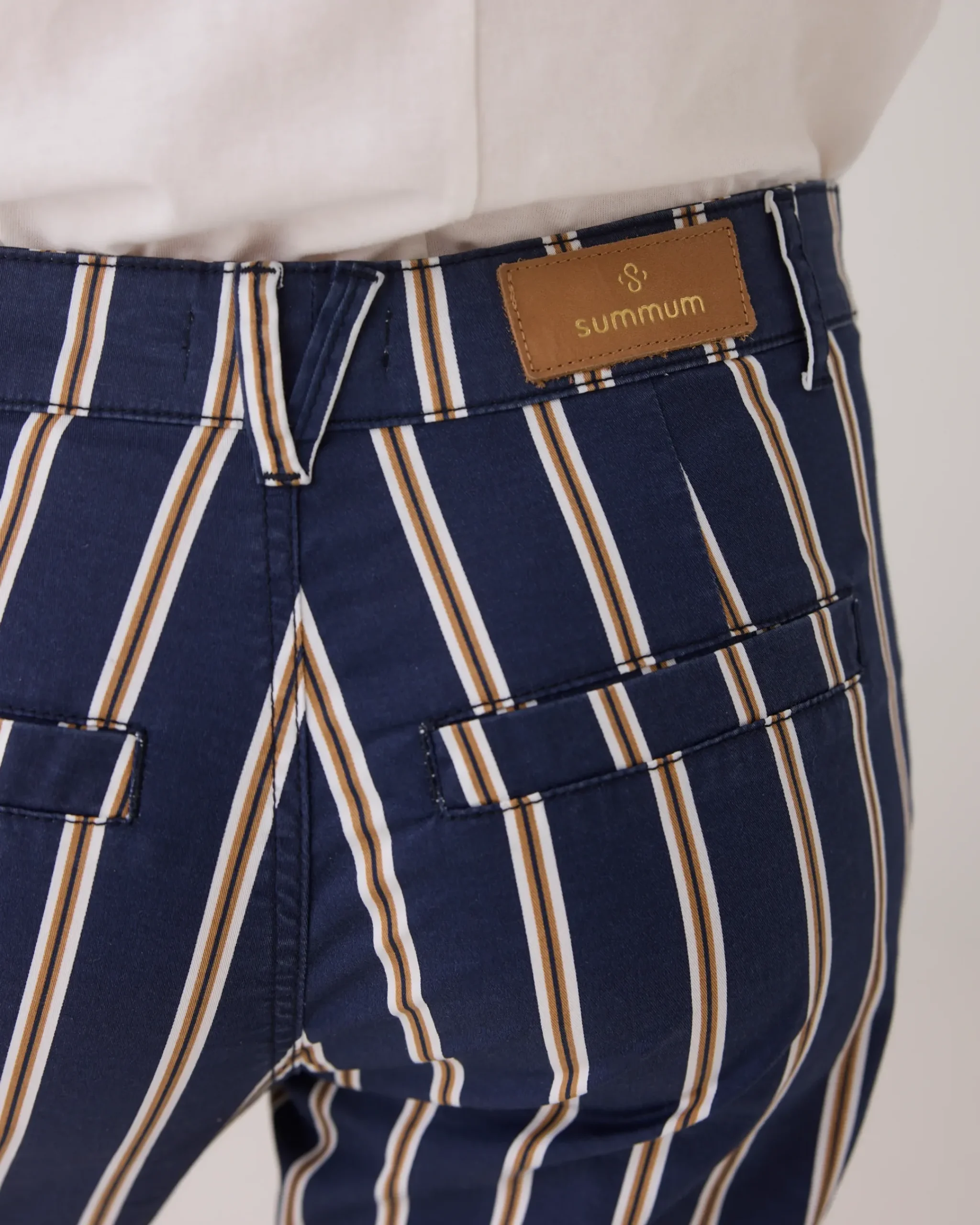 These tapered trousers feature a printed stripe and are made of a comfortable cotton-elastane blend. The stitched workerstyle pockets and fake welt pockets at the back add a cool touch.