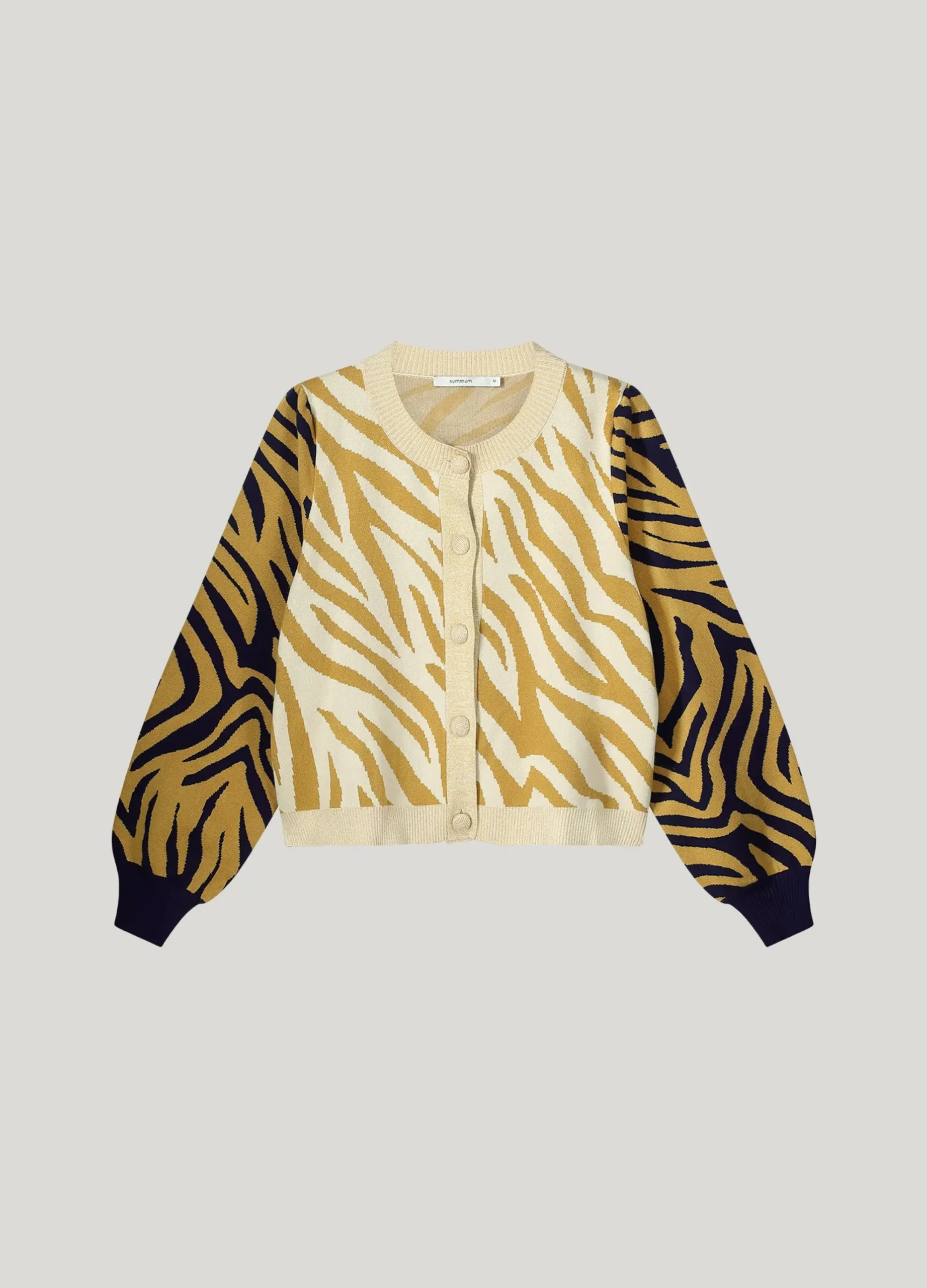 This jacquard cardigan features a striking zebra pattern and is knitted in a compact viscose-polyamide blend. The cardigan has balloon sleeves and lurex details at the neckline and a button fastening.
