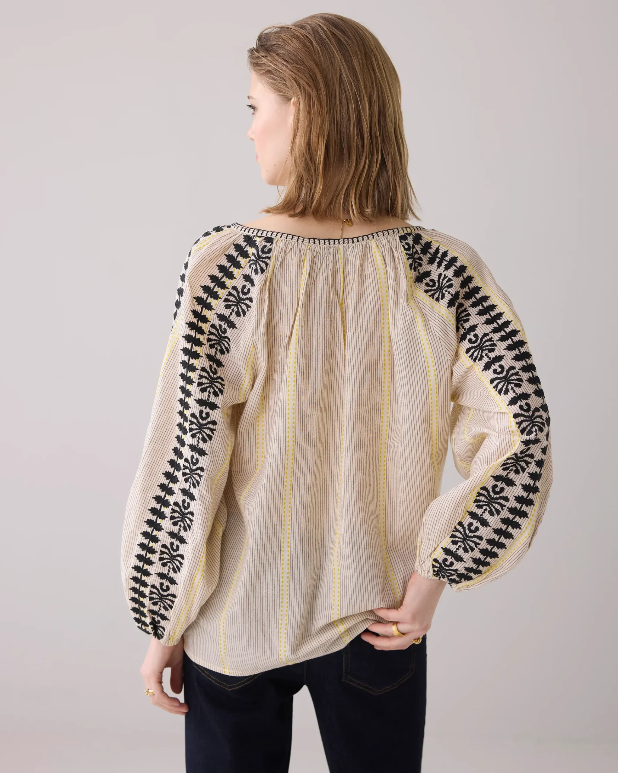 Airy bohemian top with stripe pattern and floral embroidery. Made of cotton with viscose for a nice fit. The round neckline is finished with a veston stitch and a slit with drawstring fastening.