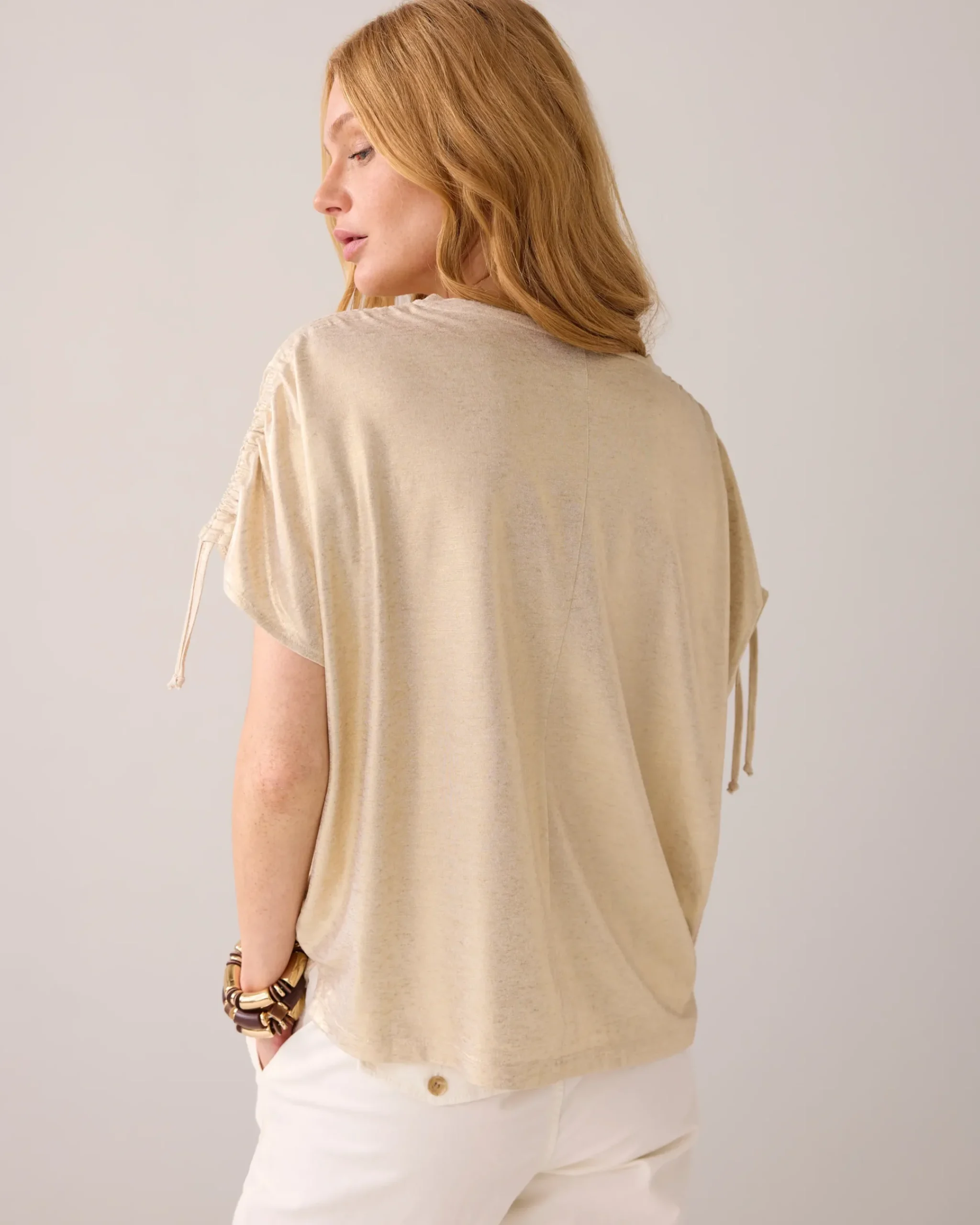 This metallic top is made of a linen-viscose jersey with shiny foil coating. Thanks to the adjustable cord on the shoulder, you can opt for a sleeve or sleeveless look.