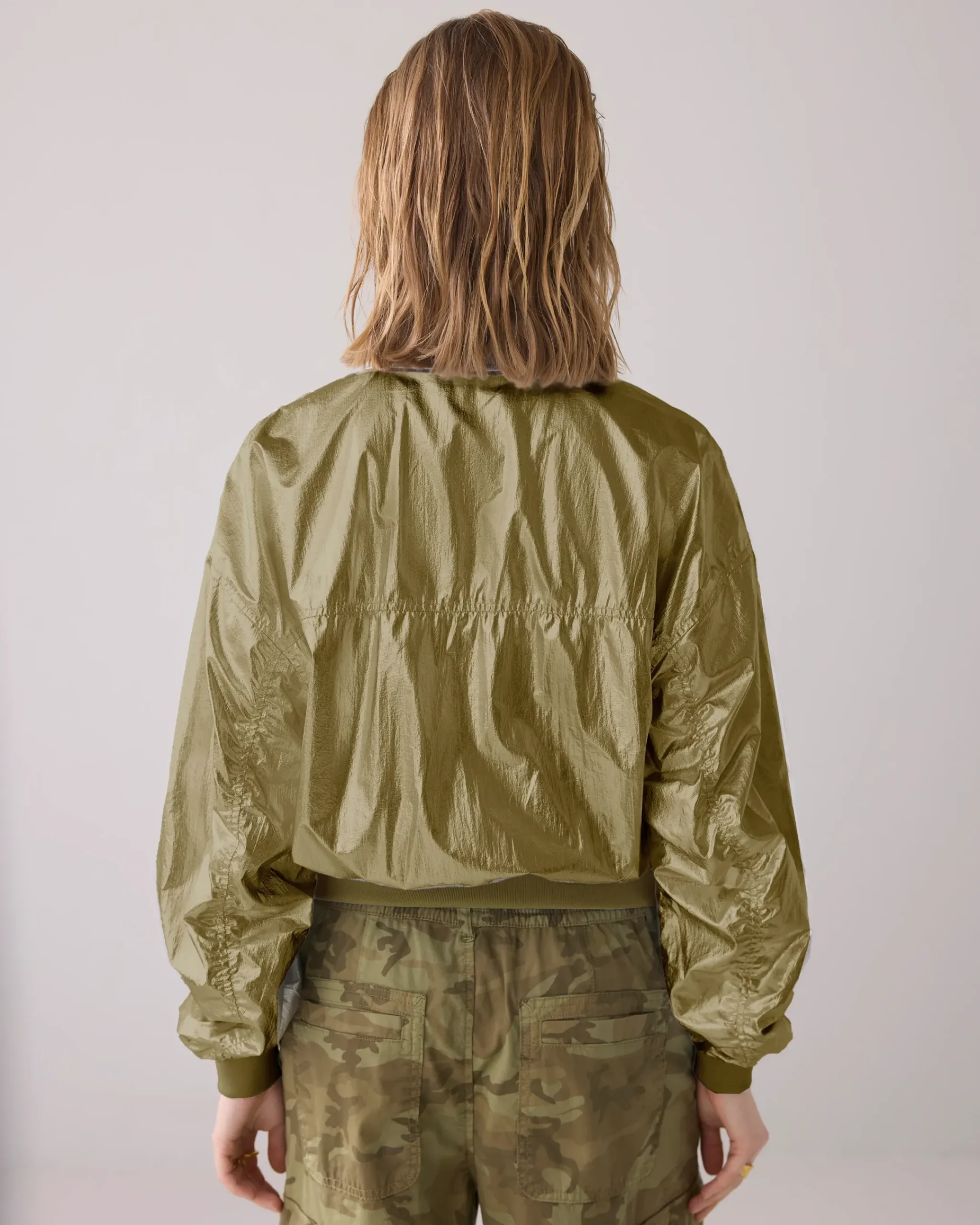 bomber jacket in a shiny metallic fabric. The jacket has ribbed cuffs, hem and collar.
