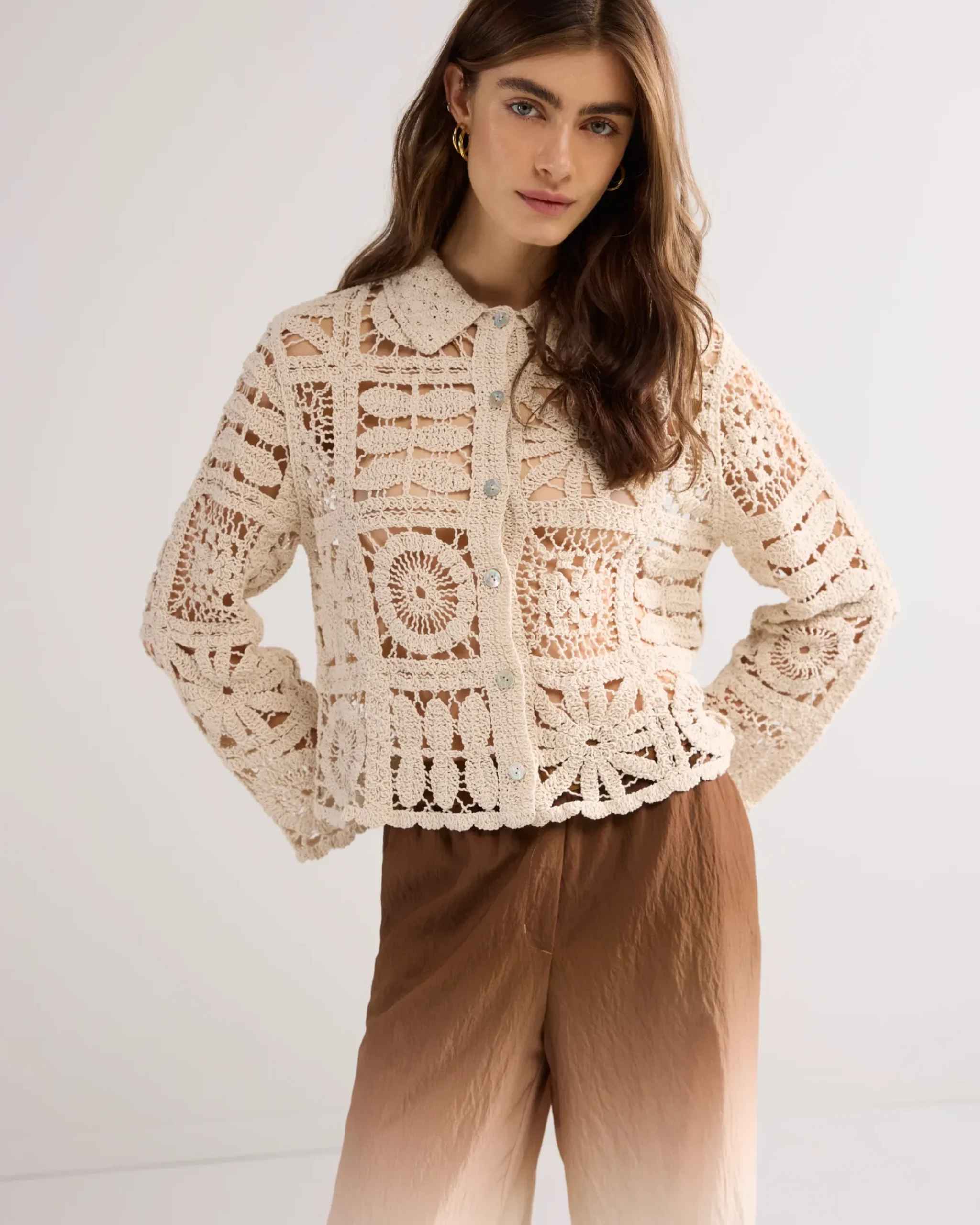 This crochet cardigan of various crochet patterns has a straight fit and is made of 100% cotton. The top has a mother-of-pearl button fastening.
