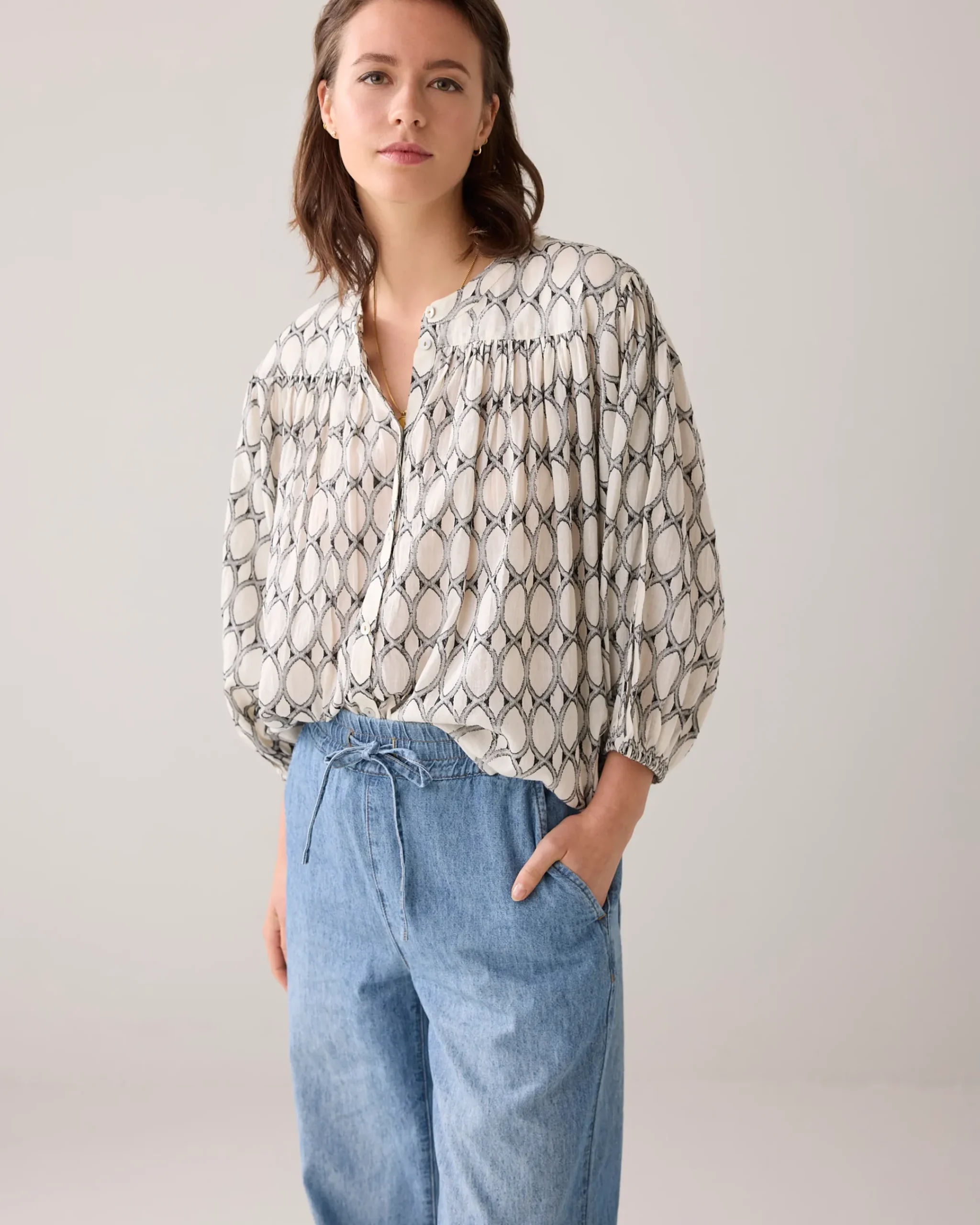 This oversized blouse has an allover jacquard woven-in infinity pattern and a subtle micro stripe with silver lurex thread. It features a rounded bottom, batwing sleeves and a ruched detail at the back.