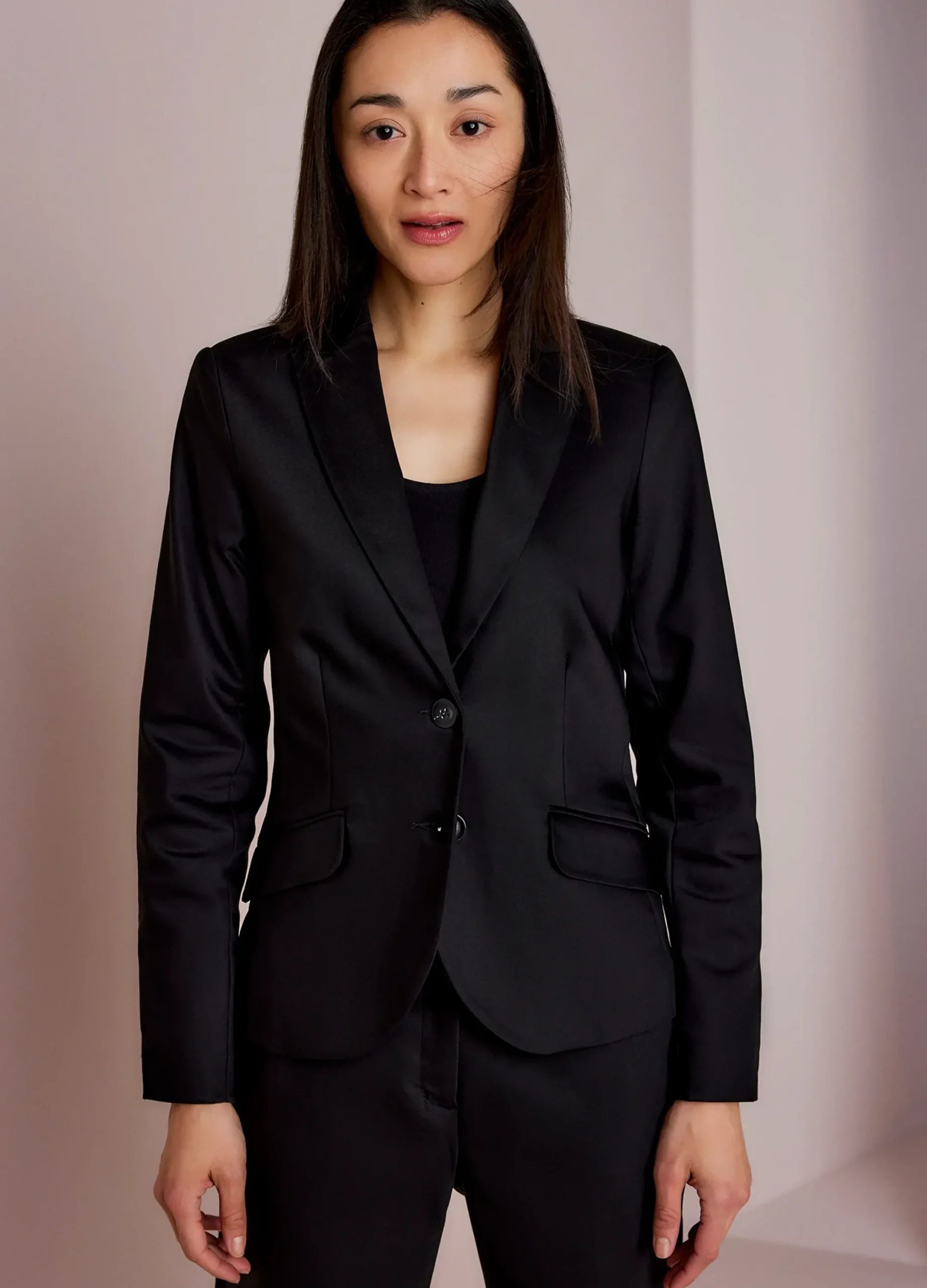 This blazer designed in a comfortable punto milano fabric. The fitted blazer has a lapel collar and piped pockets with flap.