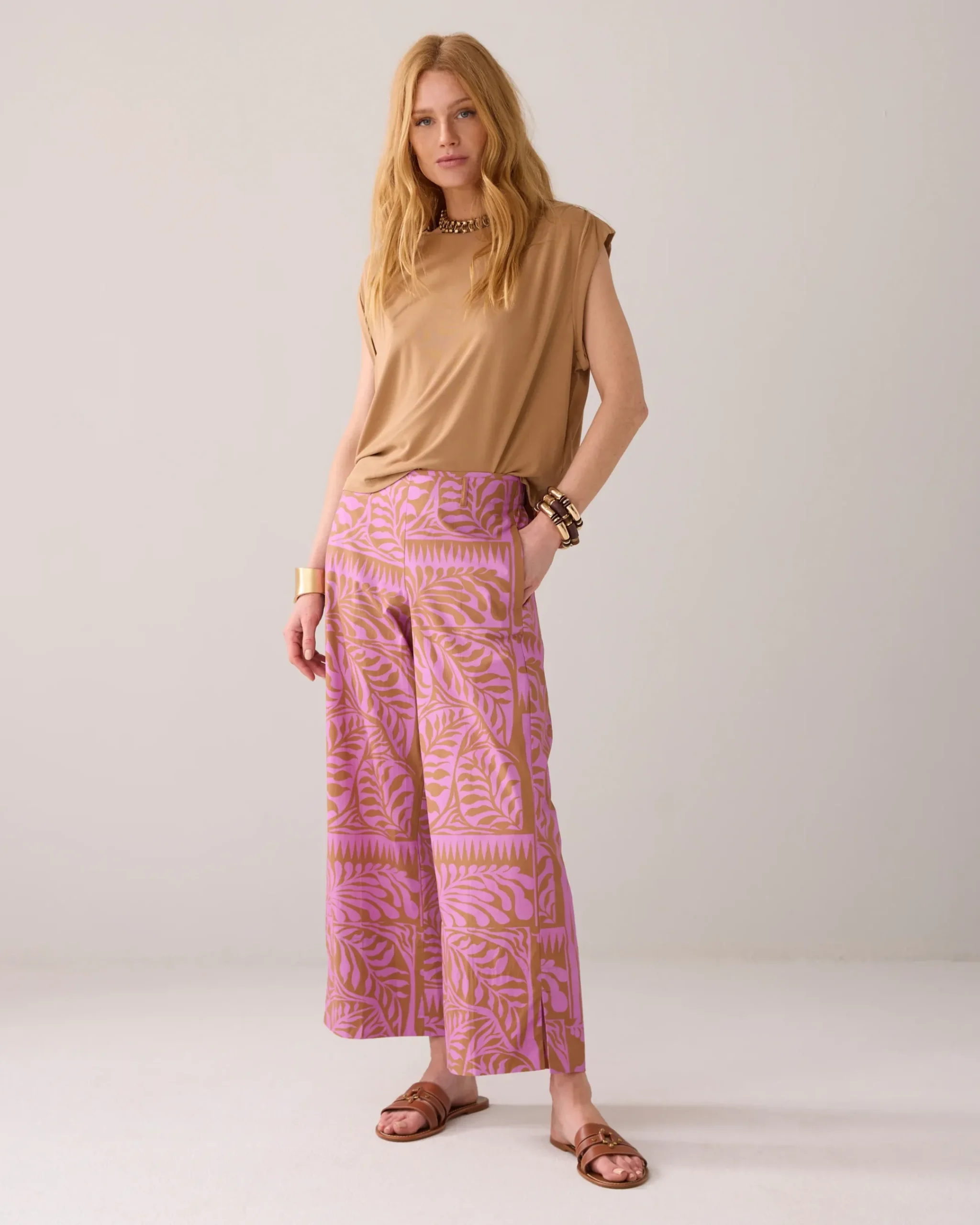 These two-tone 7/8th length trousers have a wide turn-up with slit. The trousers have an elasticated waistband at the back and smooth waistband at the front. Perfect for pairing with the matching top with twisted neckline.