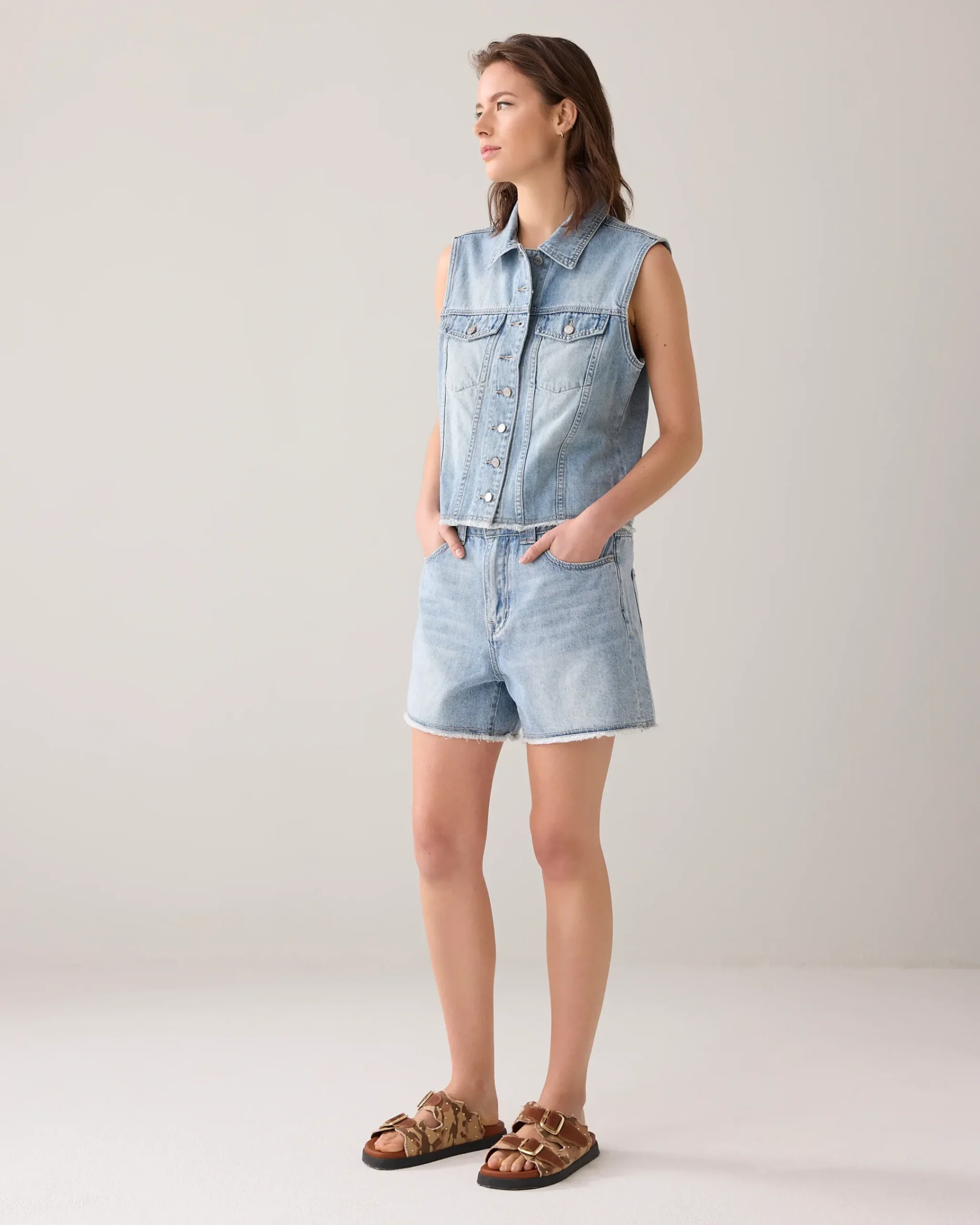 This close-fitting gilet is made of lightly bleached denim and has a vintage look. The raw edge bottom gives this gilet a cool touch.