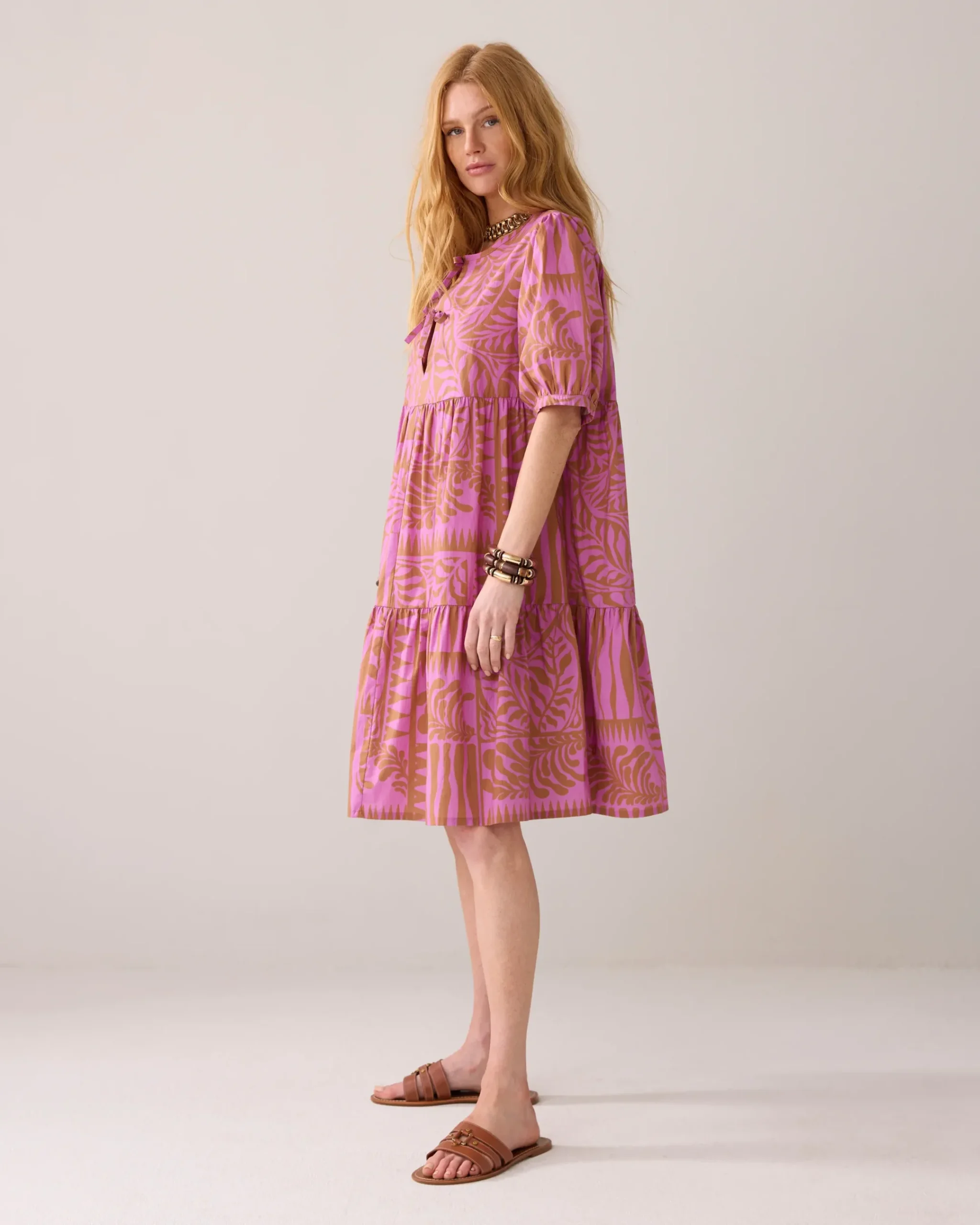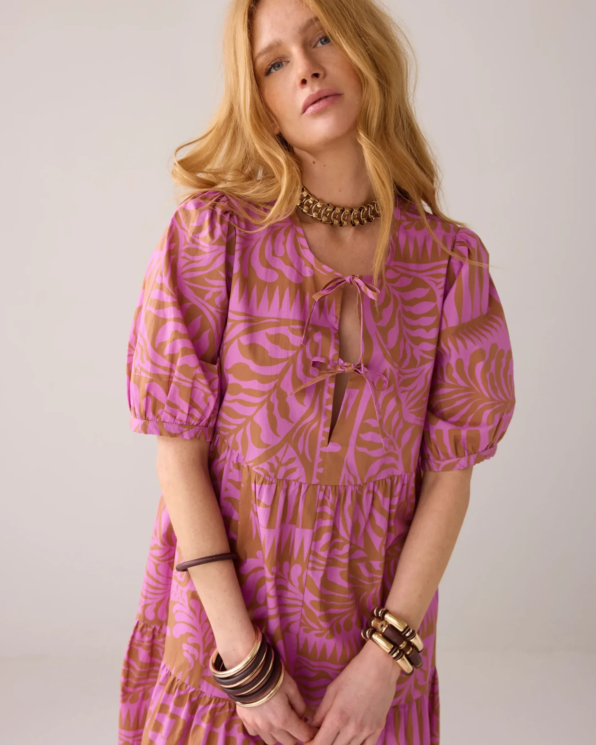 This knee-length dress has a loose fit and playful strips. The dress is designed with short puff sleeves and a round neckline with a drawstring fastening at the front.
