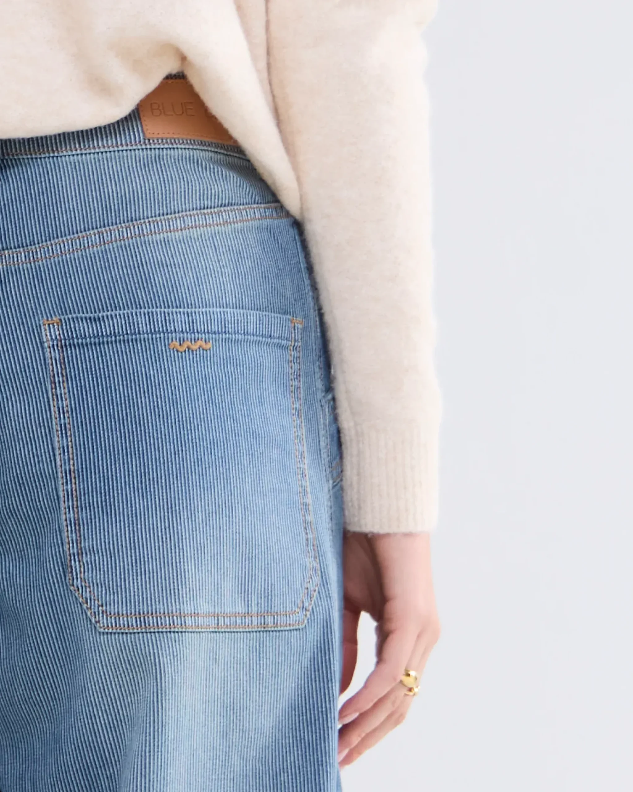 Cargo jeans with a striped design and straight legs with stitching on the front panel. The jeans are made of a light stretch fabric.