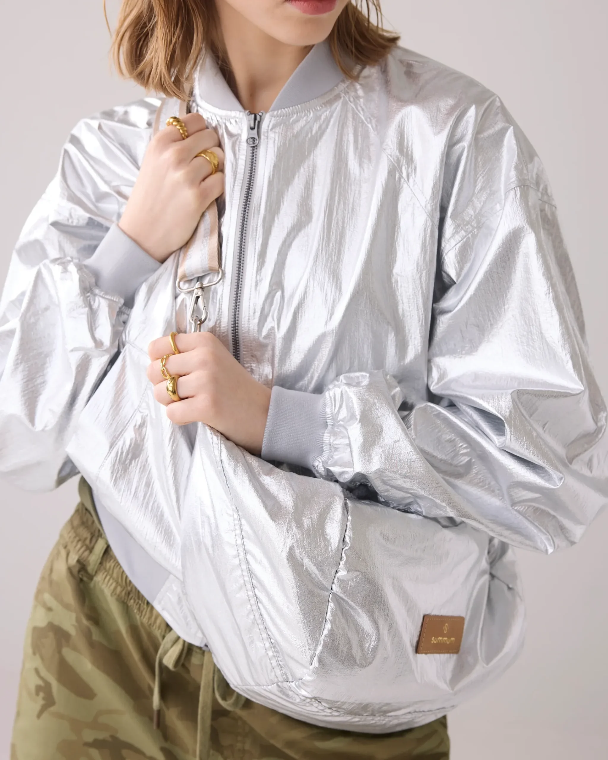 This crossbody bag is made of a shiny metallic fabric and has a zip fastening. The bag is lined and has an inner zipped pocket for extra storage space.