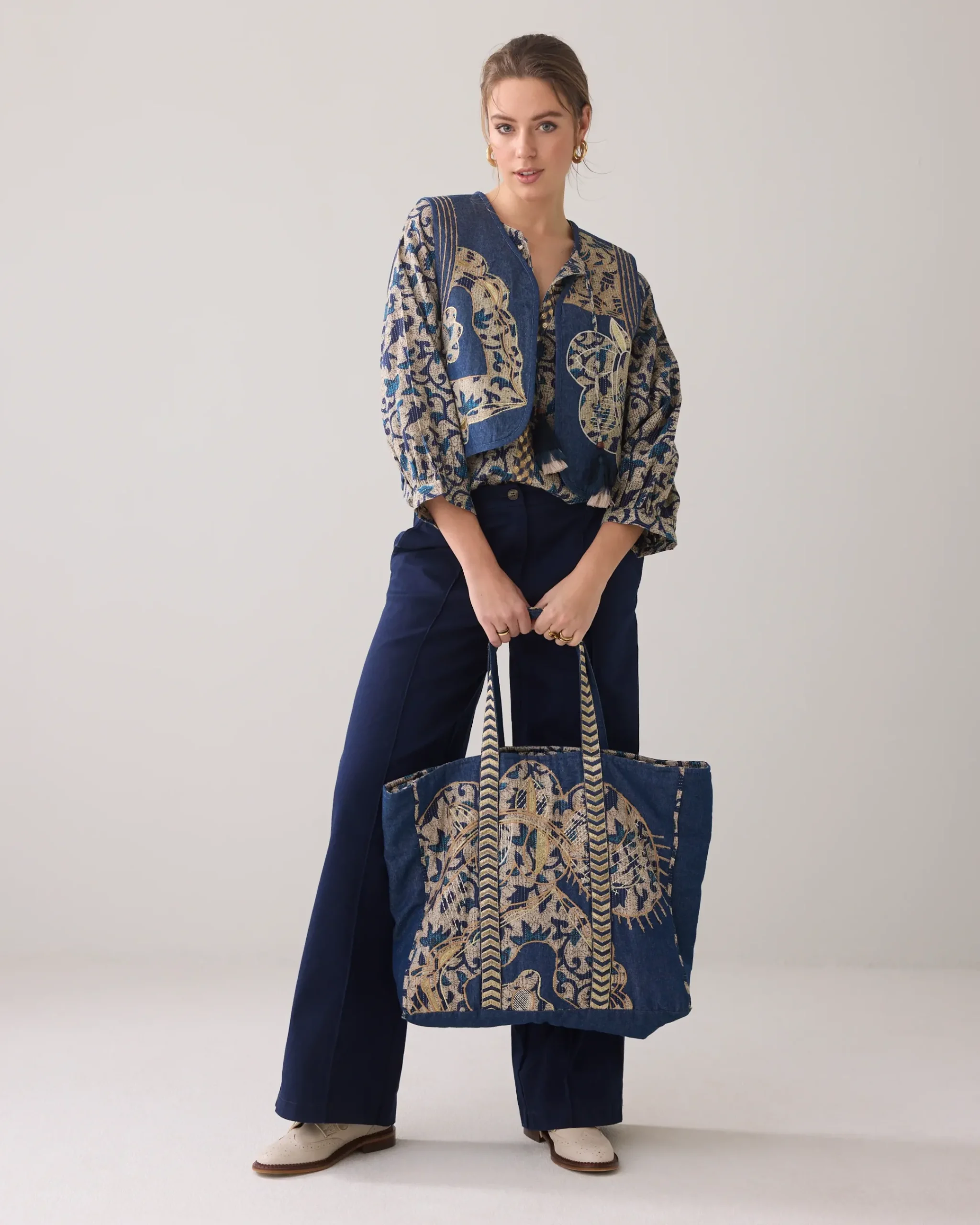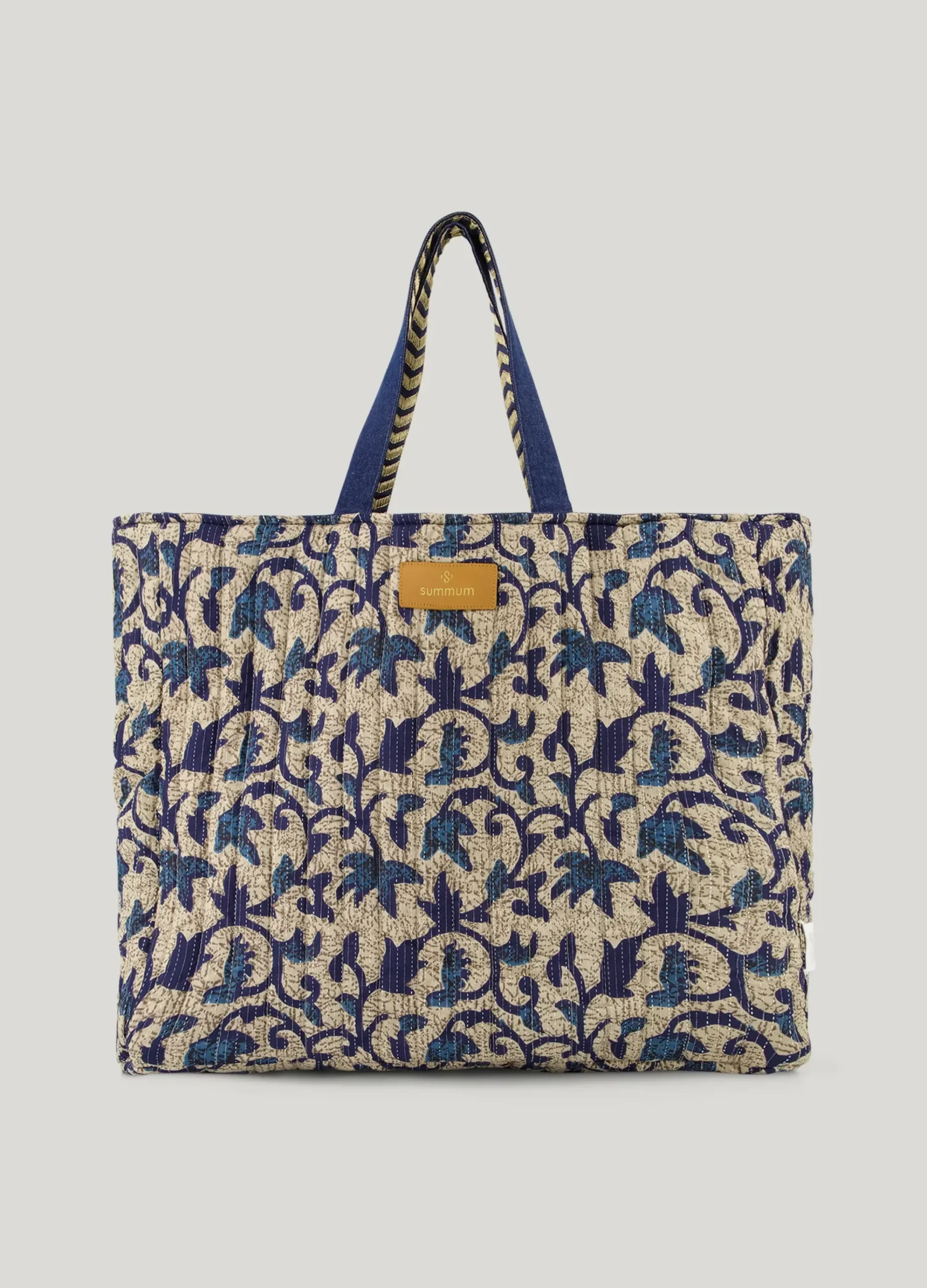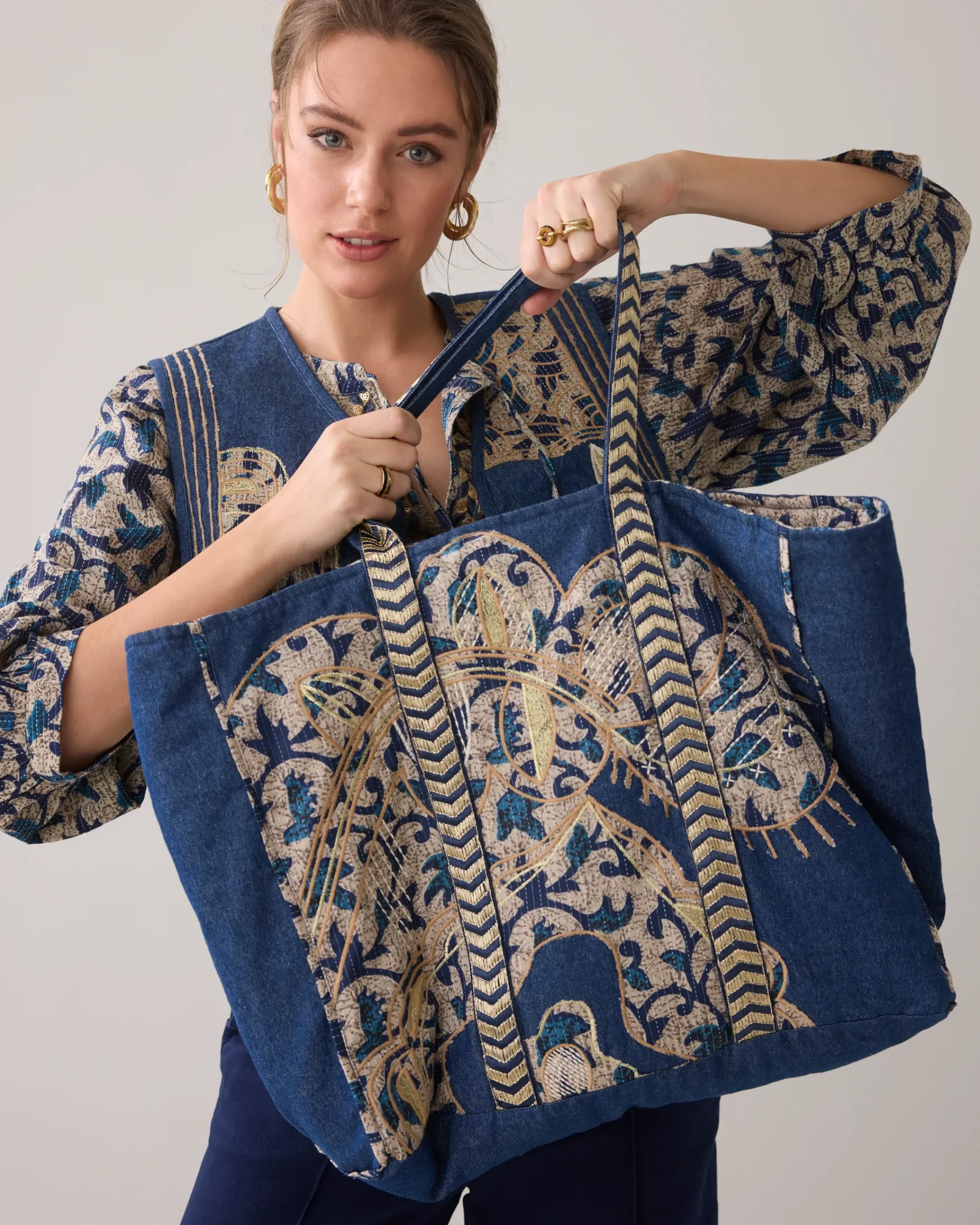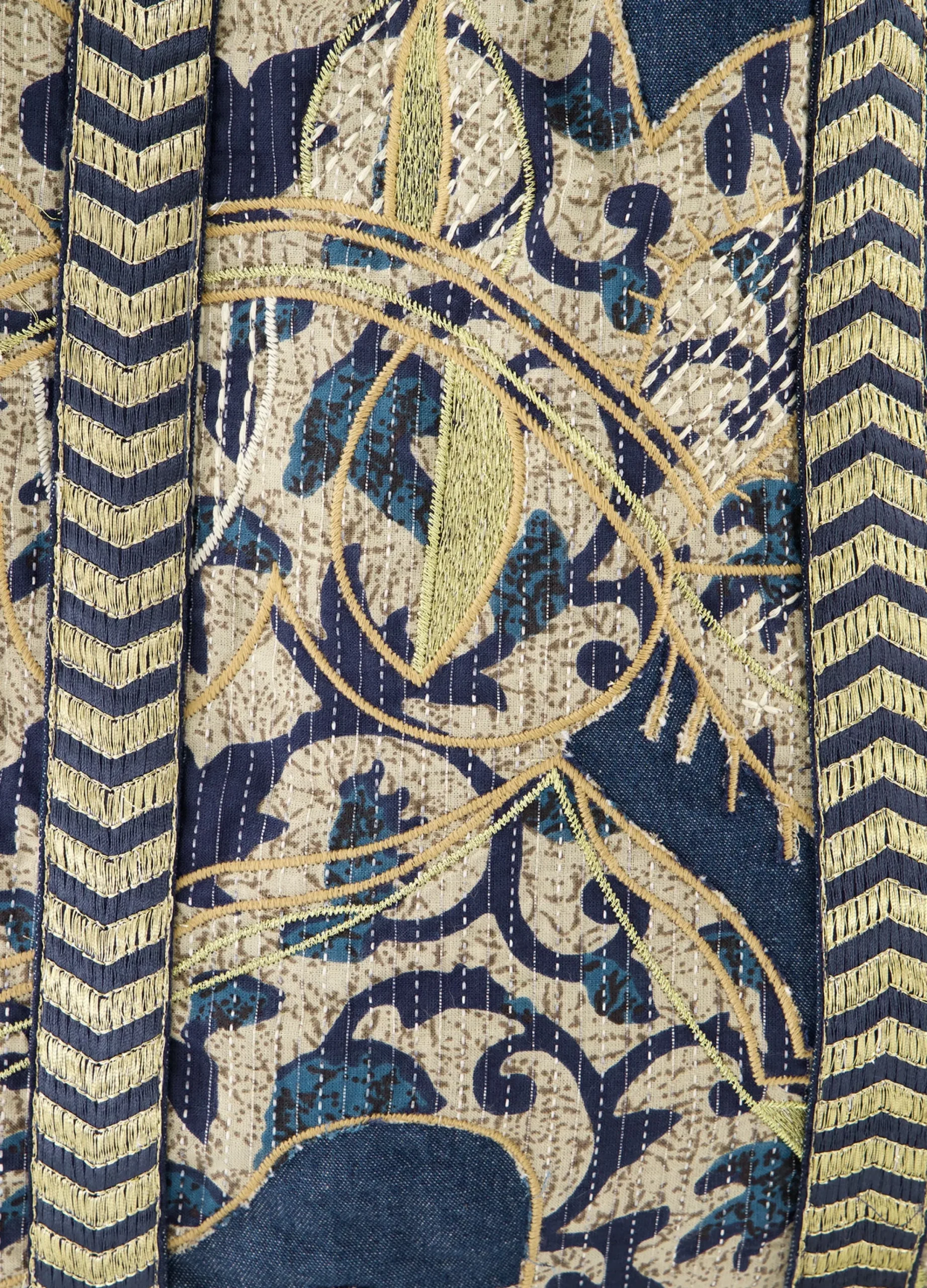 This reversible tote bag is made of cotton indigo denim with a patchwork floral pattern, block print and embroidery with lurex details. The bag is reversible and can be worn on both sides. Matches the Reversible Kimono Jacket (1s1225).
