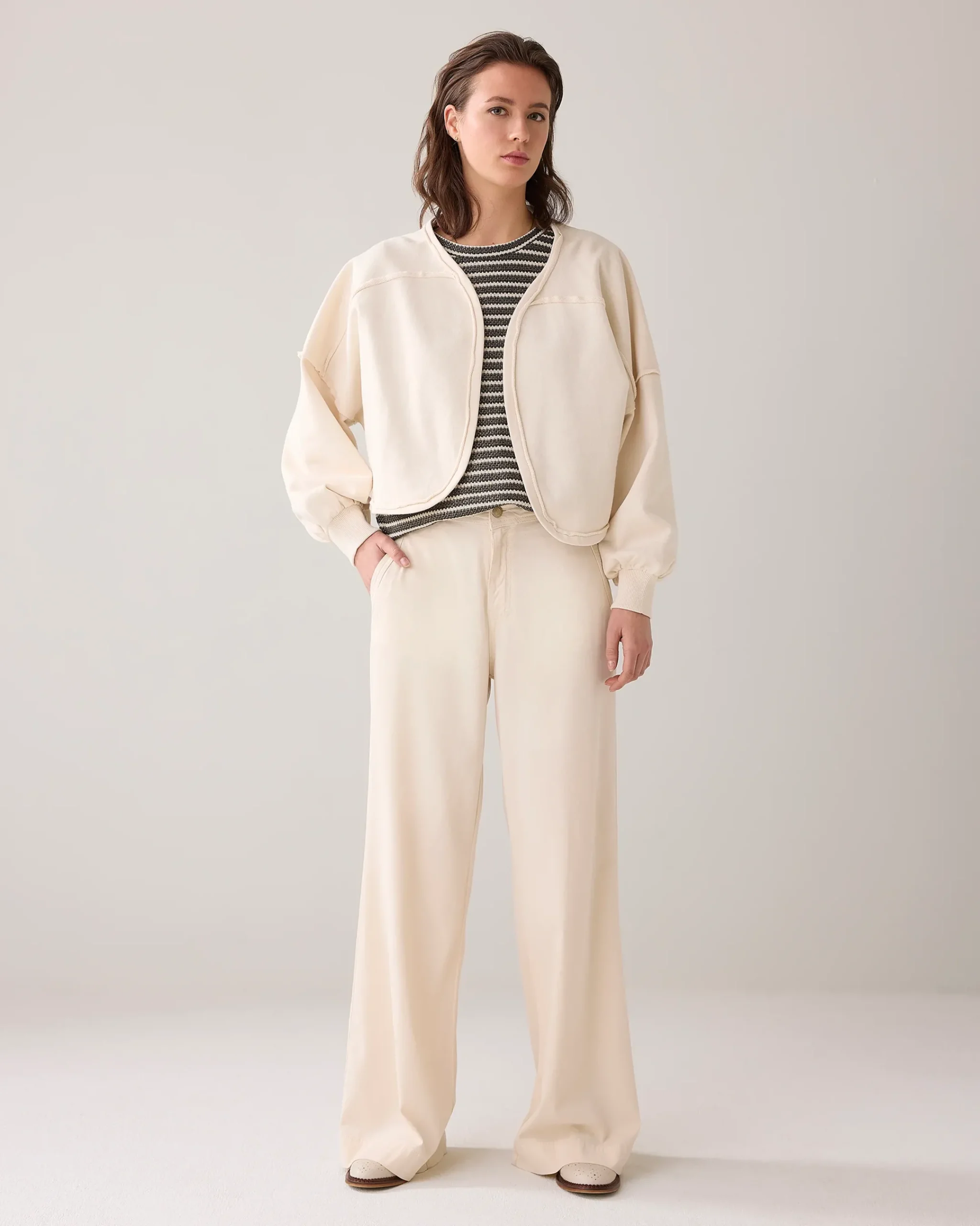 This open cropped sweat jacket has an oversized fit and a shorter back. The raw edge details and inside-out seams give it a cool look.