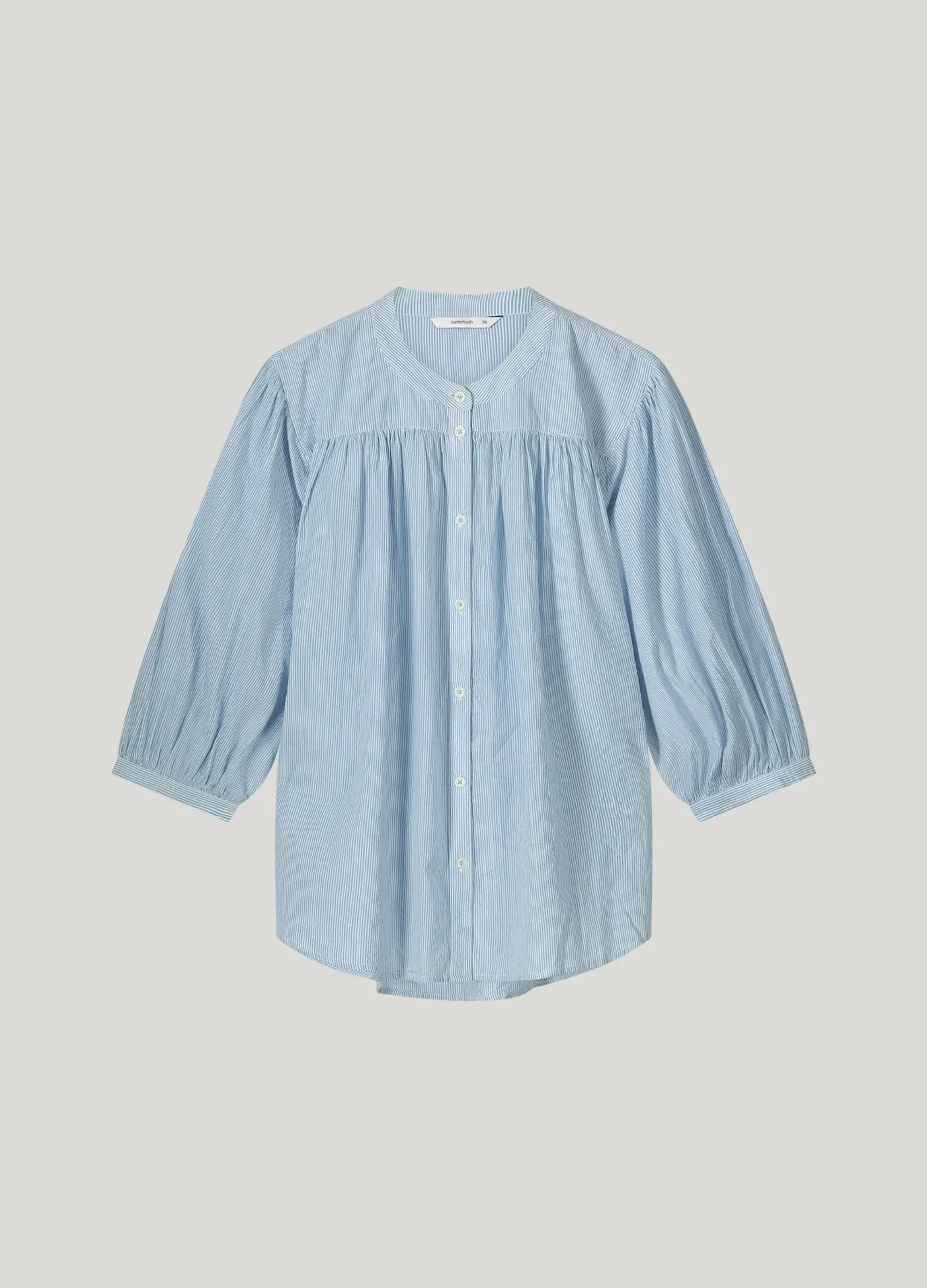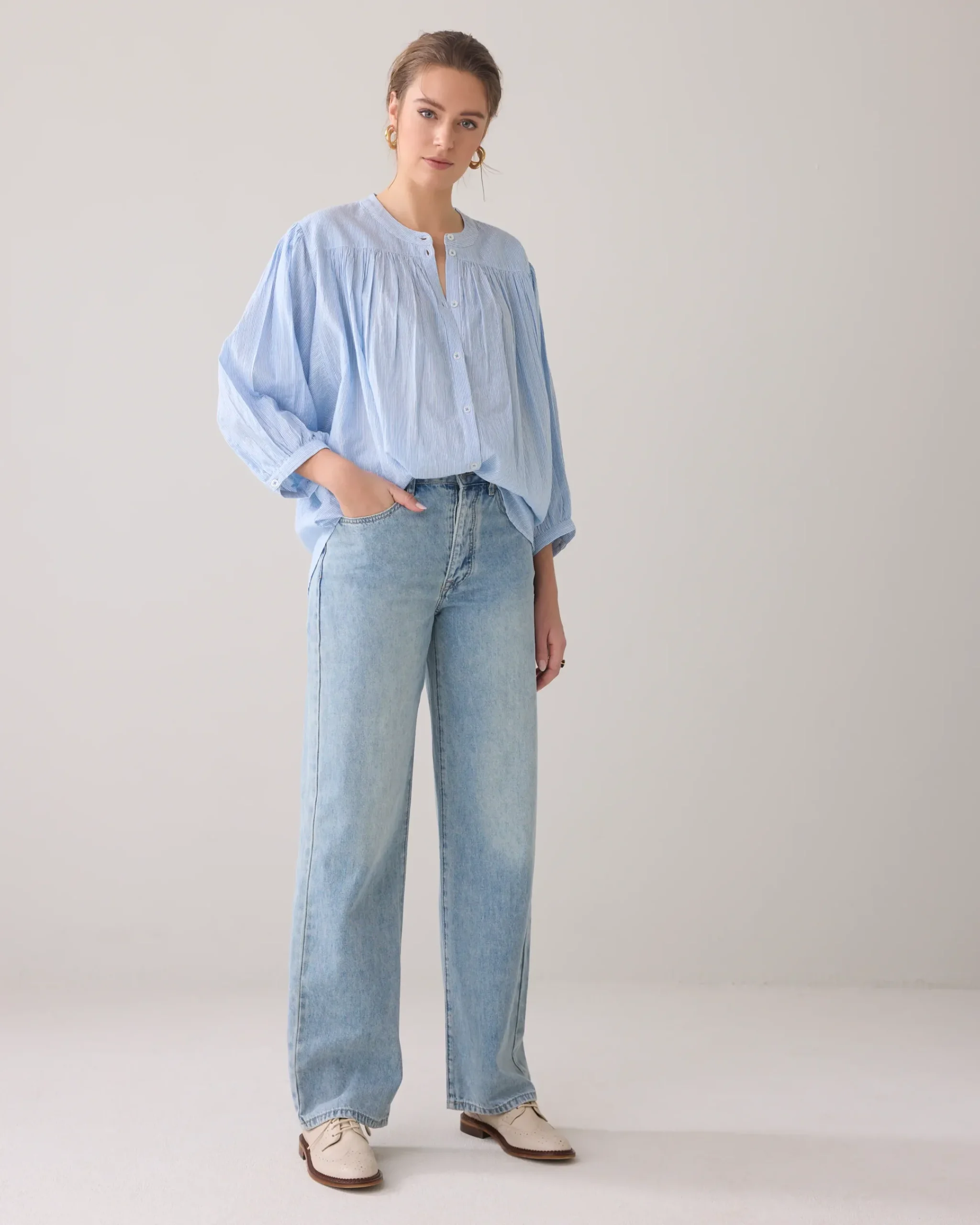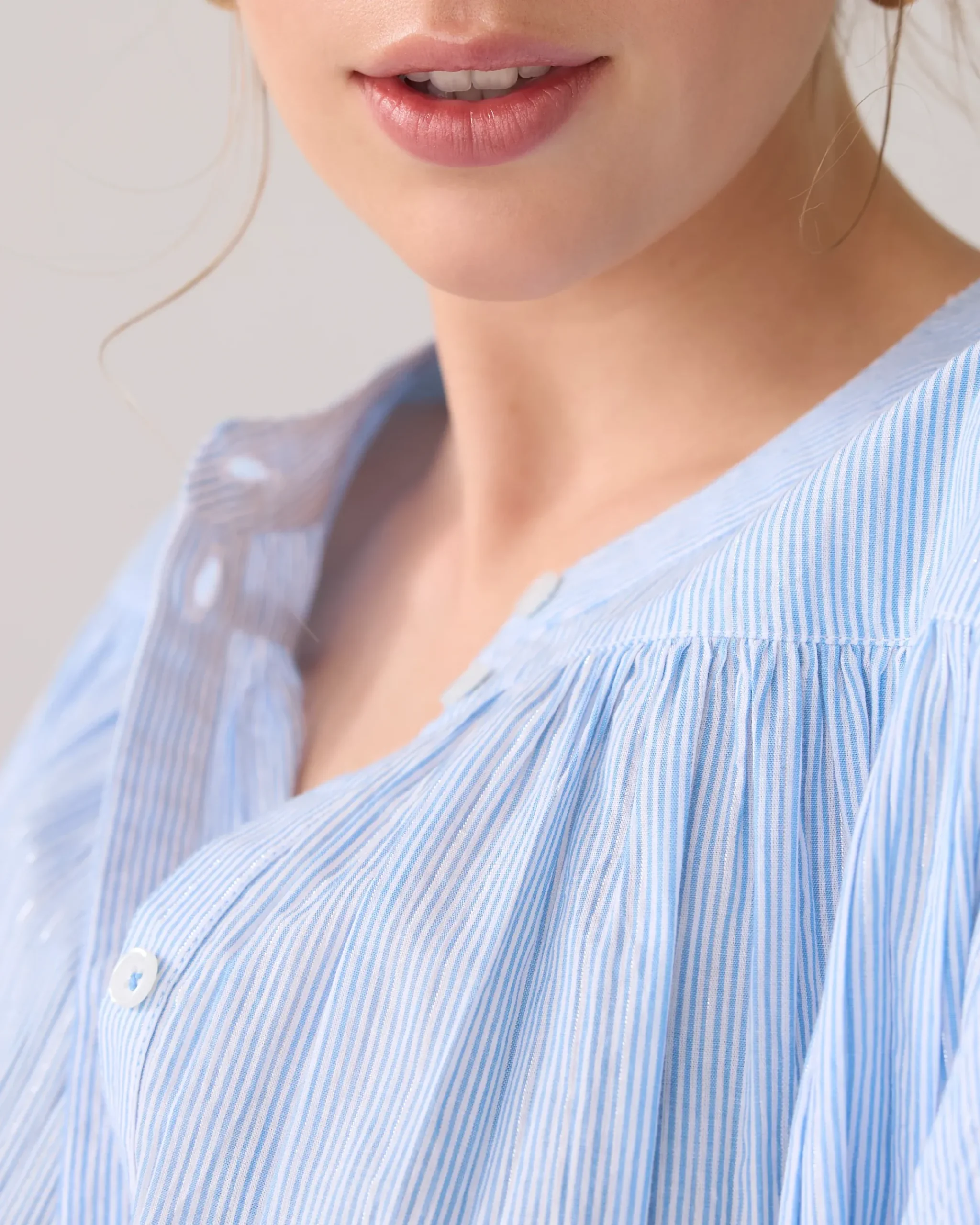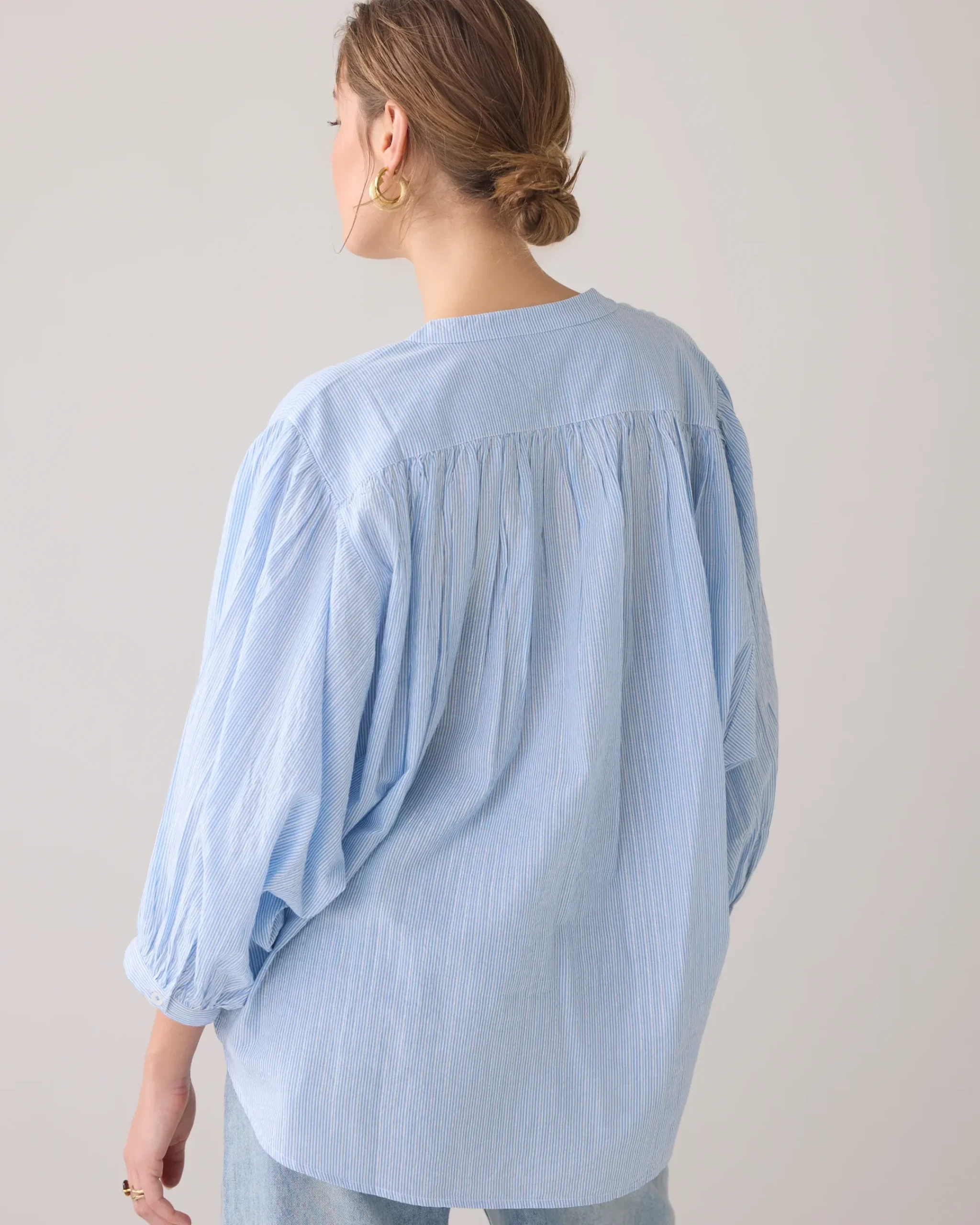 This oversized blouse has a subtle micro stripe with a silver lurex yarn for an elegant sheen. It features a rounded bottom, batwing sleeves and a ruched detail at the back.