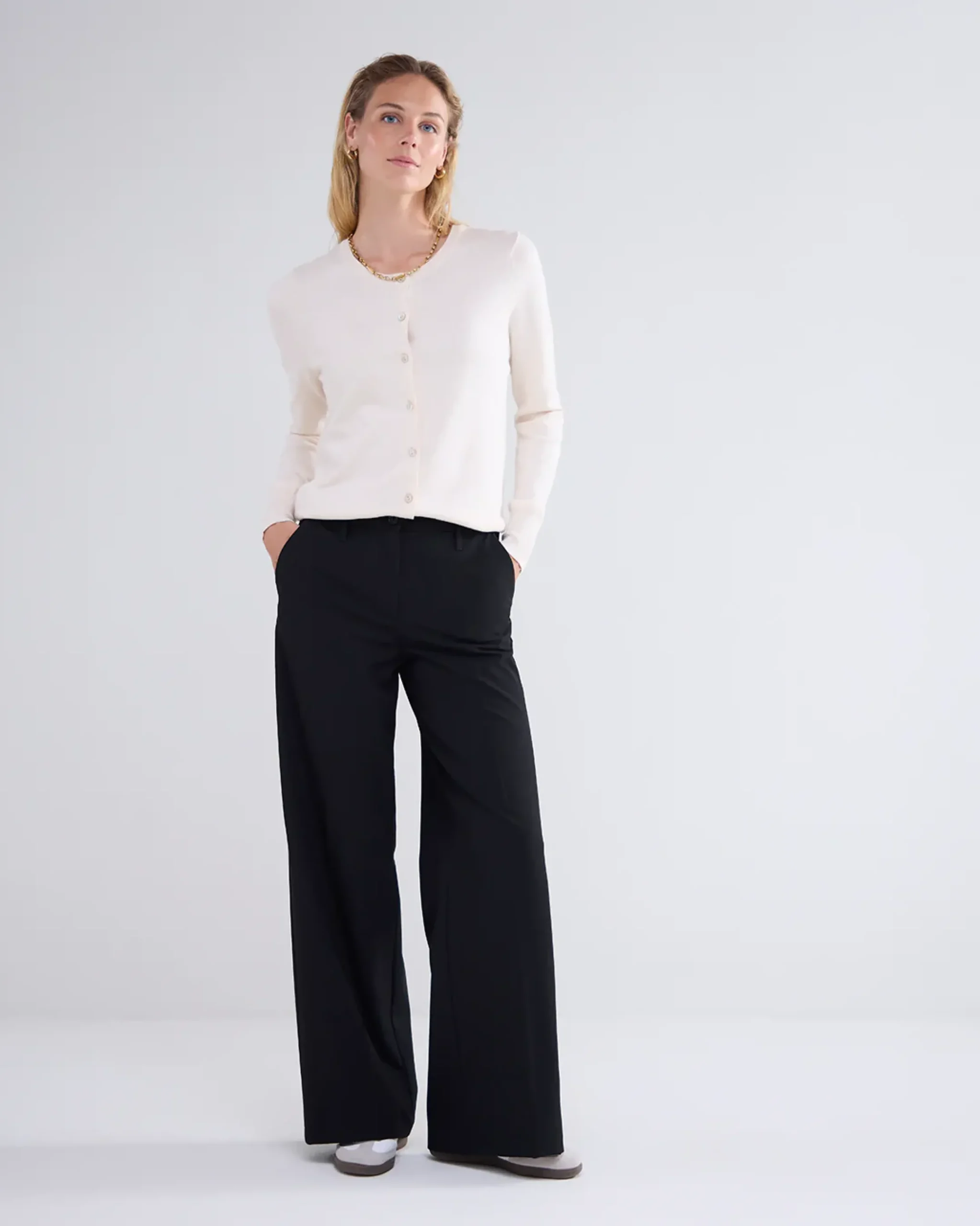 Short cardigan with a round neck and button fastening. The cardigan has a regular fit and is knitted in a compact viscose polyamide yarn.