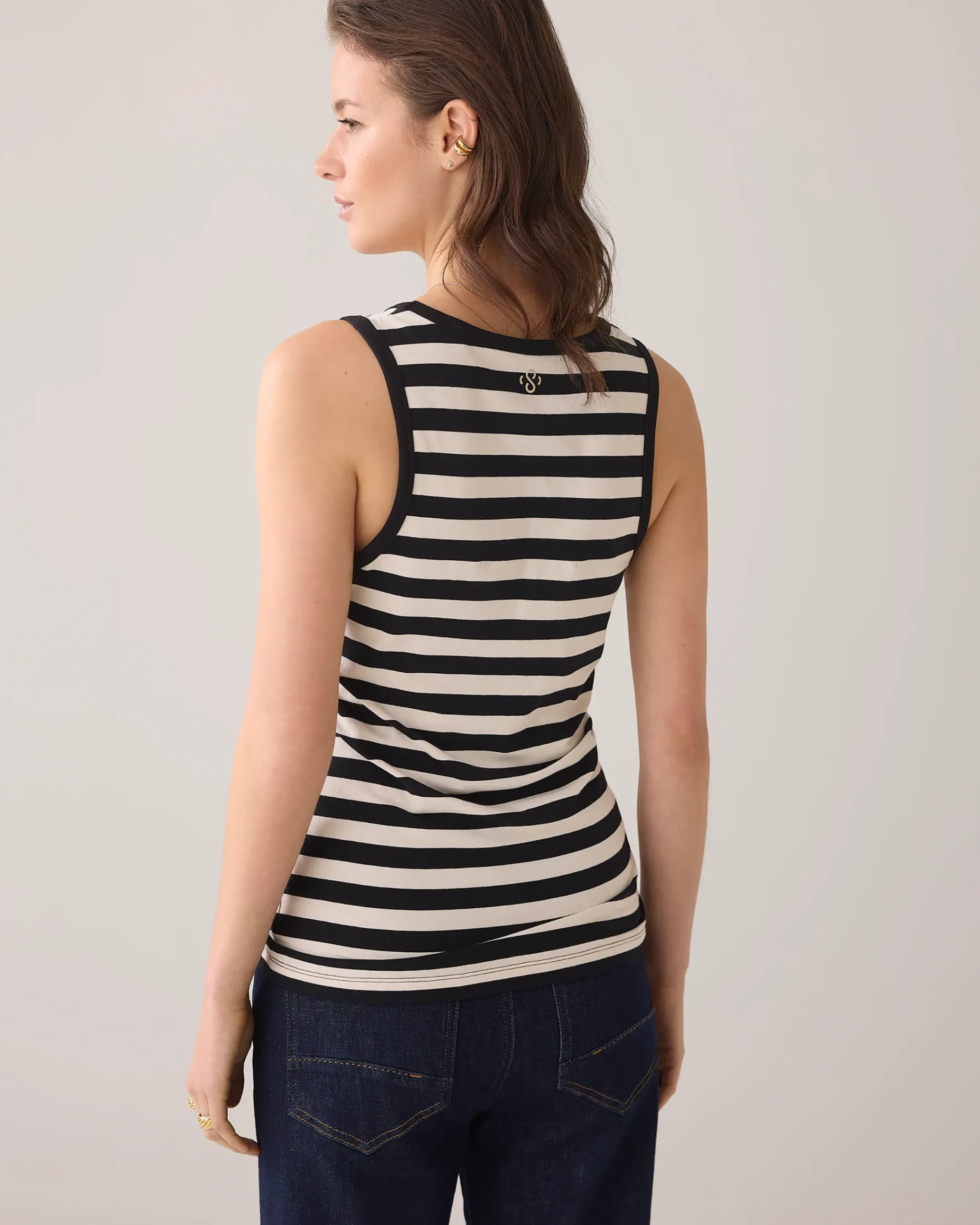 This striped tank top has a tight fit and is made of comfortable cotton-elastane blend. The knitted-in stripe pattern is combined with black plain finishes along the neckline and armholes.