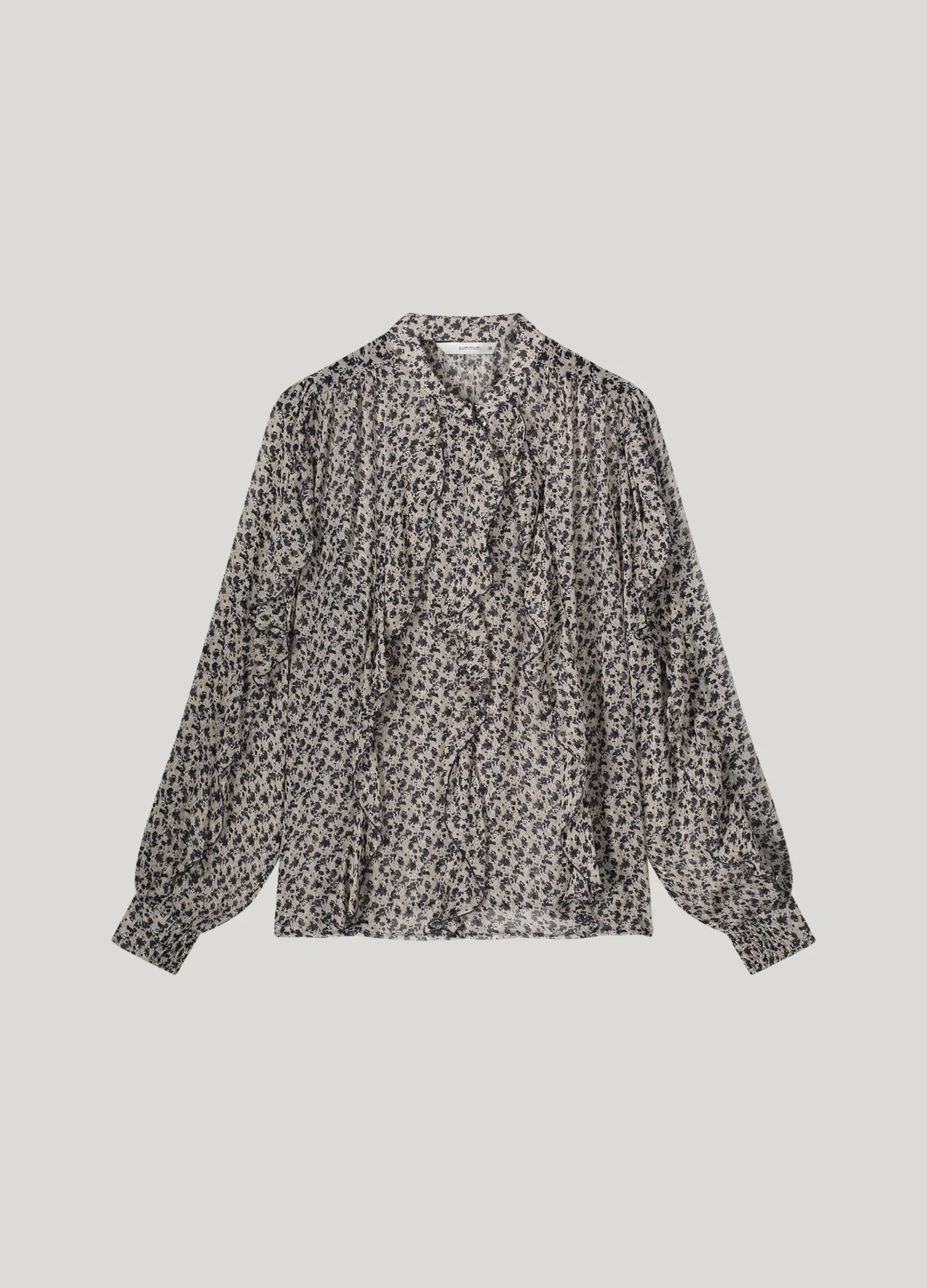 This sheer top with petit-fleur print has eye-catching ruffles along the front and back and across the sleeves. The top has a stand-up collar with a slit and buttons at the front.