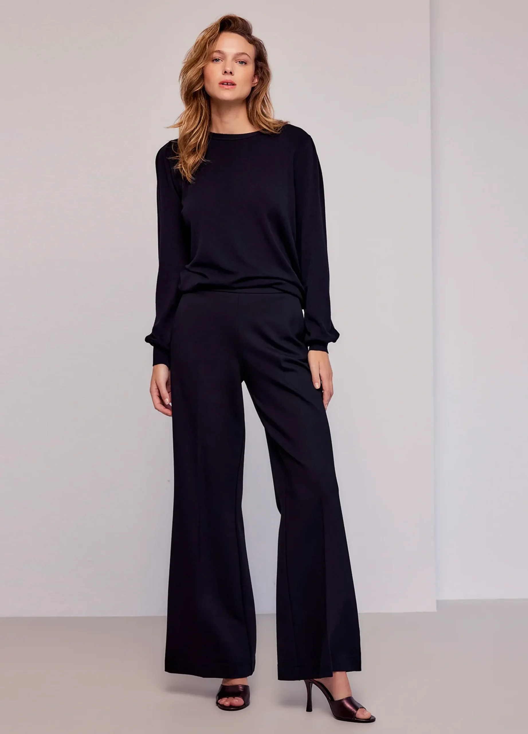 Wide-leg, boot-cut trousers with a permanent press fold, front slit pockets and stitched welt pockets at the back. The back of the waistband feature elastic with the Summum logo. Inseam is approximately 82cm for all sizes.