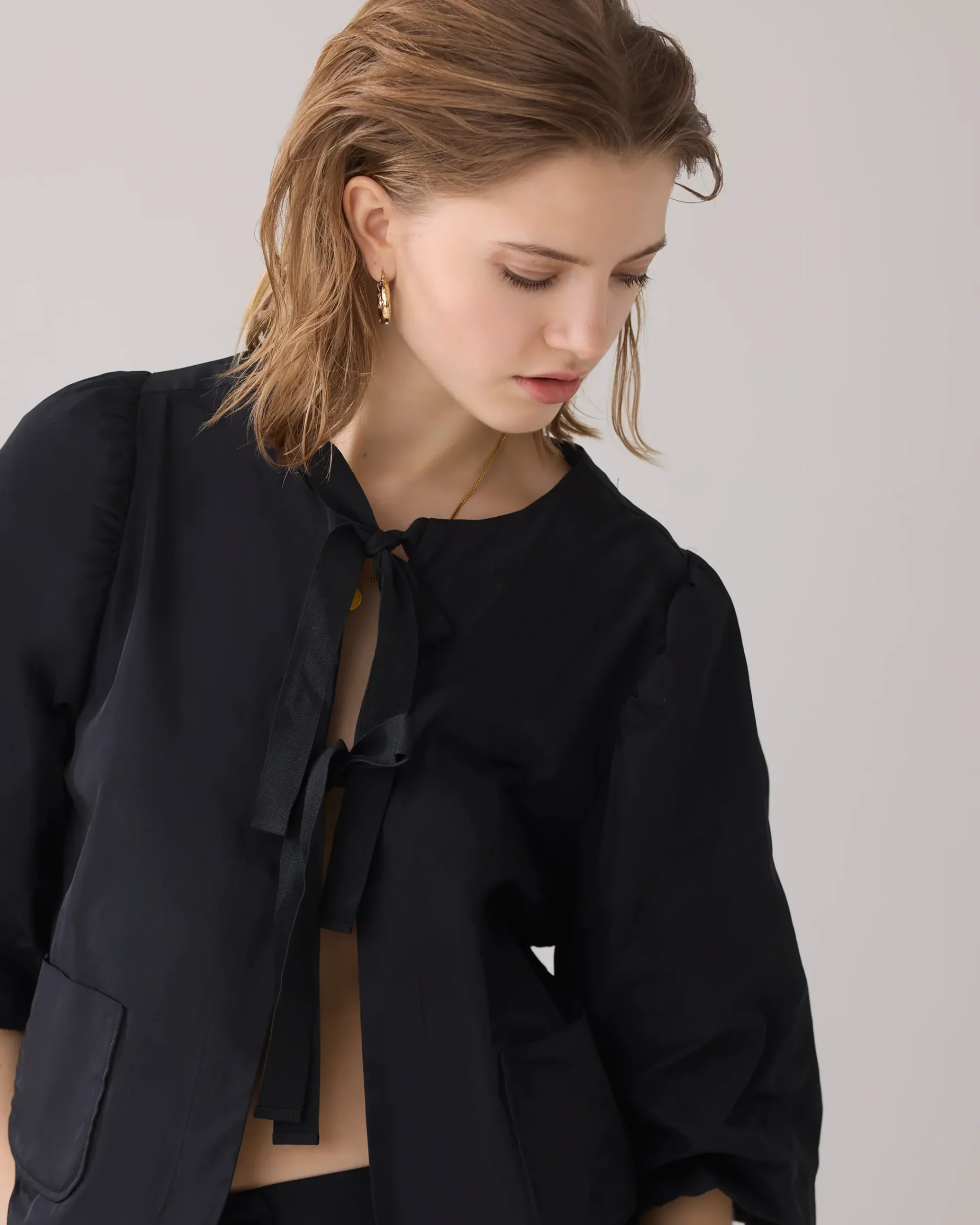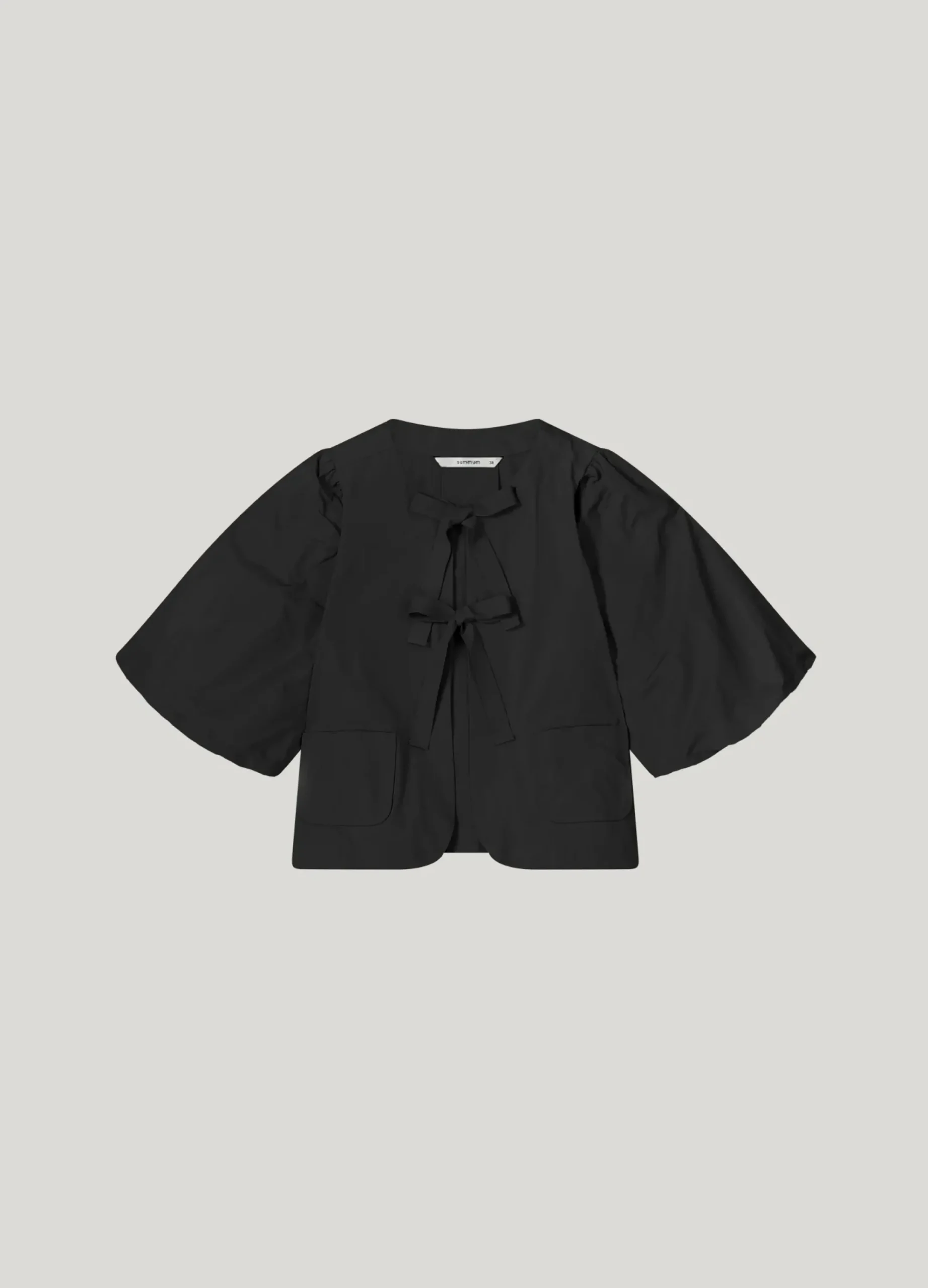 made of a cool taffeta fabric, this blouse jacket features short, lined balloon sleeves and a rib-strap bow fastening. The gathering at the back of the sleeves adds an extra balloon effect.