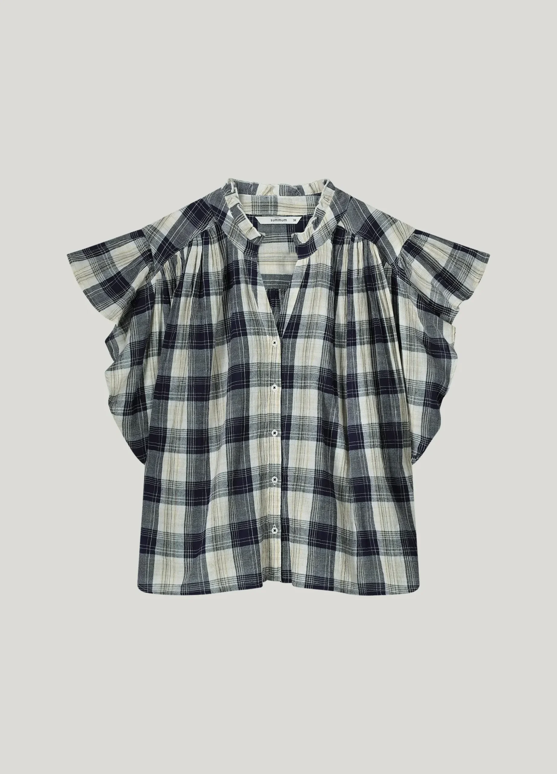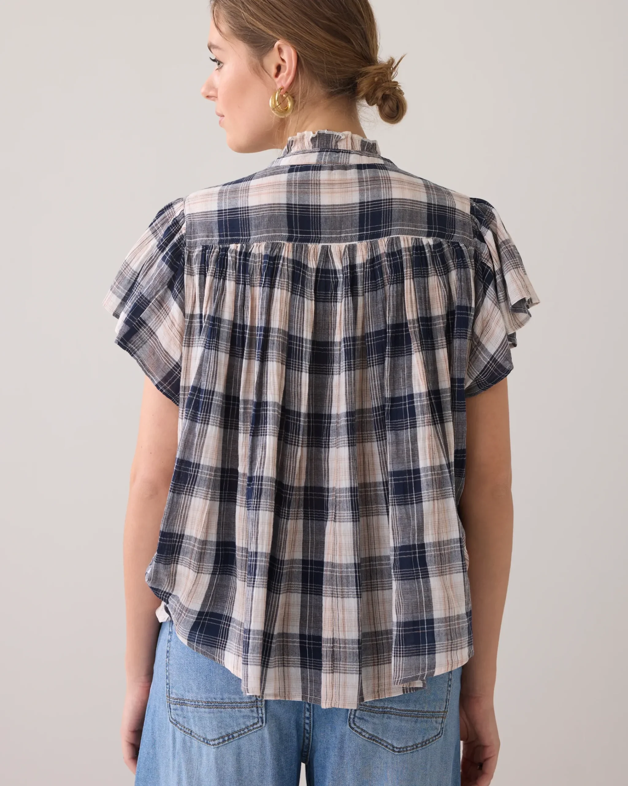 This blouse in a western check pattern has a wide fit and short flounce sleeves. The blouse has a V-neck with ruffles along the collar.