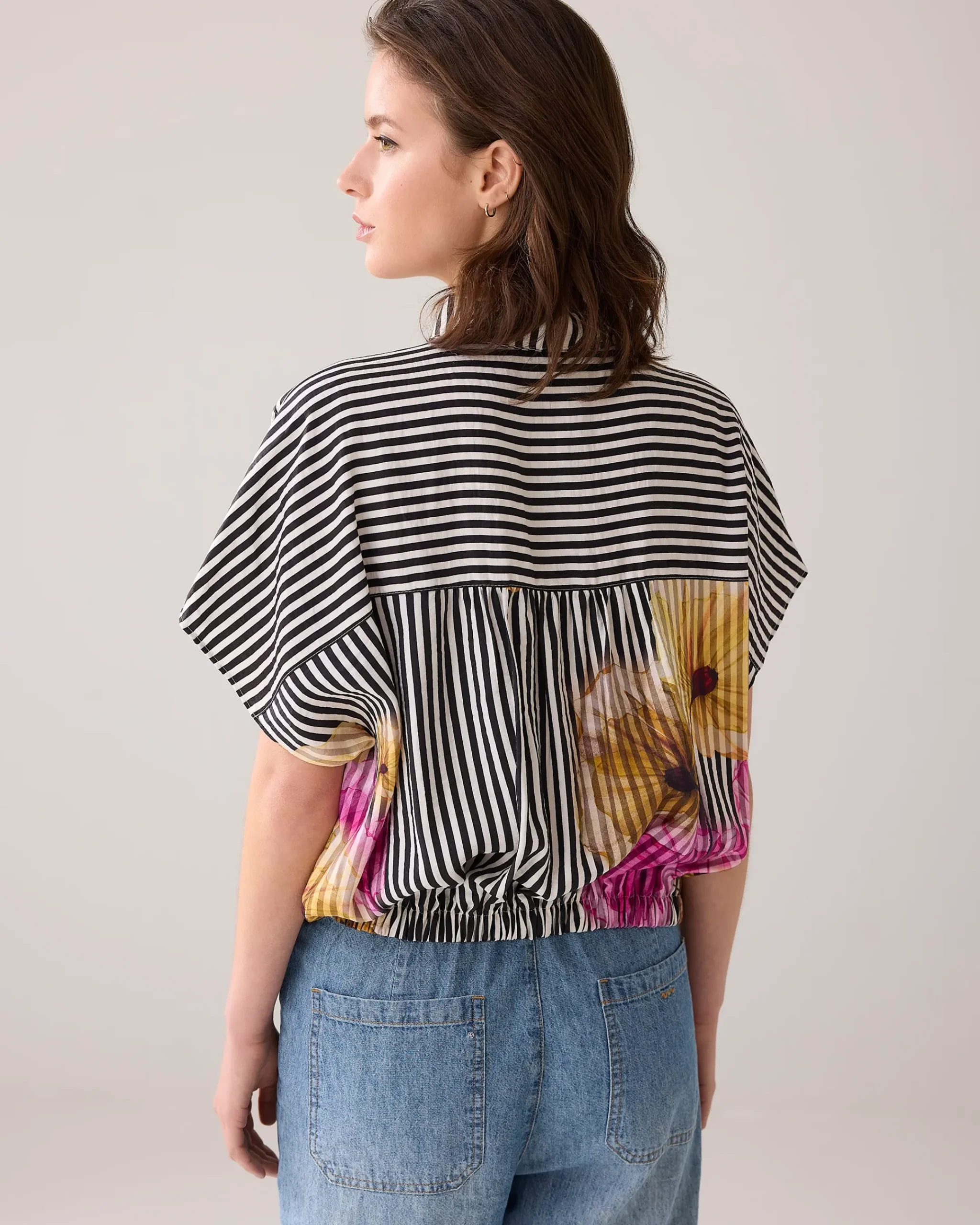 This boxy-fit blouse has an elasticated detail at the back and a fabric drawstring to adjust the fit. The random placement of the floral print makes each item unique.