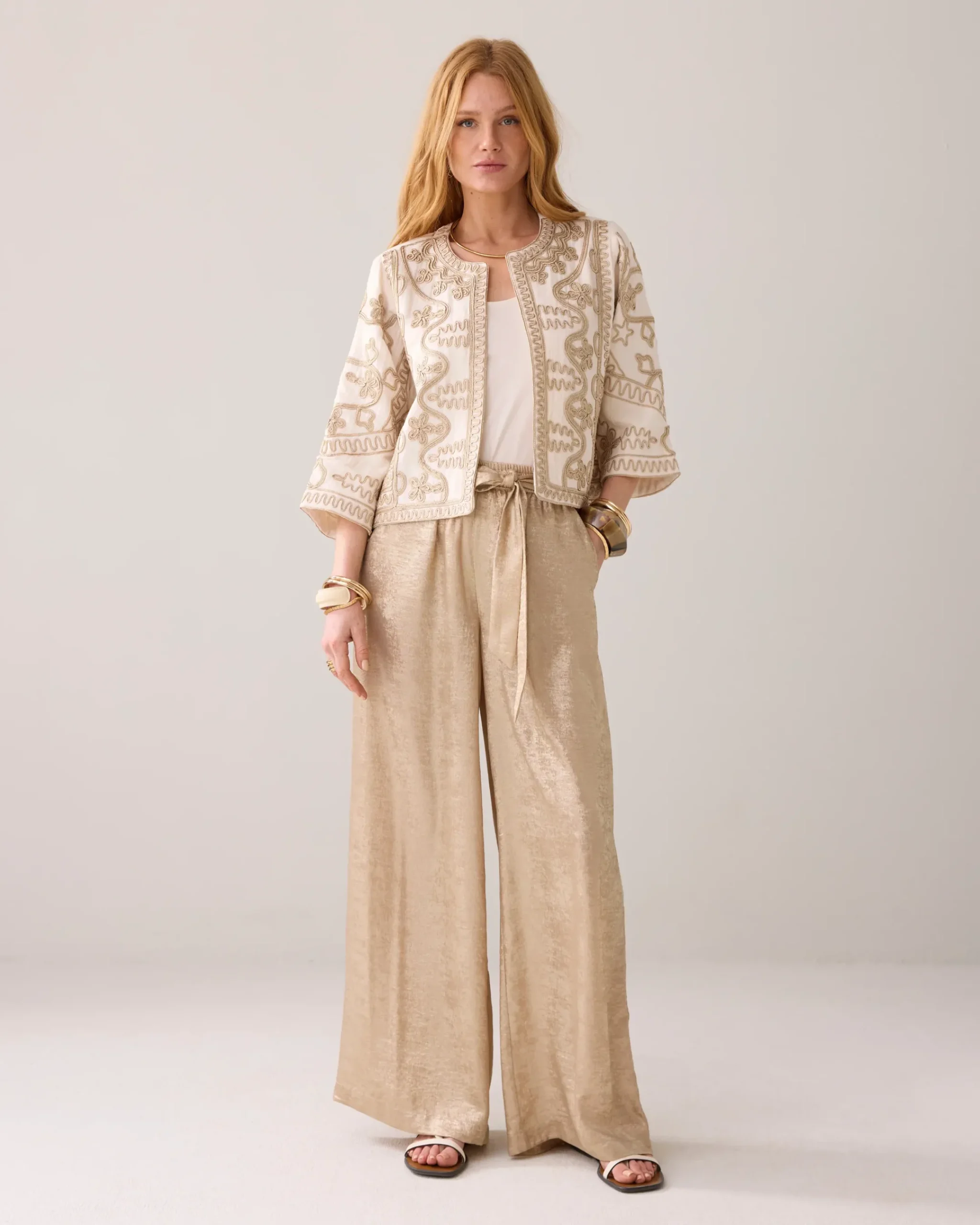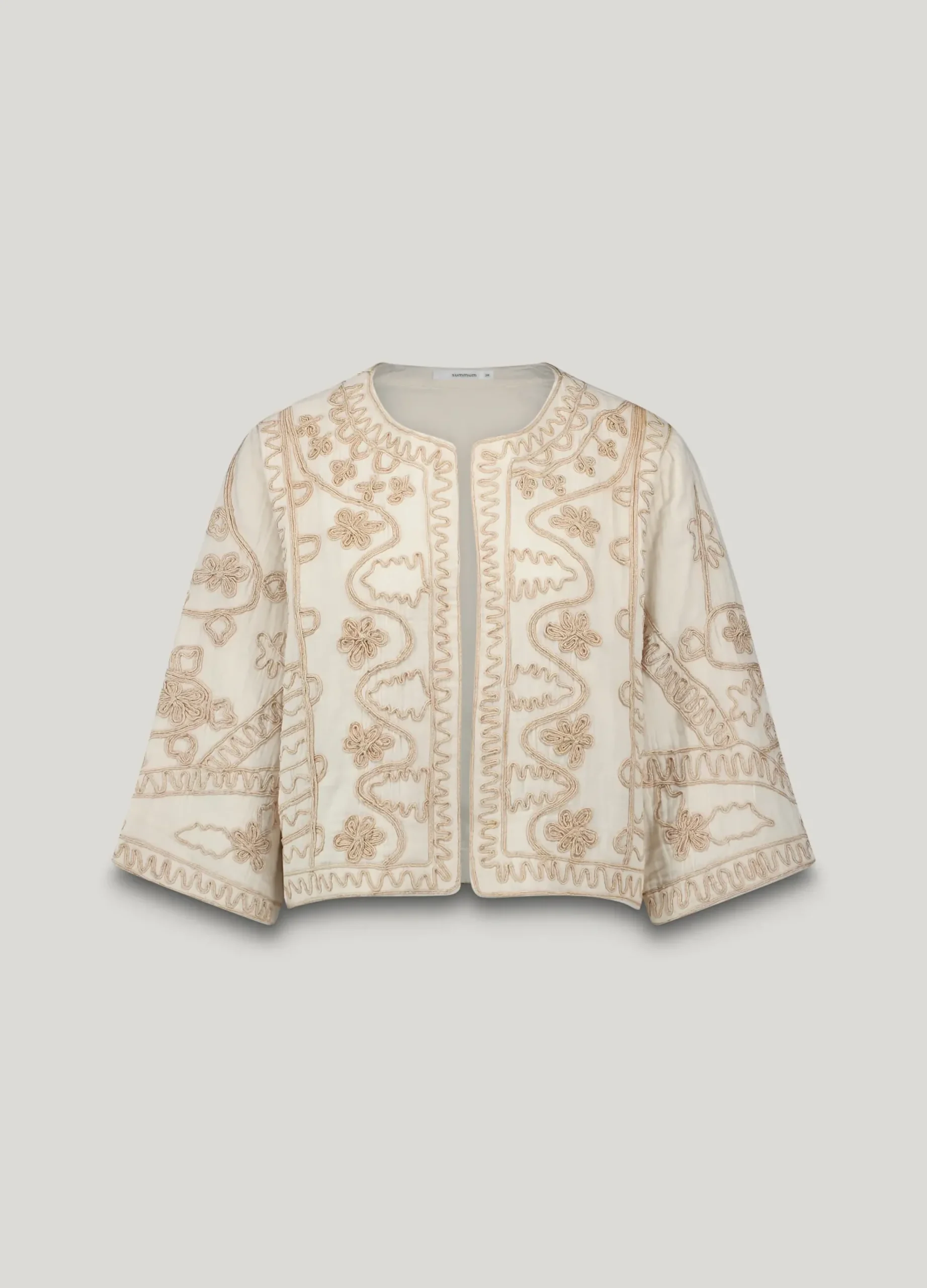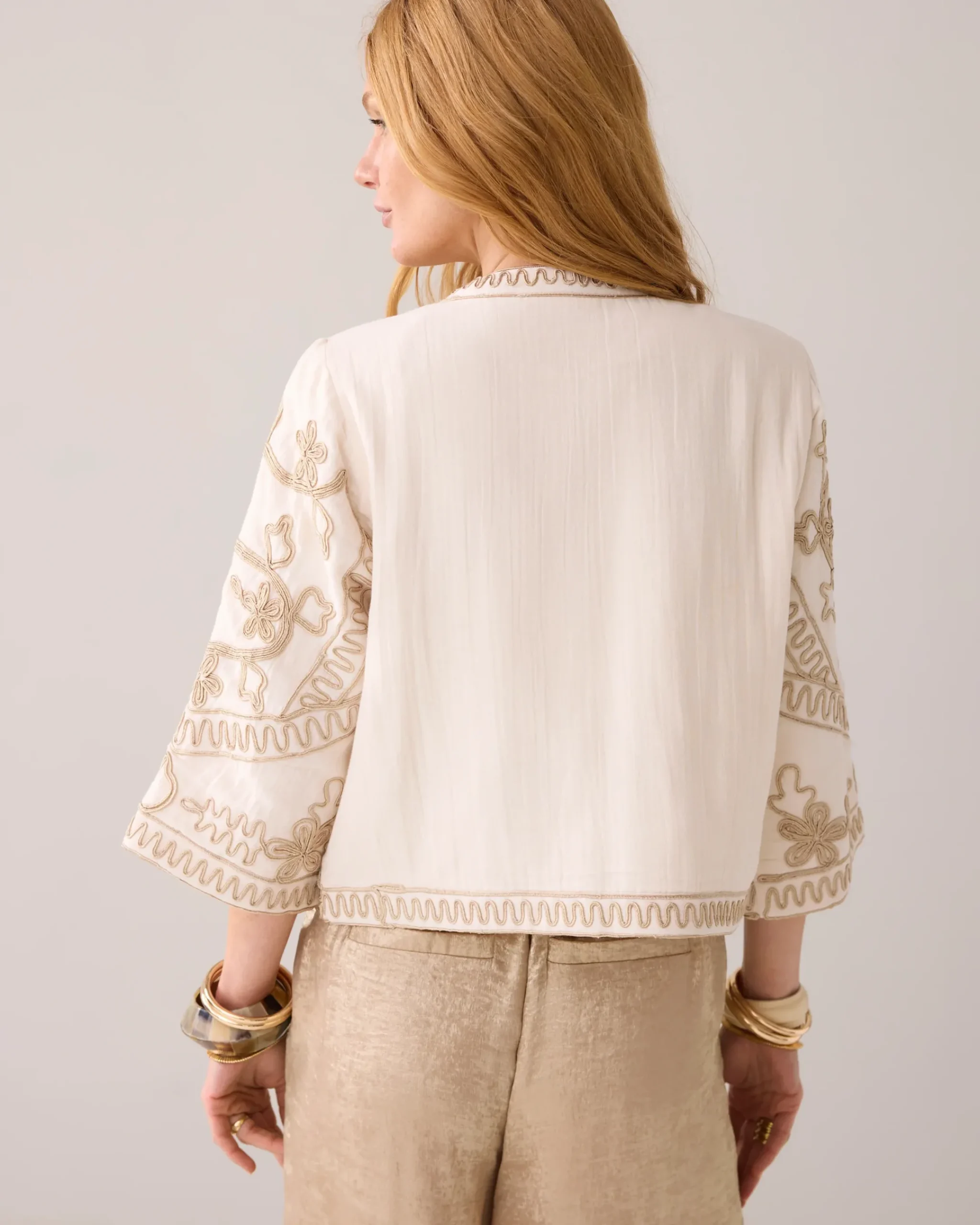 This kimono jacket is made of soft cotton and is richly decorated with gold-coloured embroidery. The jacket is fully lined with shiny cotton.