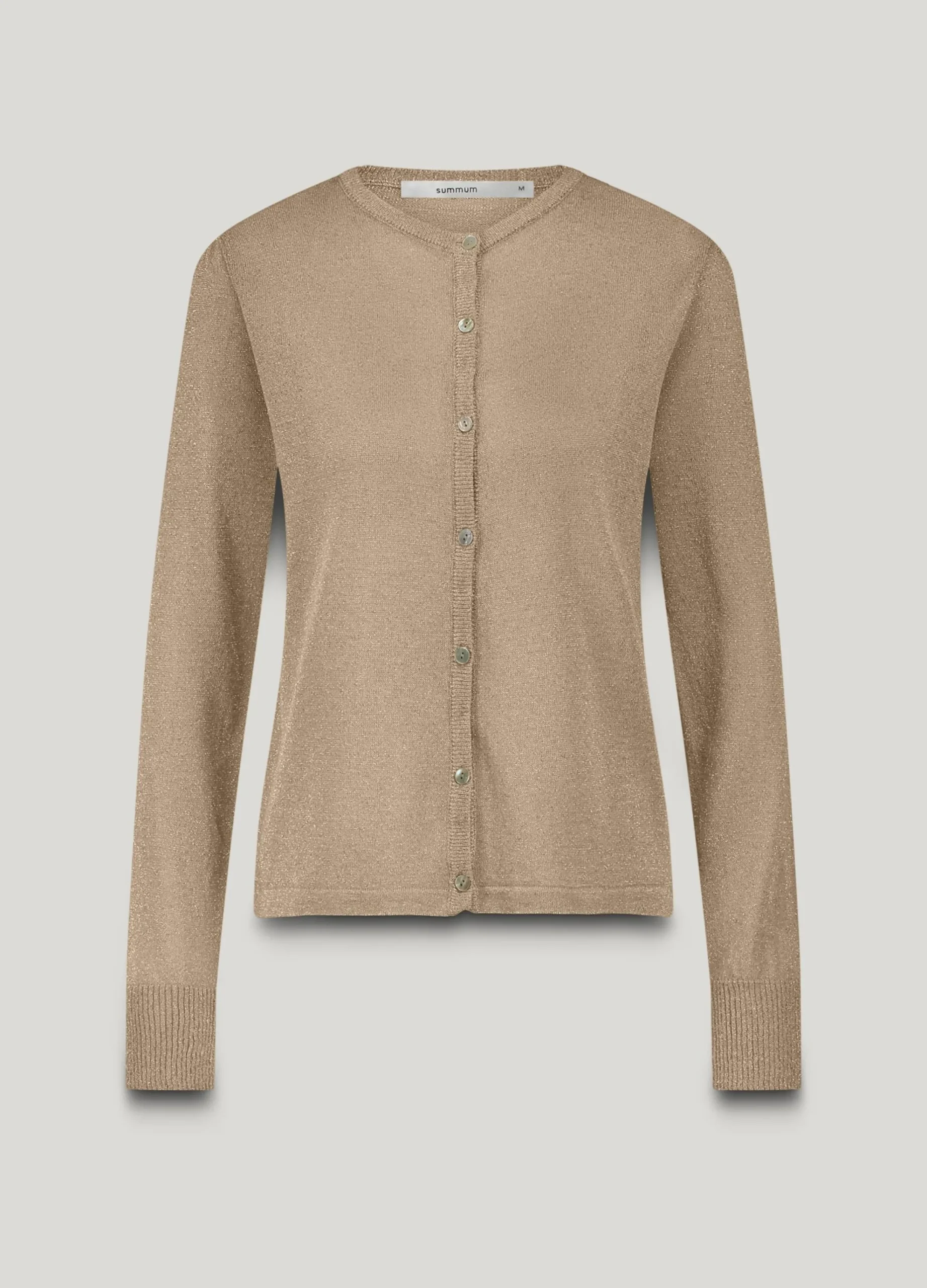 This sophisticated cardigan is made of a viscose-lurex blend and has a subtle sheen. The cardigan has mother-of-pearl buttons and long sleeves.