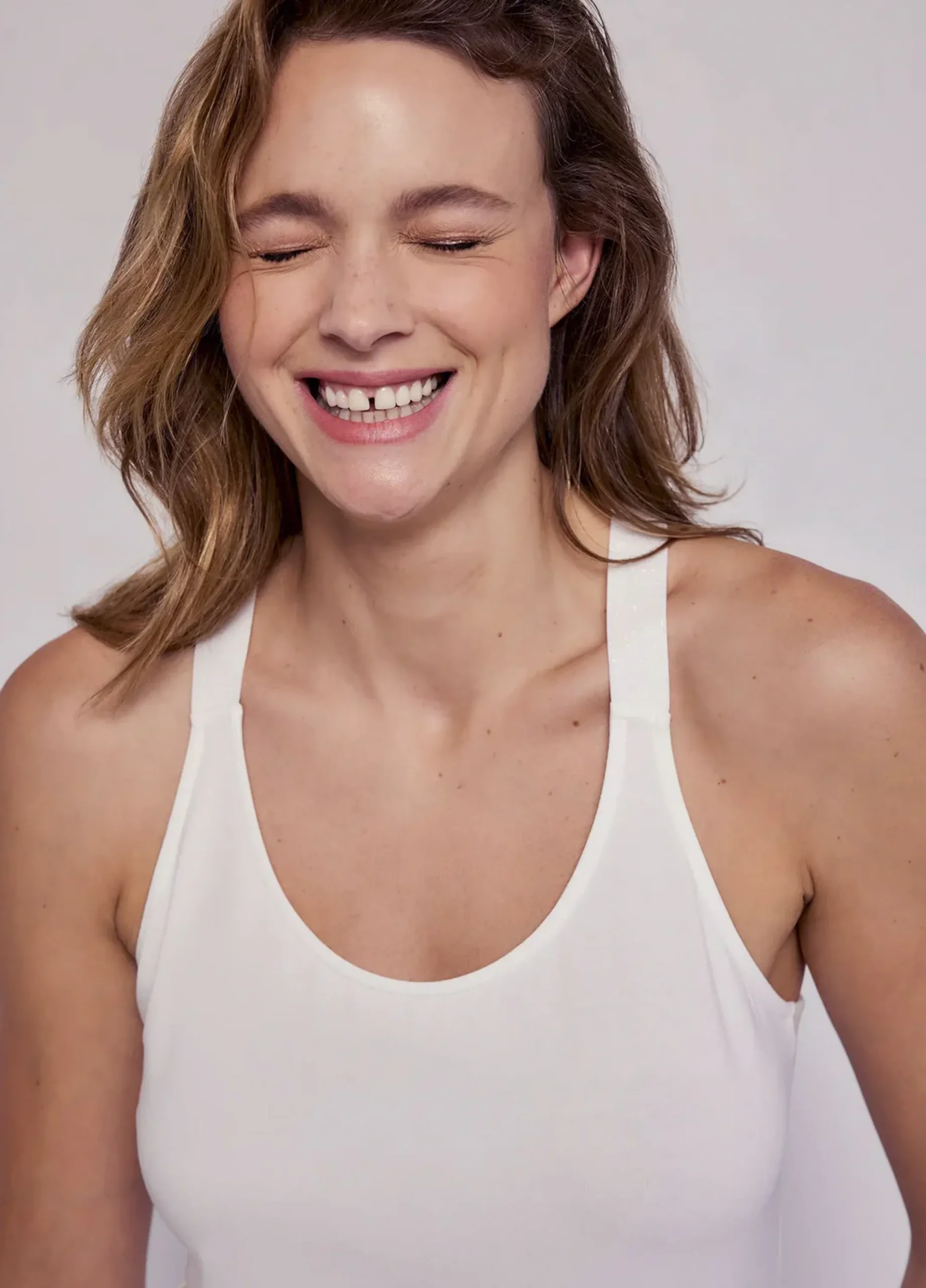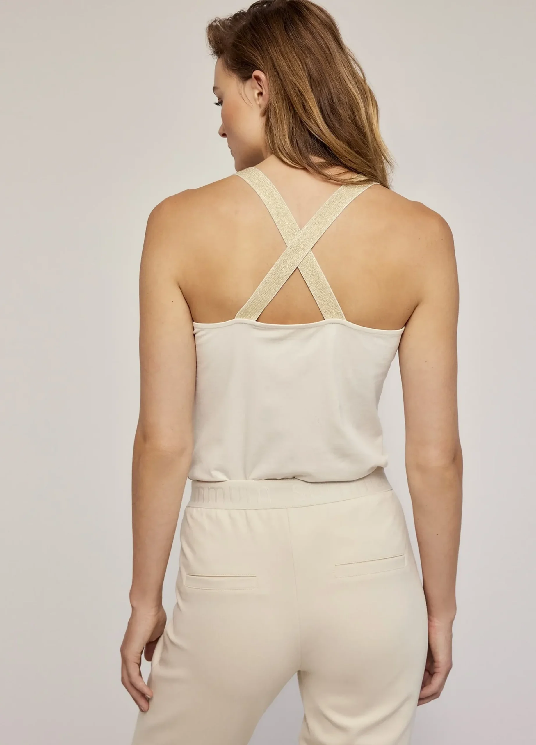 A Luxury Basic round-neck singlet top made from organic cotton with crossover shoulder straps from fine stretch fabric with a glitter-thread detail.