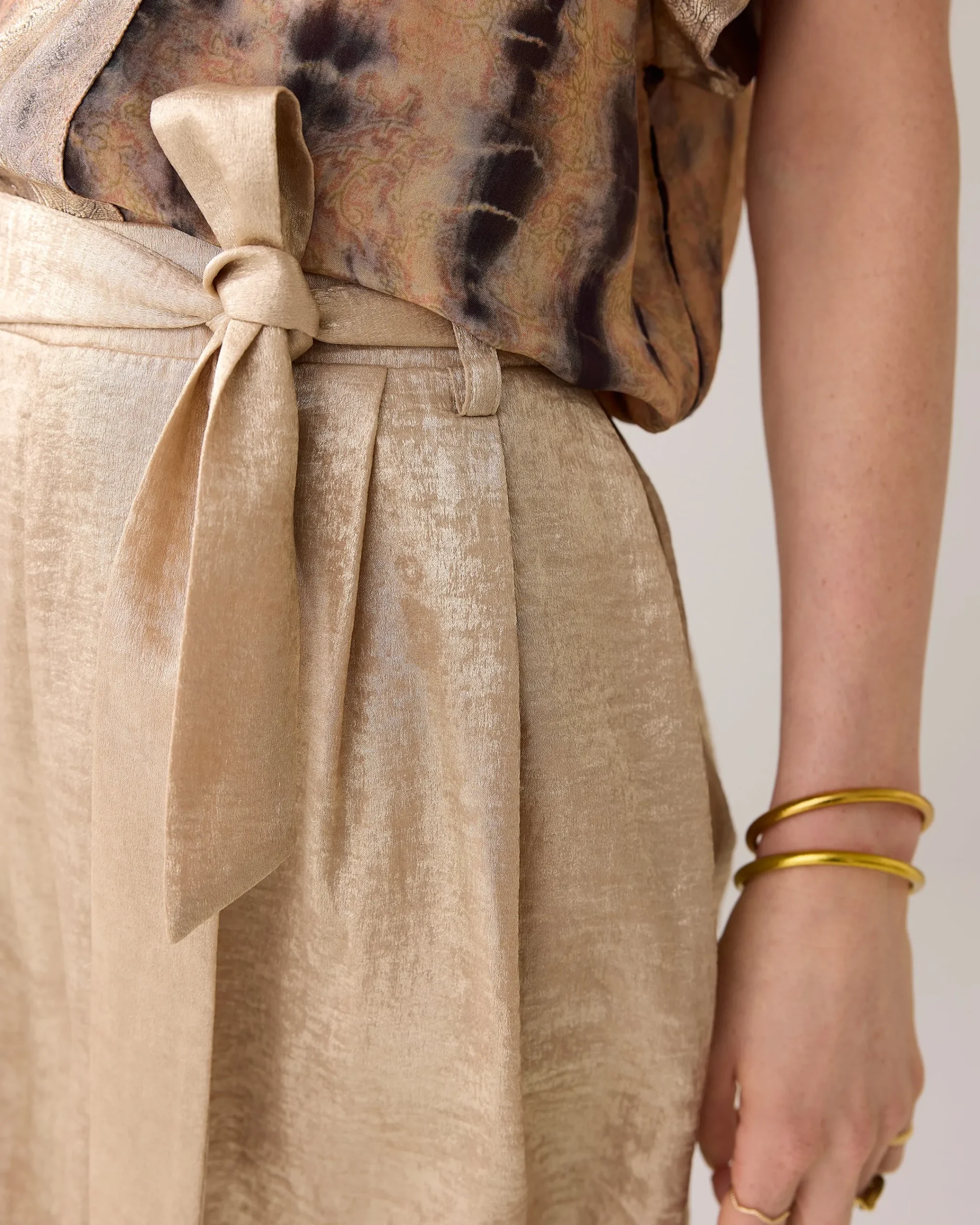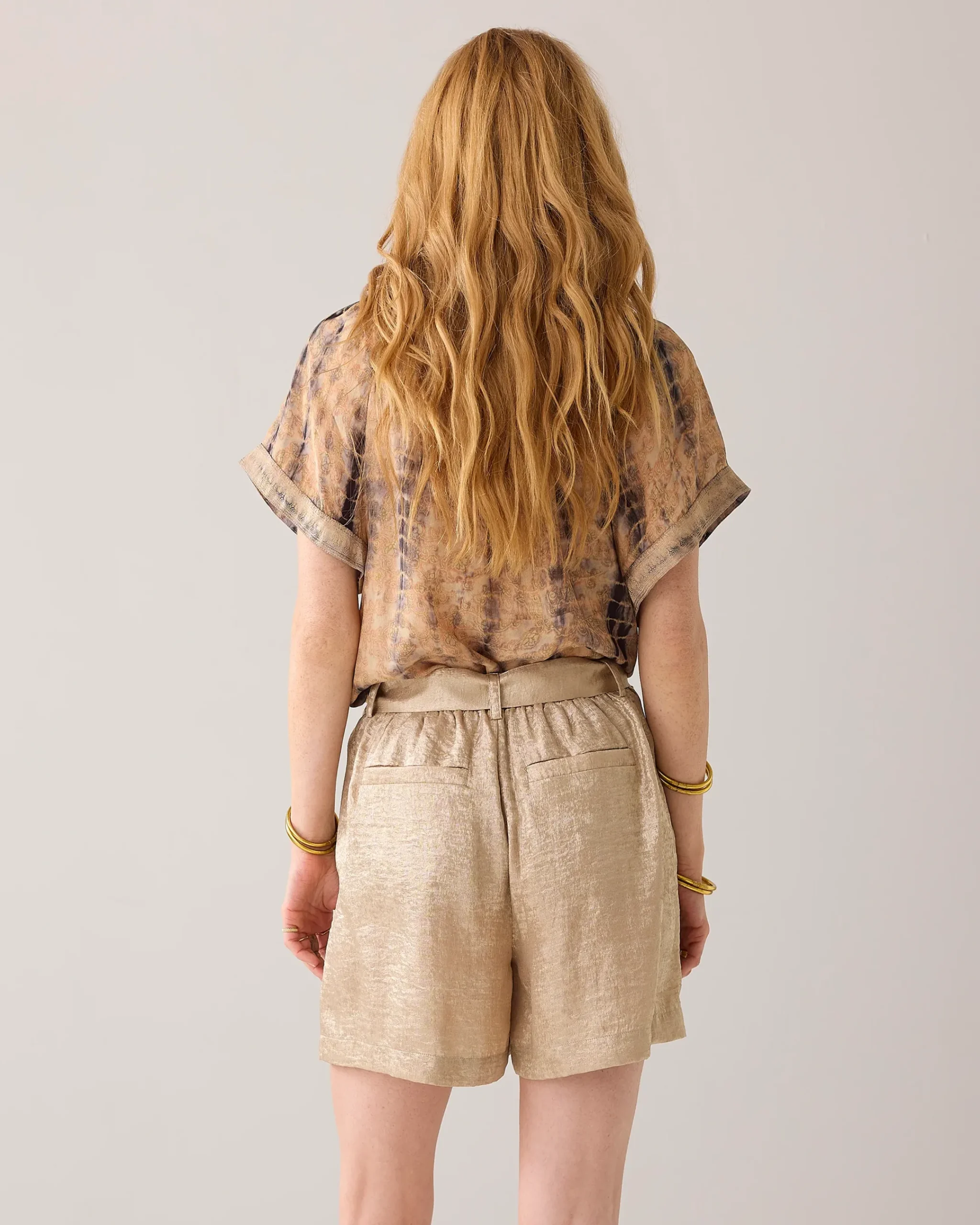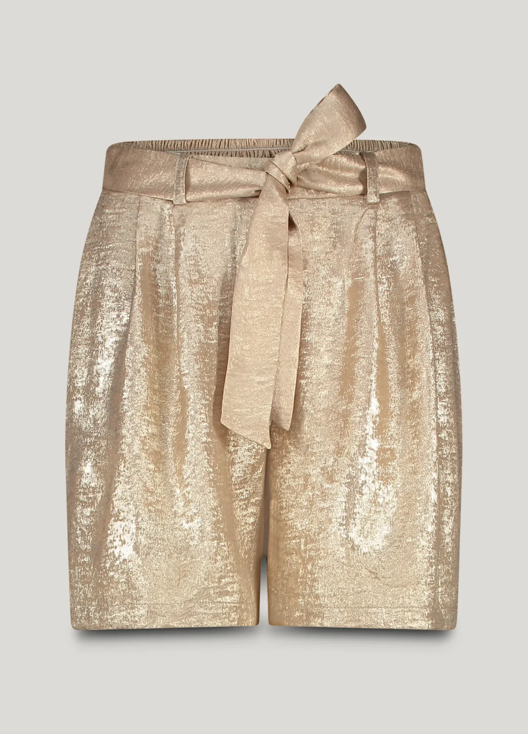 These airy shorts have wide legs and an all-over metallic coating. The shorts have a high waist with a tie belt.