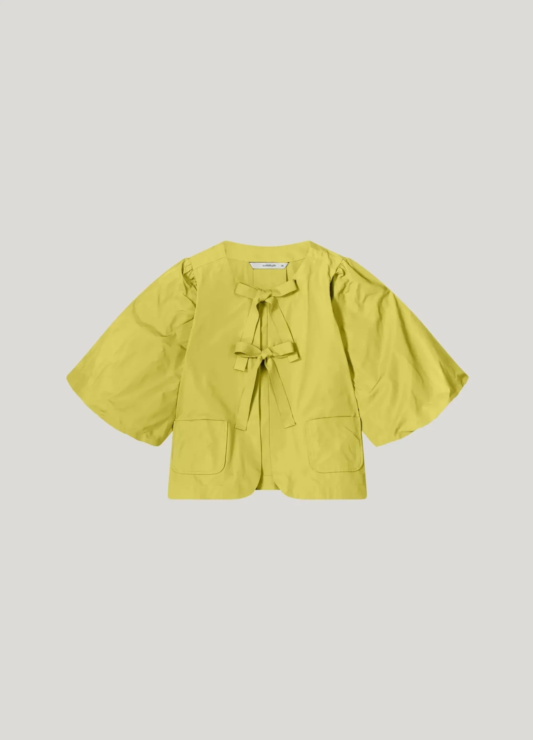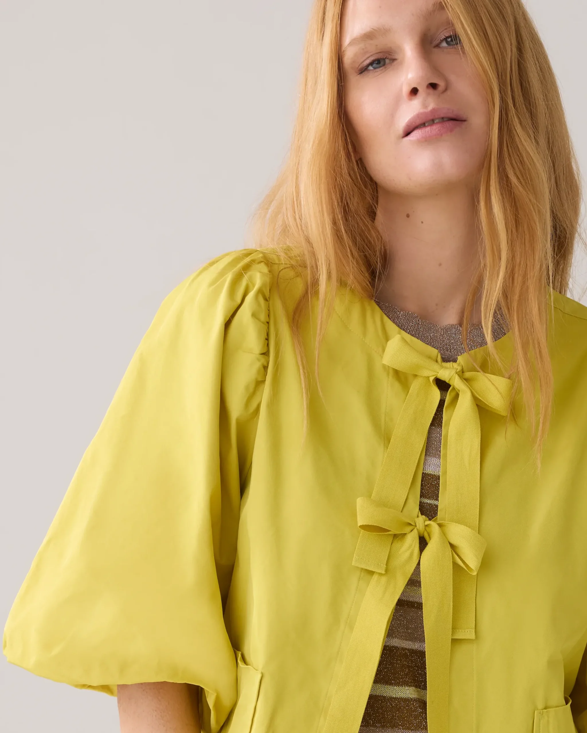 made of a cool taffeta fabric, this blouse jacket features short, lined balloon sleeves and a rib-strap bow fastening. The gathering at the back of the sleeves adds an extra balloon effect.