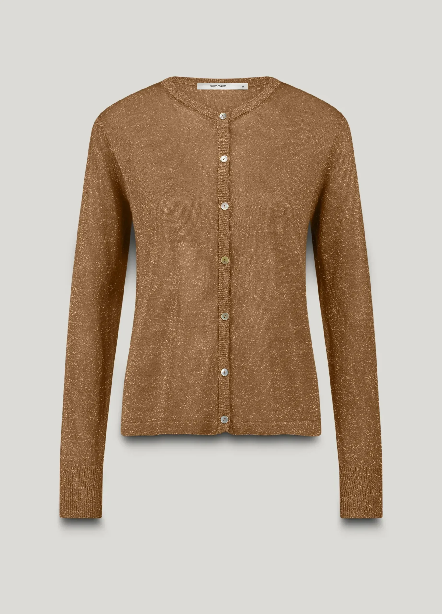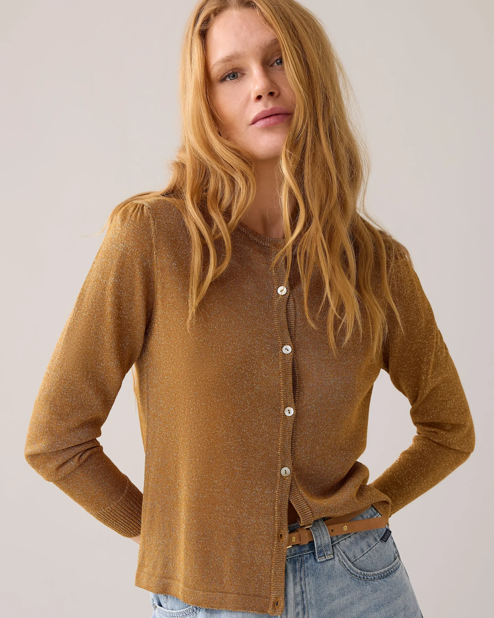 This sophisticated cardigan is made of a viscose-lurex blend and has a subtle sheen. The cardigan has mother-of-pearl buttons and long sleeves.