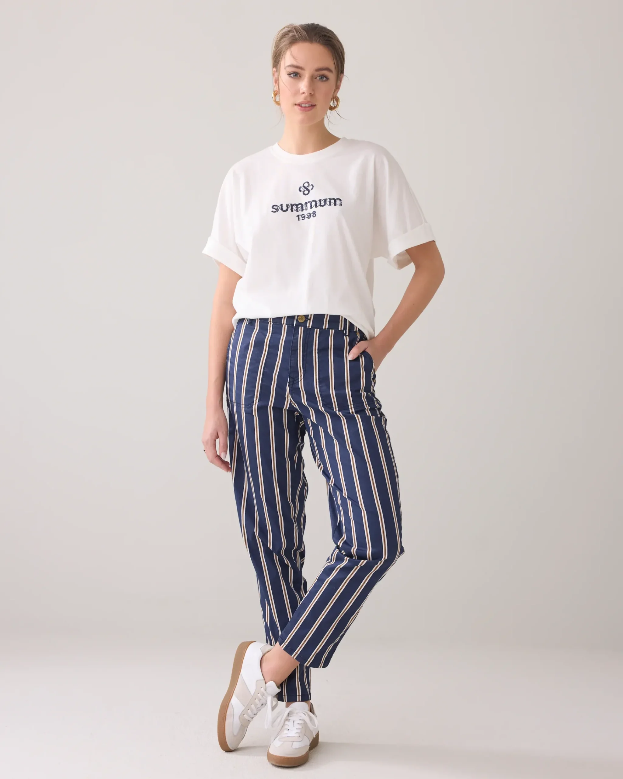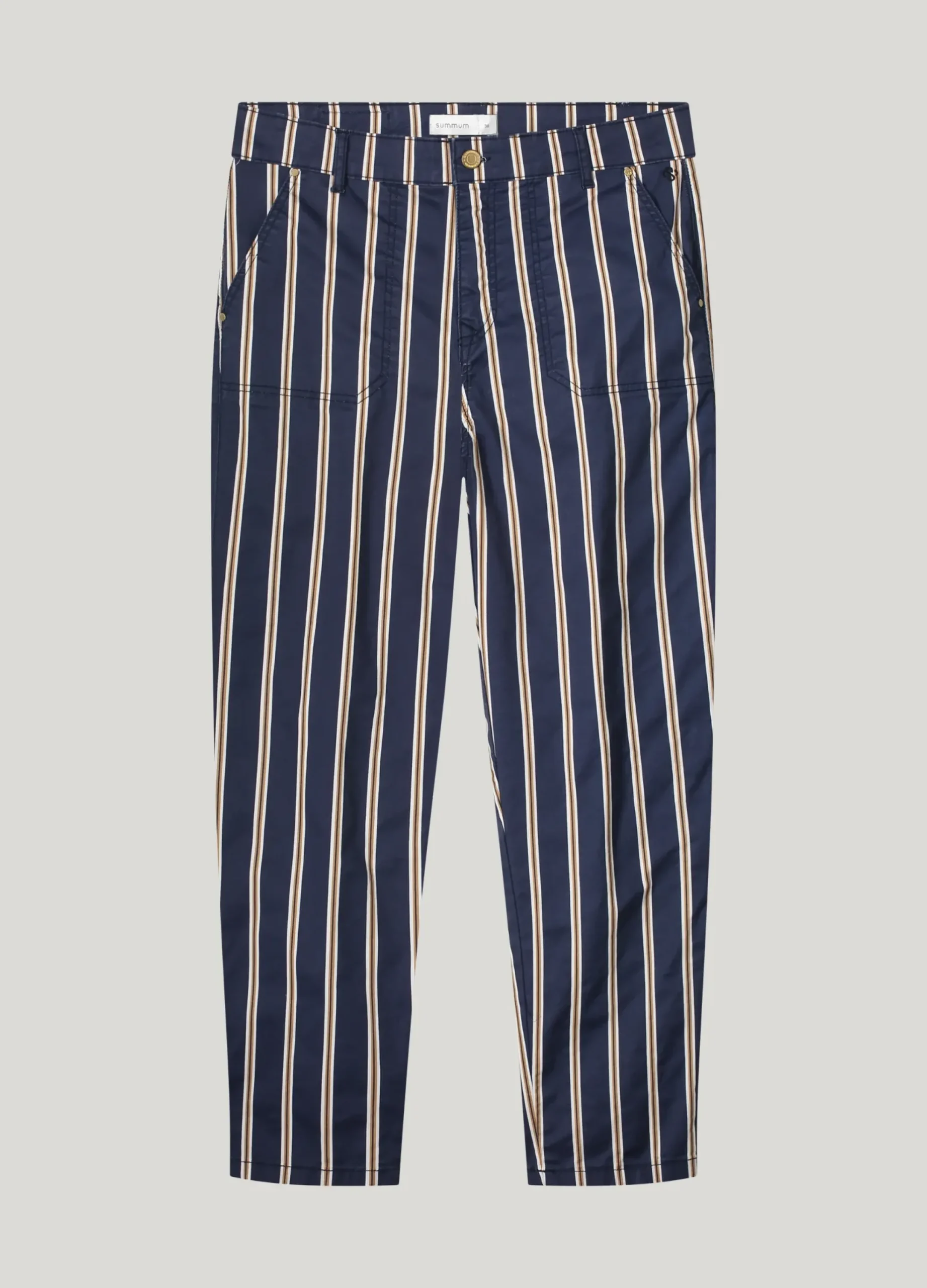 These tapered trousers feature a printed stripe and are made of a comfortable cotton-elastane blend. The stitched workerstyle pockets and fake welt pockets at the back add a cool touch.