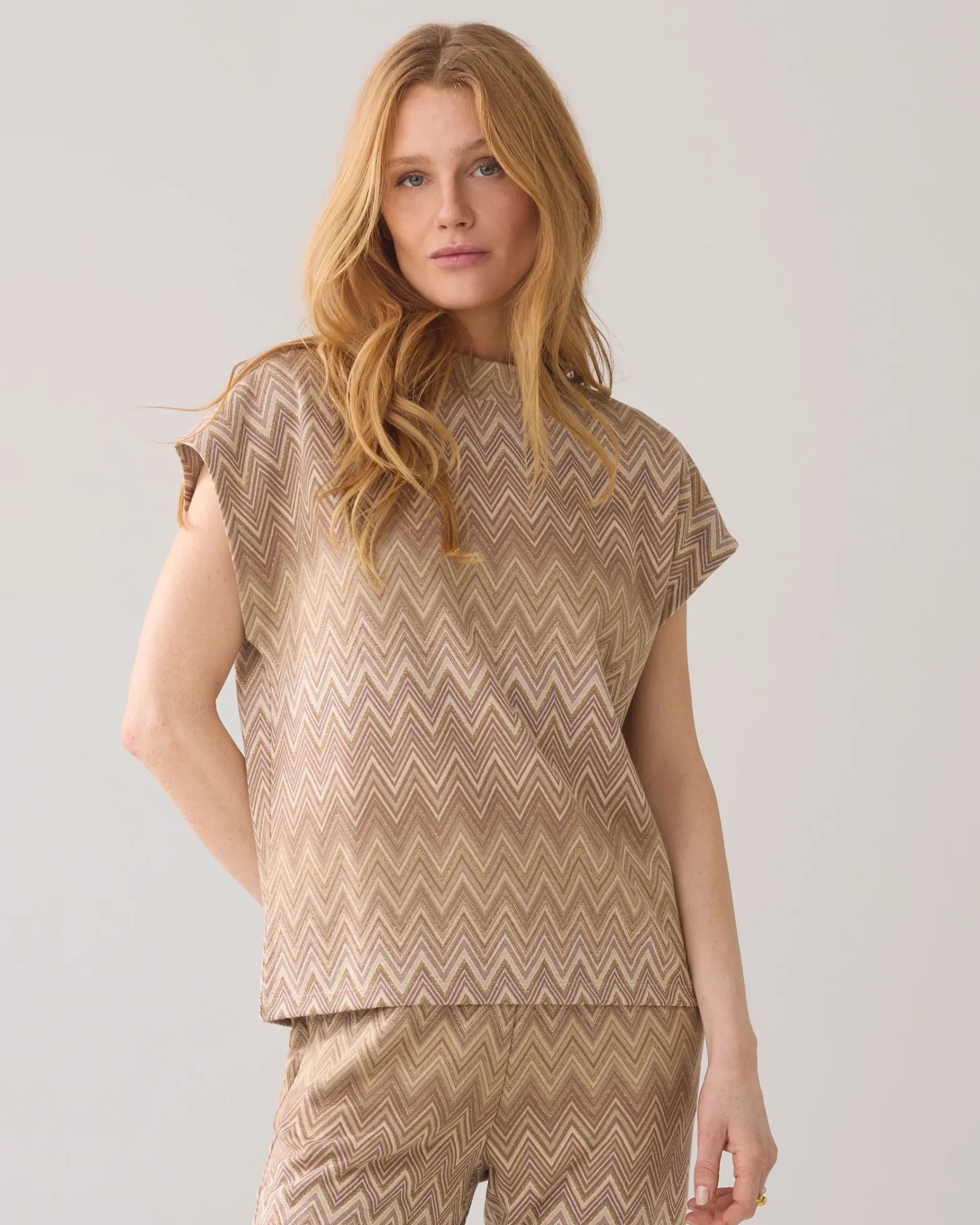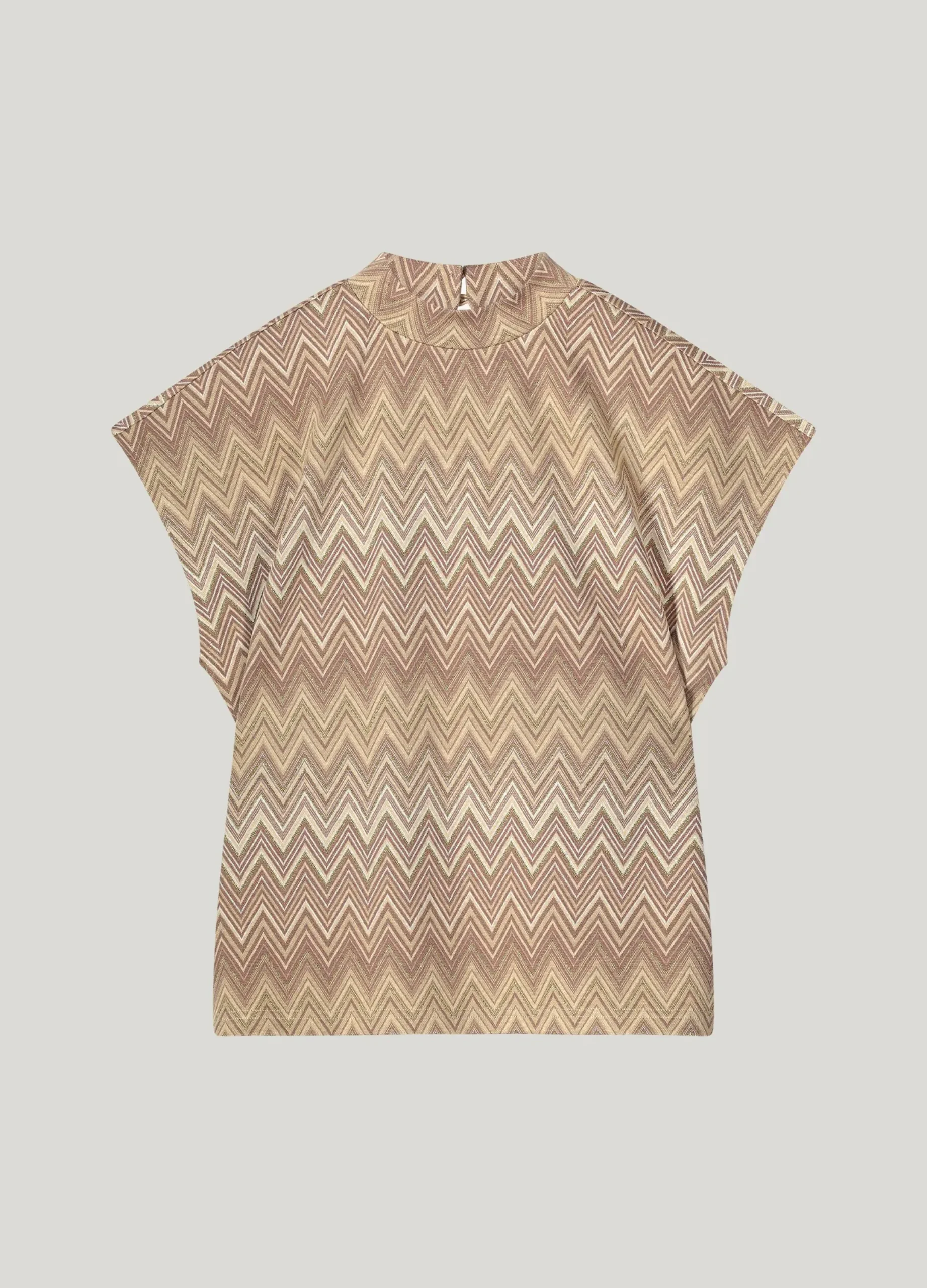 This top has a fitted stand-up collar and is made of a thicker jacquard fabric with a zigzag pattern and interwoven gold lurex yarn. The top has a festive slit detail with gold-tone buttons.