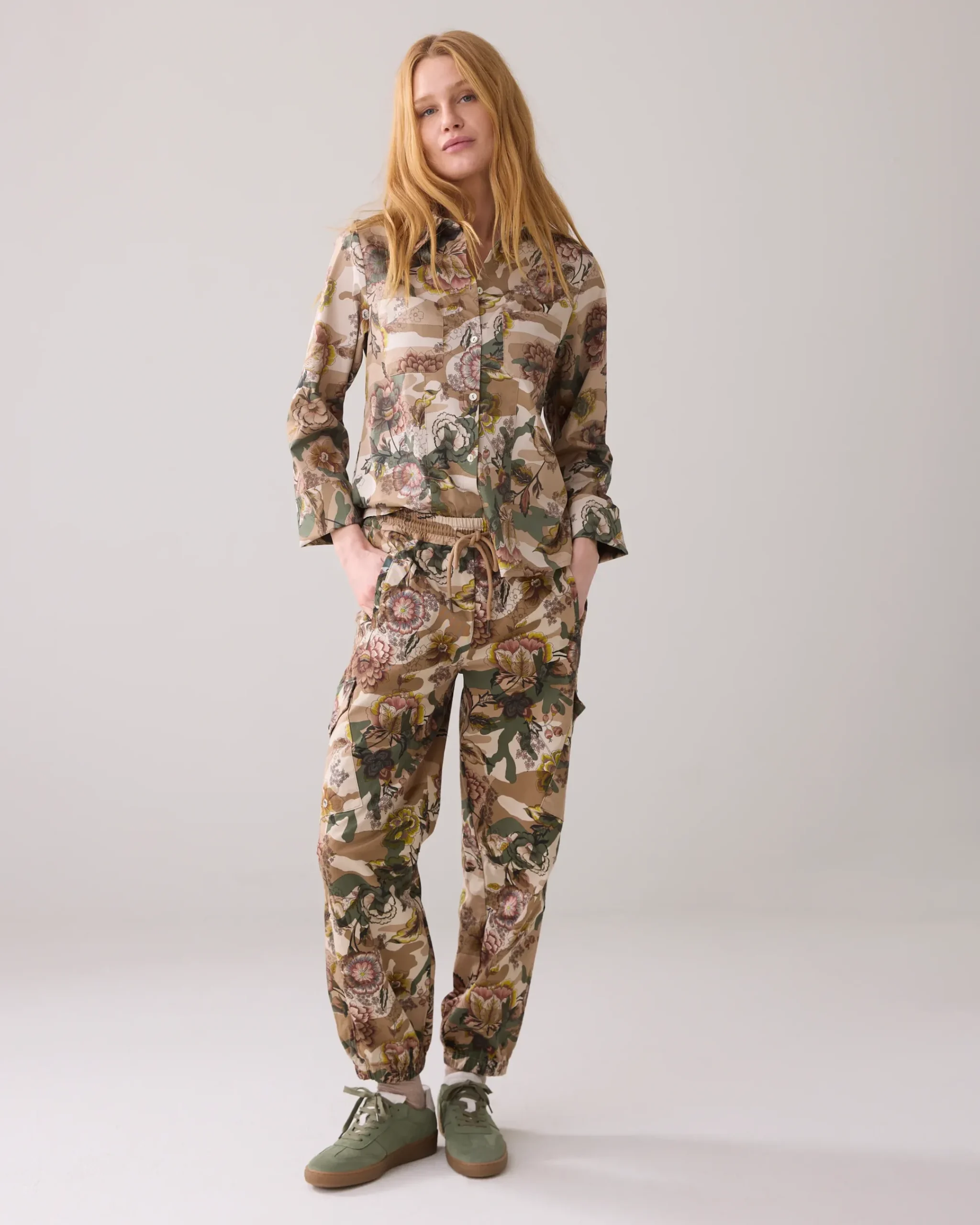 These trousers in sturdy stretch cotton have an all-over camouflage print with flowers. The trousers have an elasticated waistband with a lacing cord.
