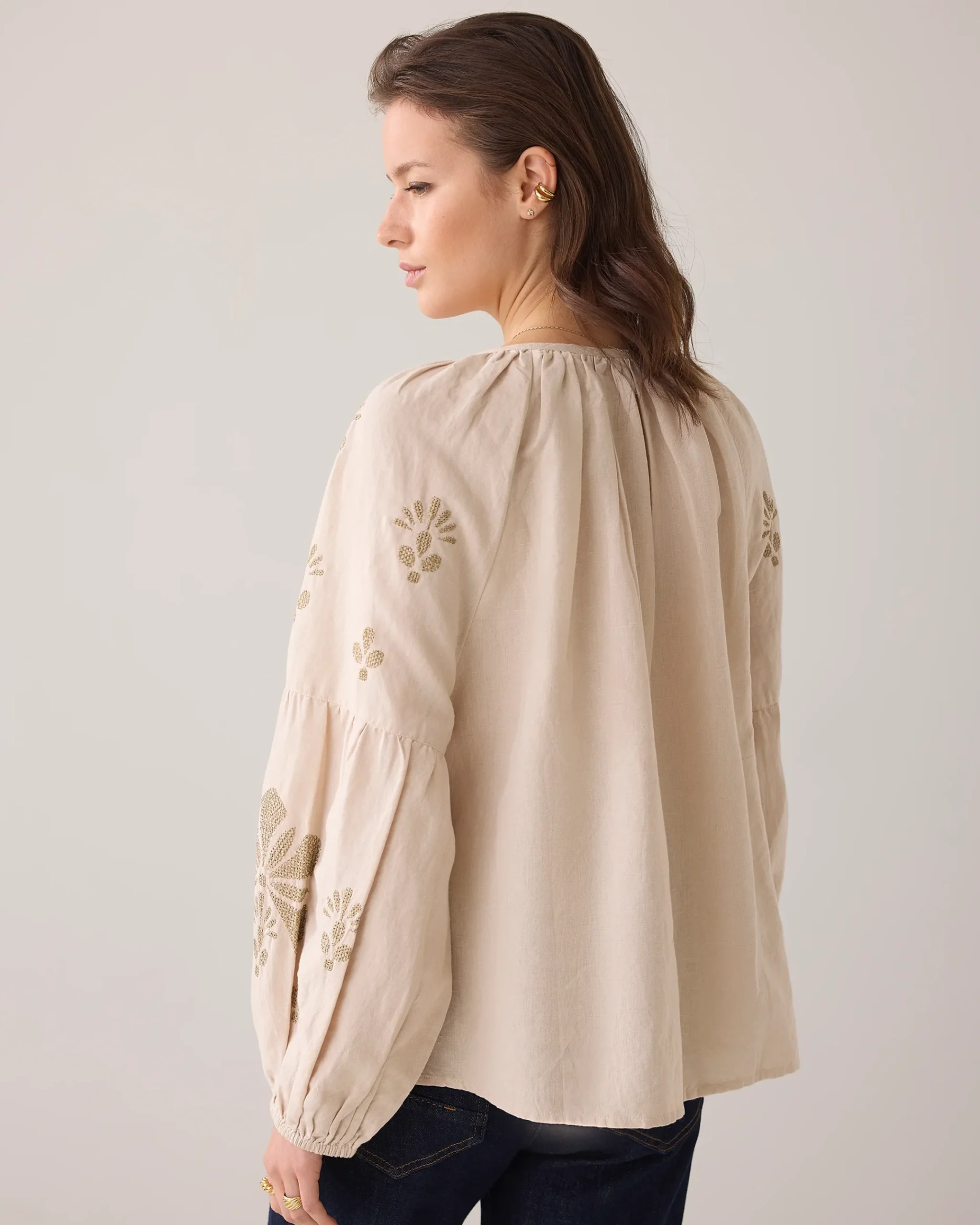 Crafted from a cotton-linen blend, this A-line top is embellished with cross-stitch embroidery in lurex thread. The top has a round neckline with a subtle slit and drawstring fastening with tassels.