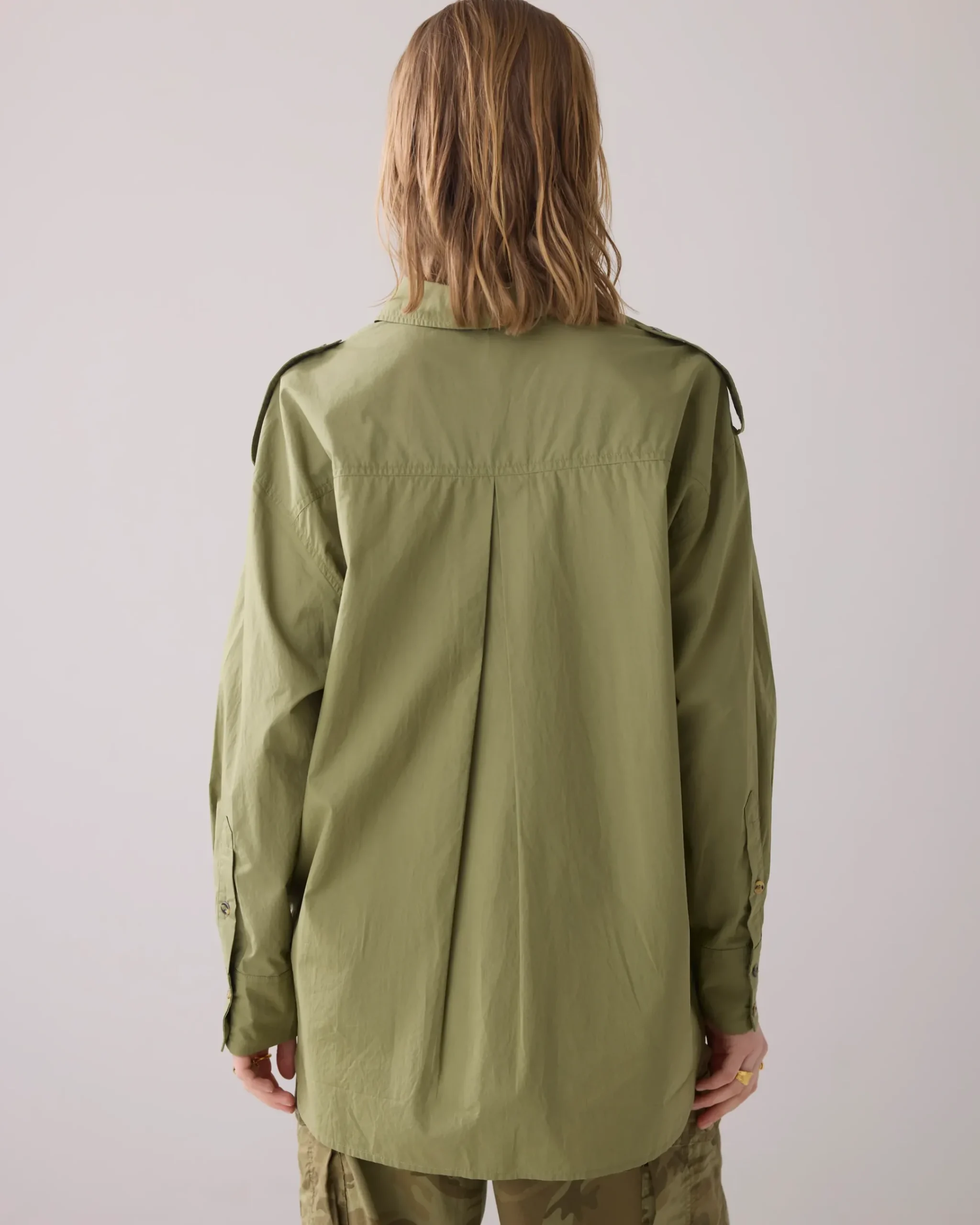 This shirt blouse is designed in army style with epaulettes on the shoulders and front flap pockets. The crispy poplin cotton fabric gives the blouse a cool look.