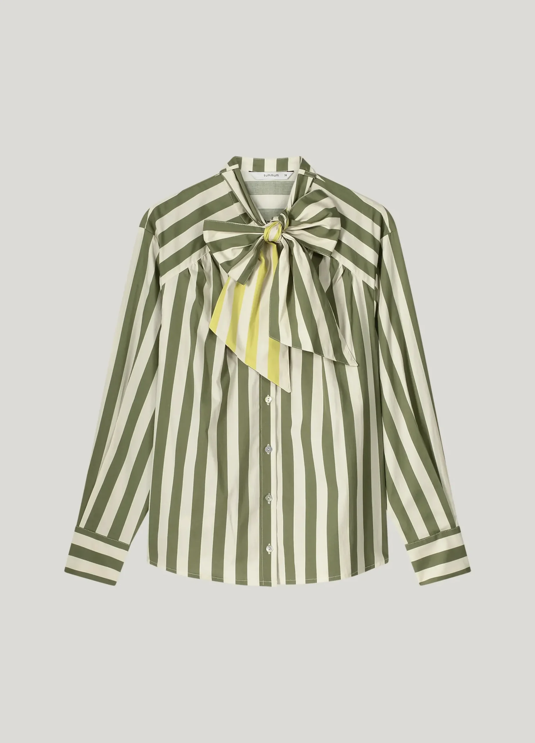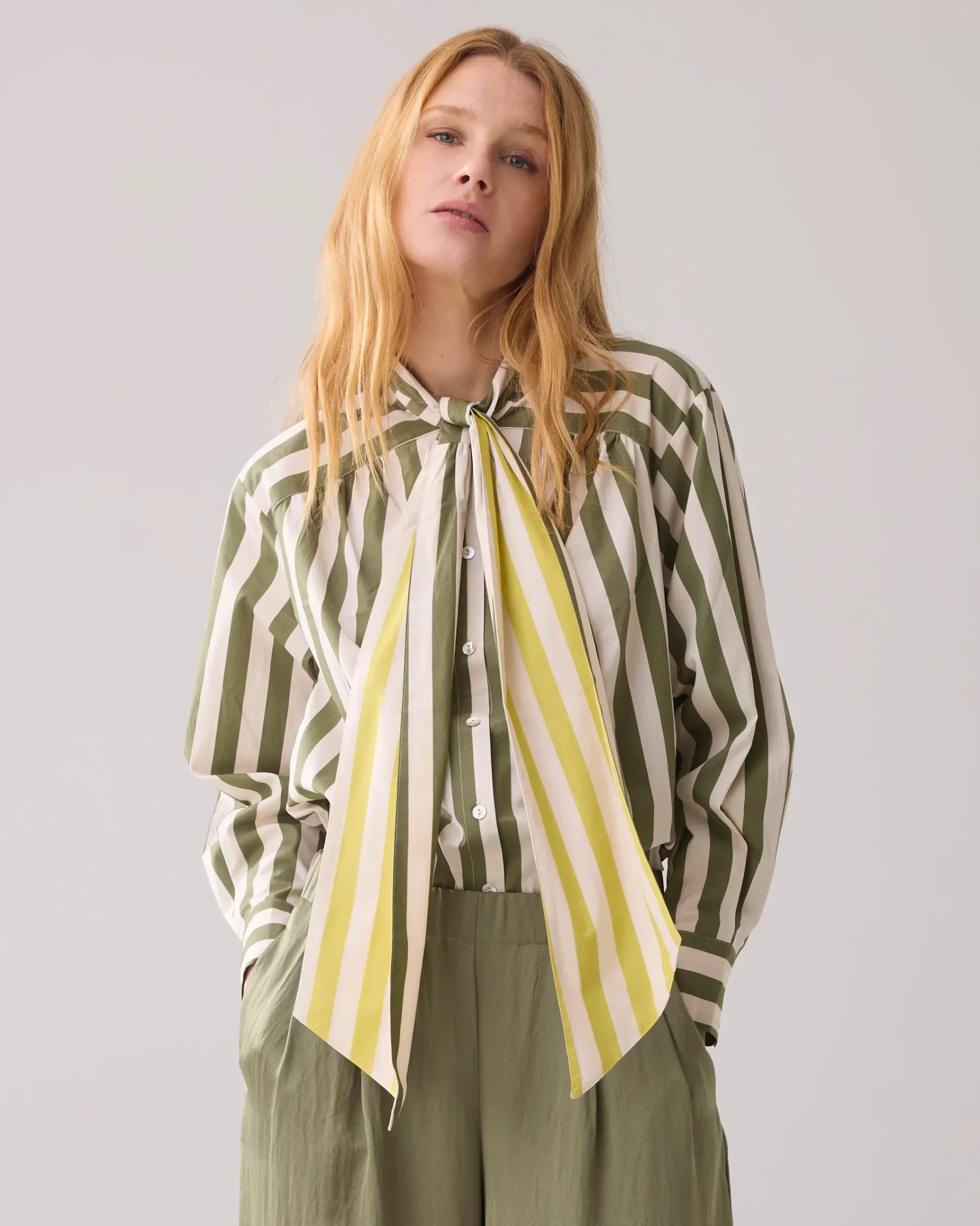 This loose-fitting blouse has a large two-tone bow, which you can wear in multiple ways: subtle or contrasting. The pleats at the back and wide sleeves with lowered sleeve inset provide a feminine fit.