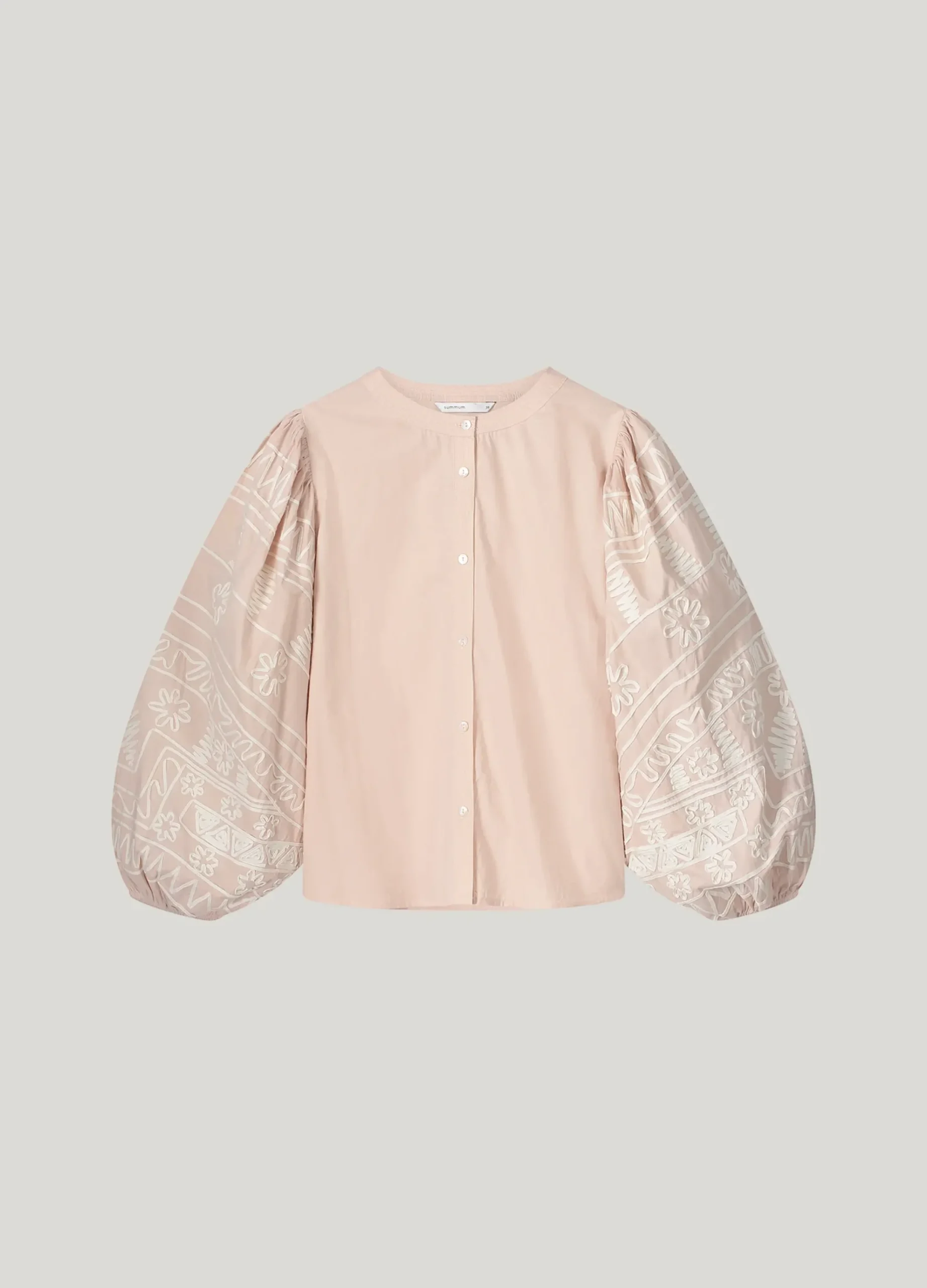This blouse has balloon sleeves with rich embroidery and elastic at the bottom. The blouse has a round neckline and button fastening with small shell buttons.