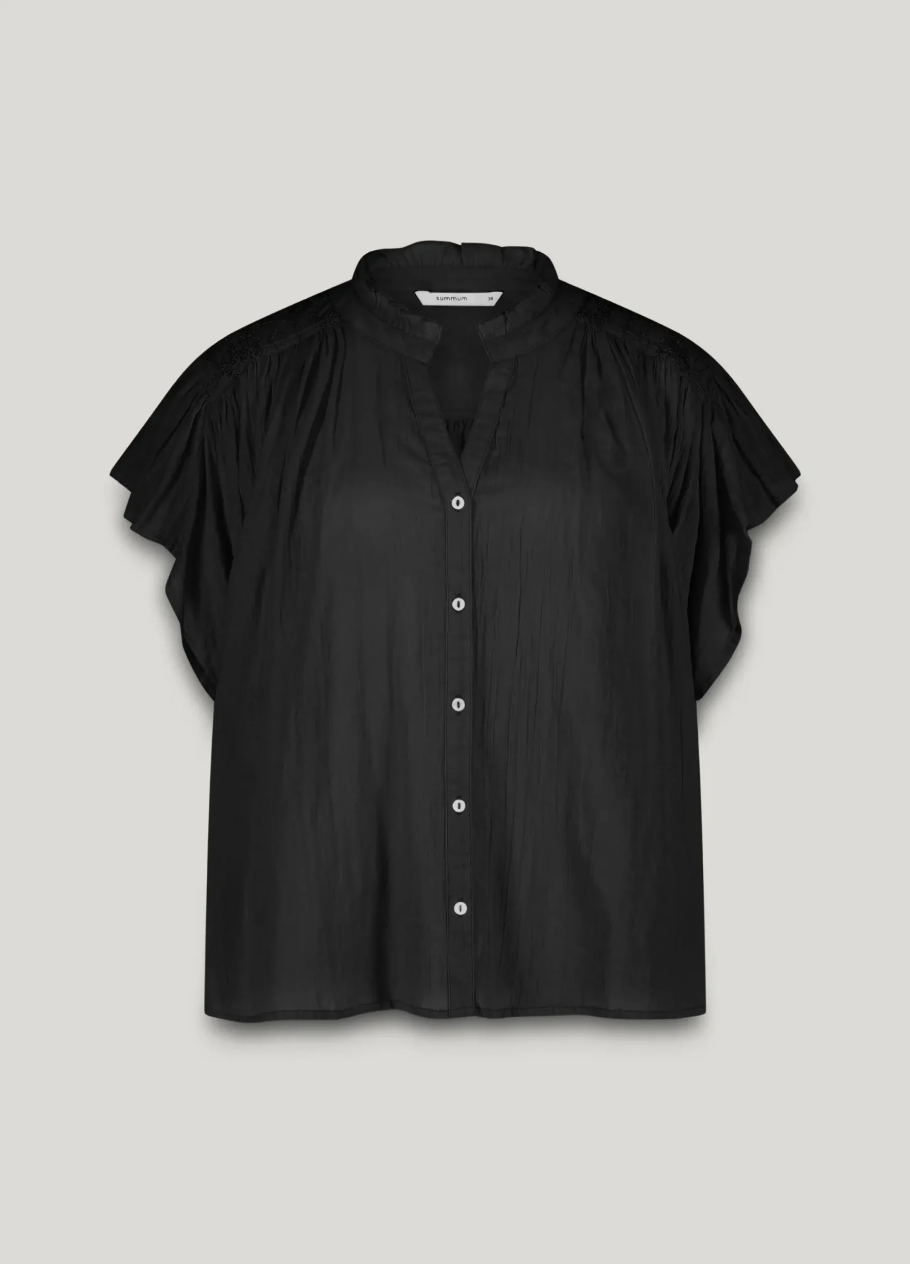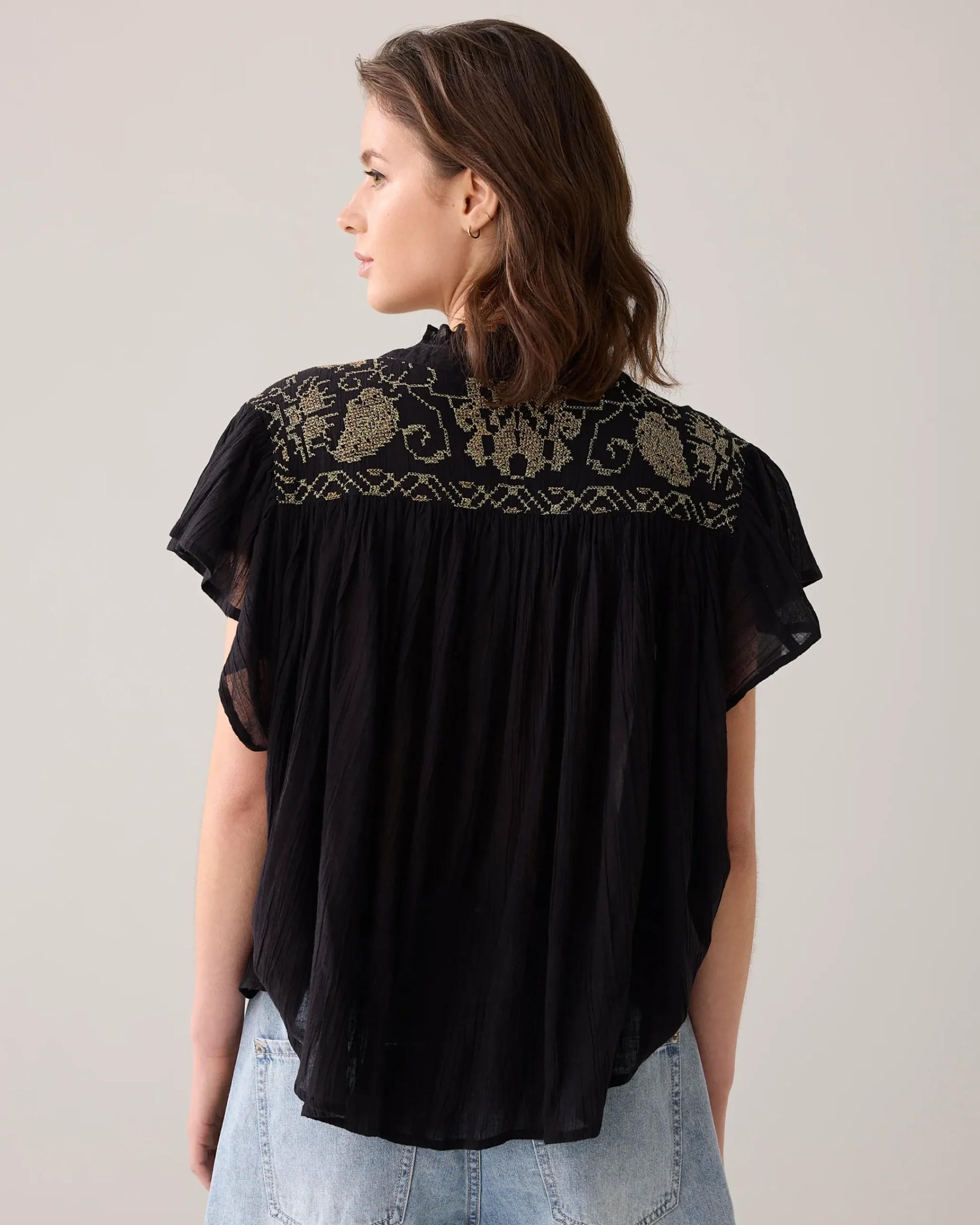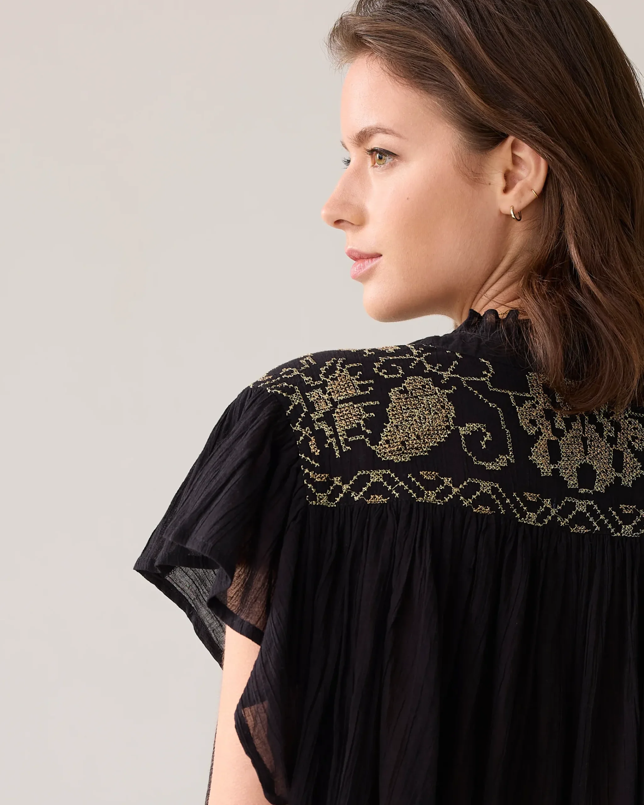 This airy blouse is made of soft cotton voile and has a loose fit. Shimmering lurex embroidery on the shoulder panel and subtle gathering at the back add a sophisticated touch.