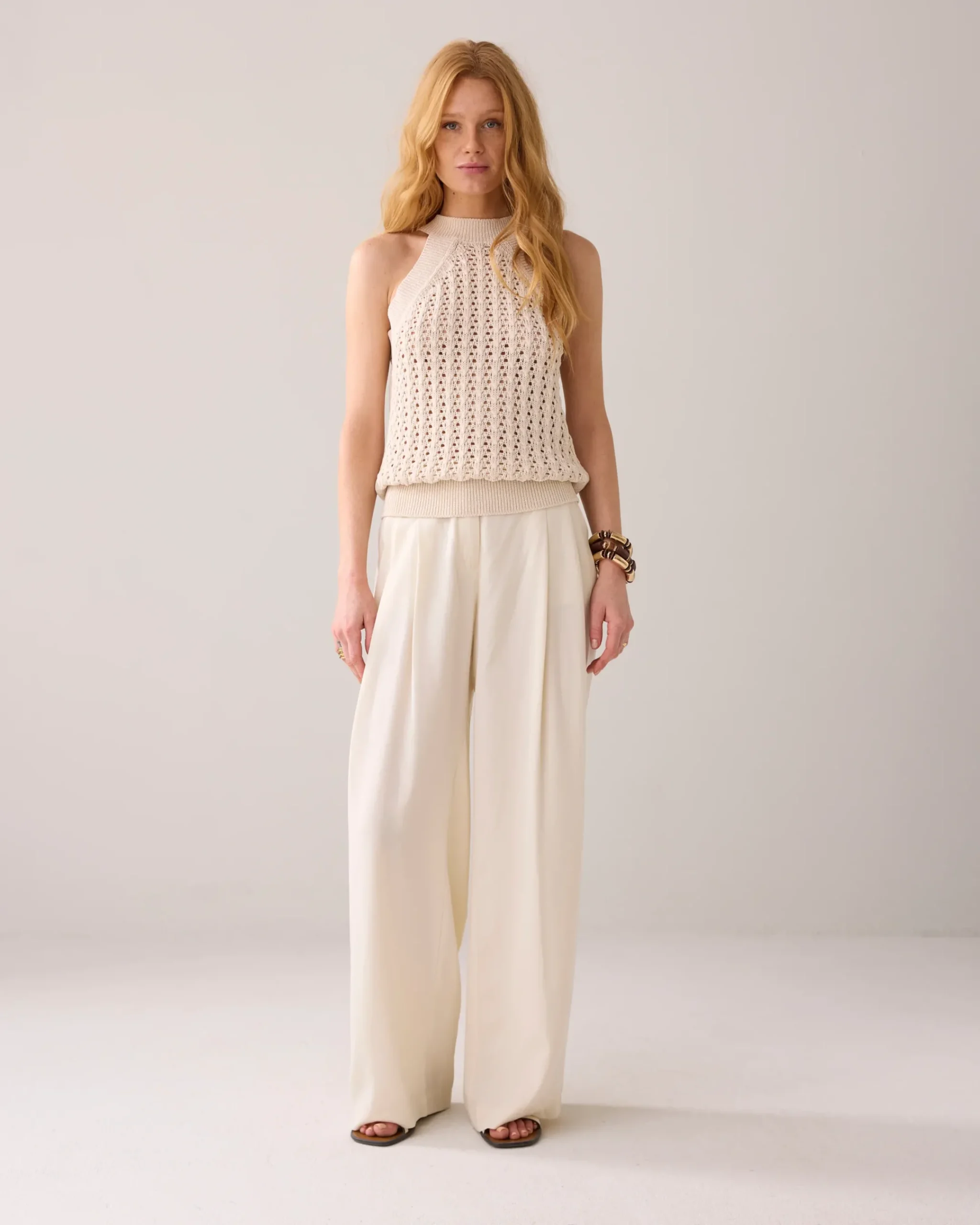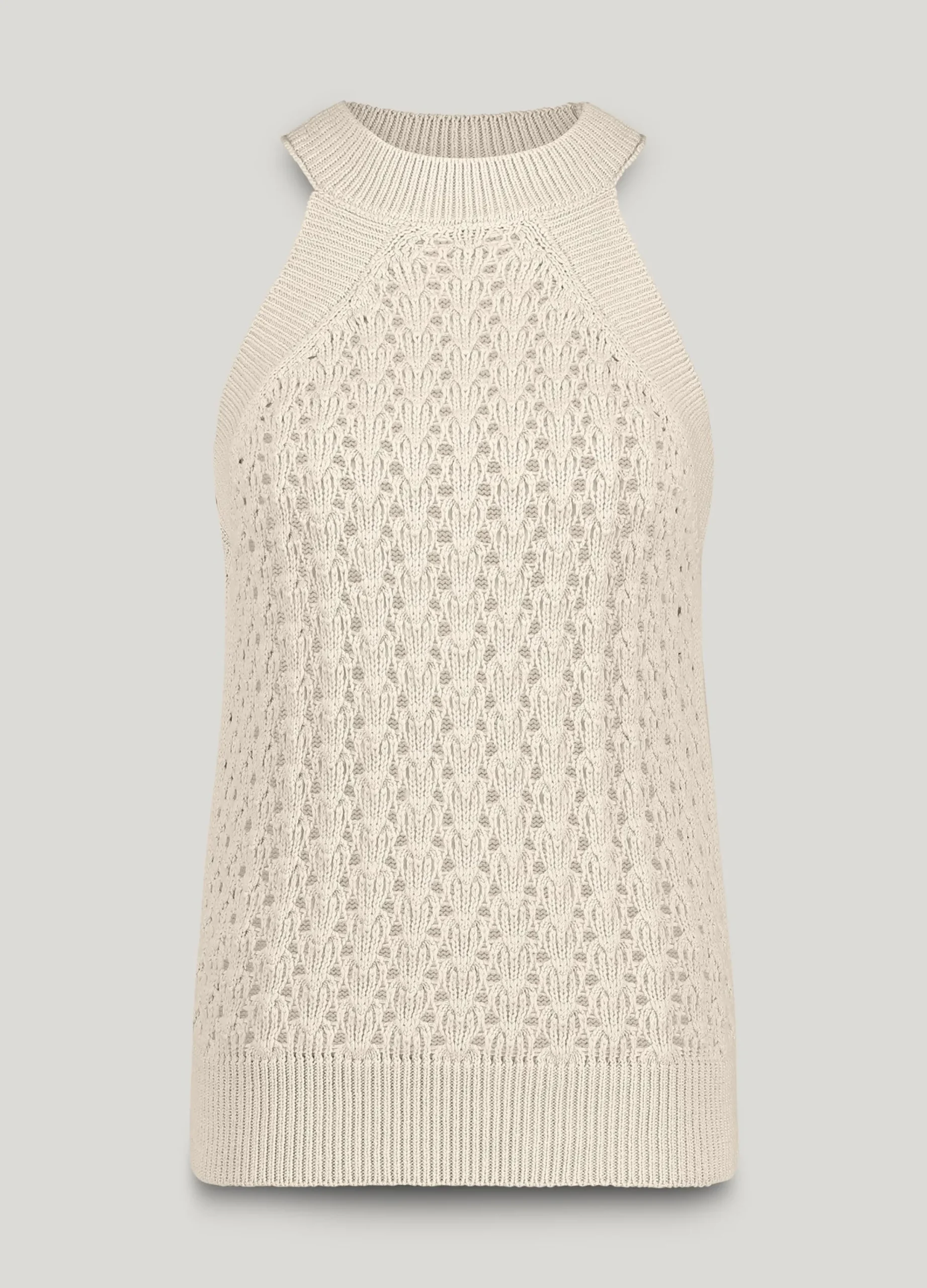 Made of 100% luxurious Italian firm cotton yarn, this halter top features a unique ajour knit pattern on the front. The top has a slim fit.