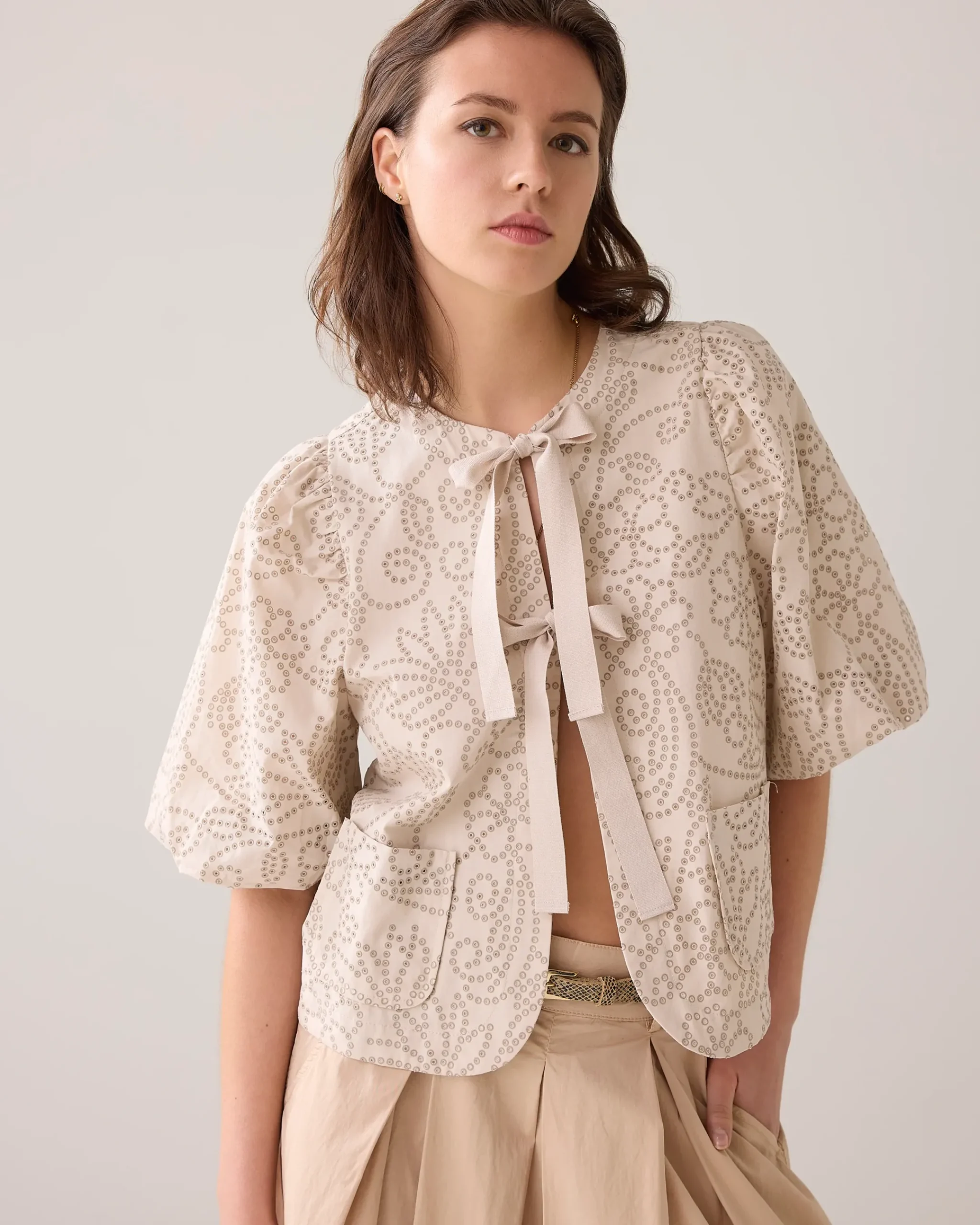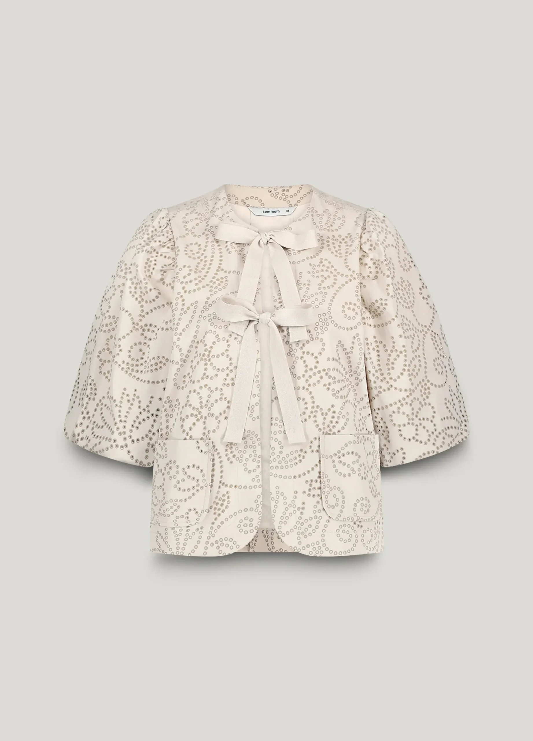 This loose-fitting blouse jacket has playful balloon sleeves and a ribbed bow fastening. The jacket is made of laser-cut fabric with a hole pattern and is fully lined.