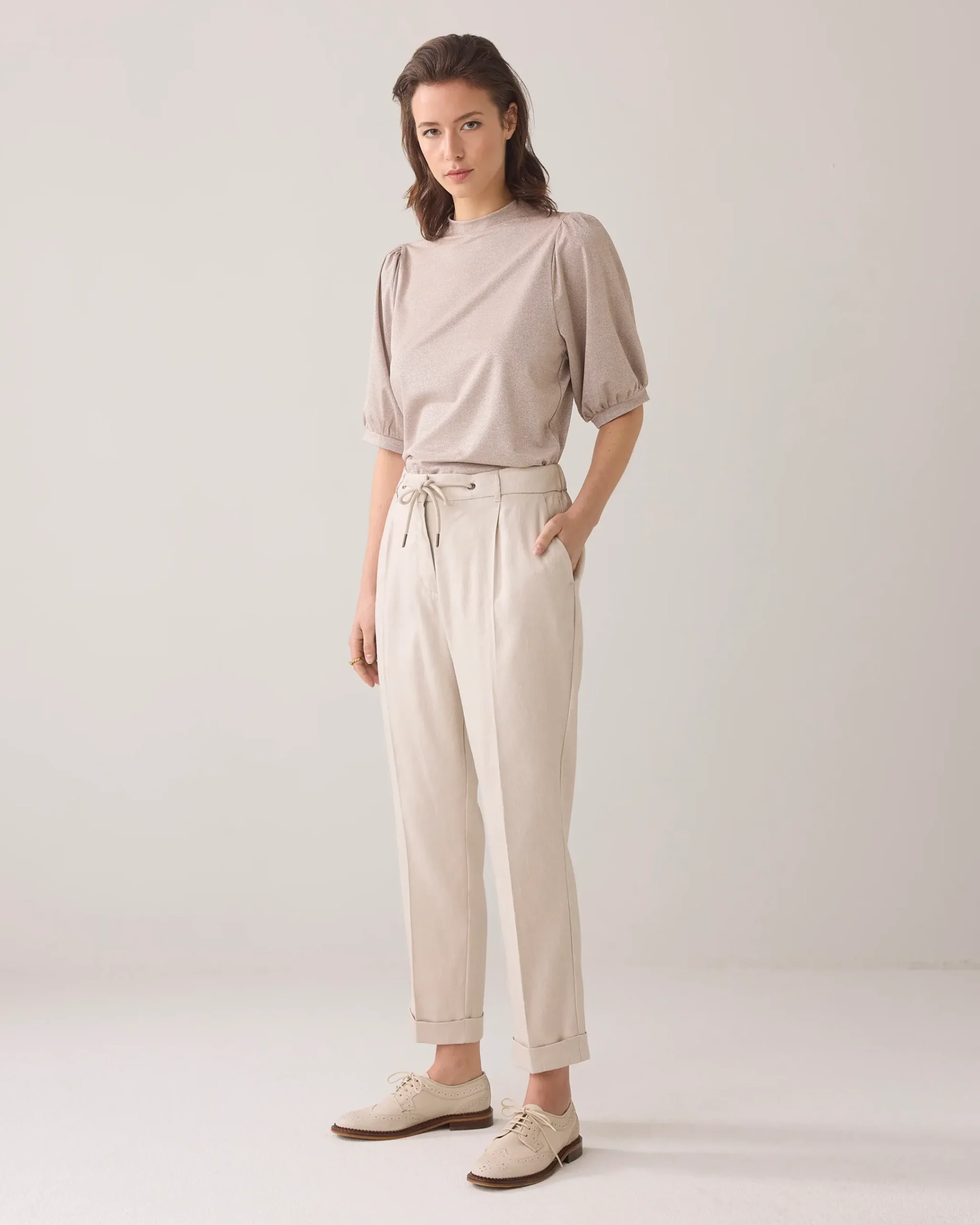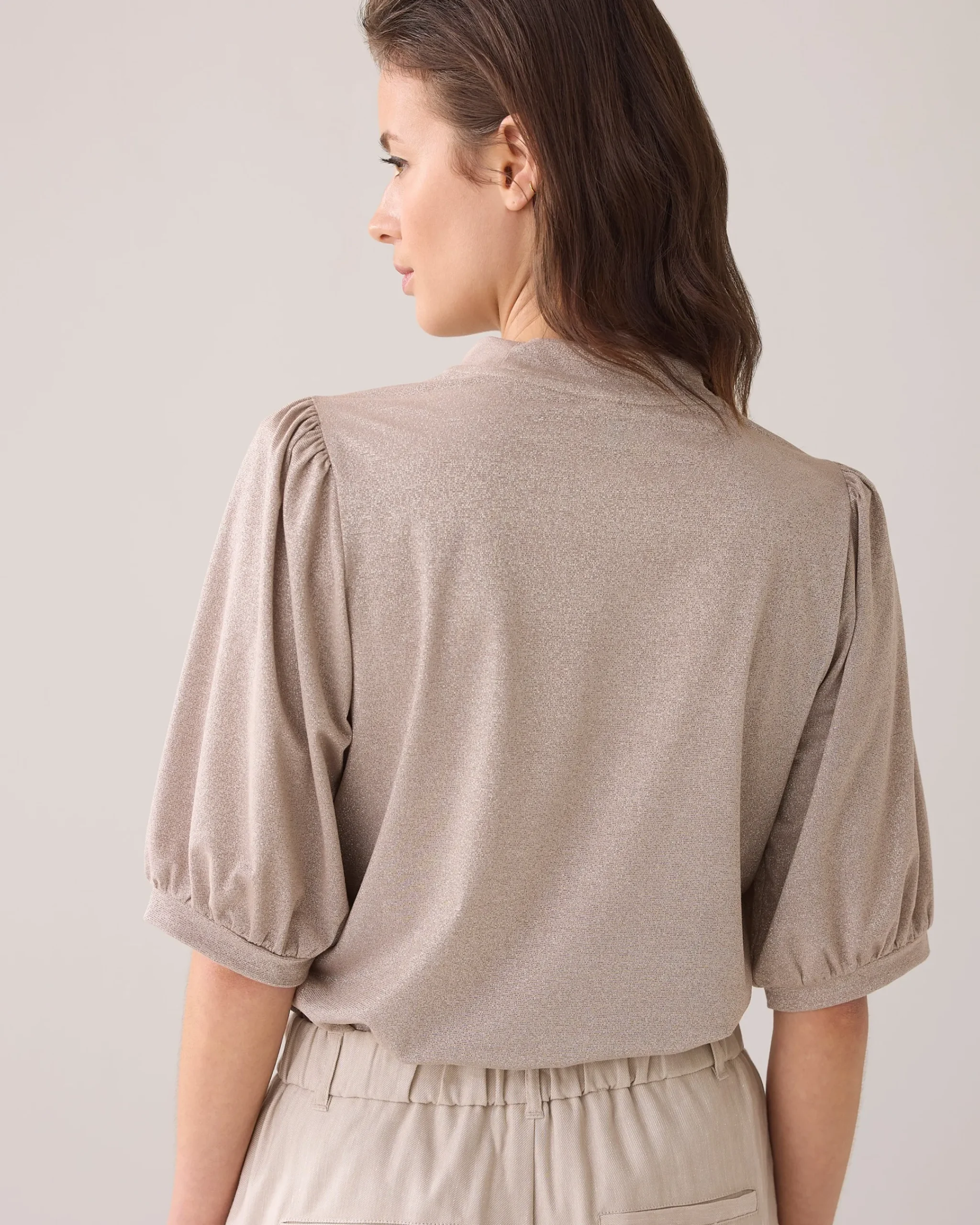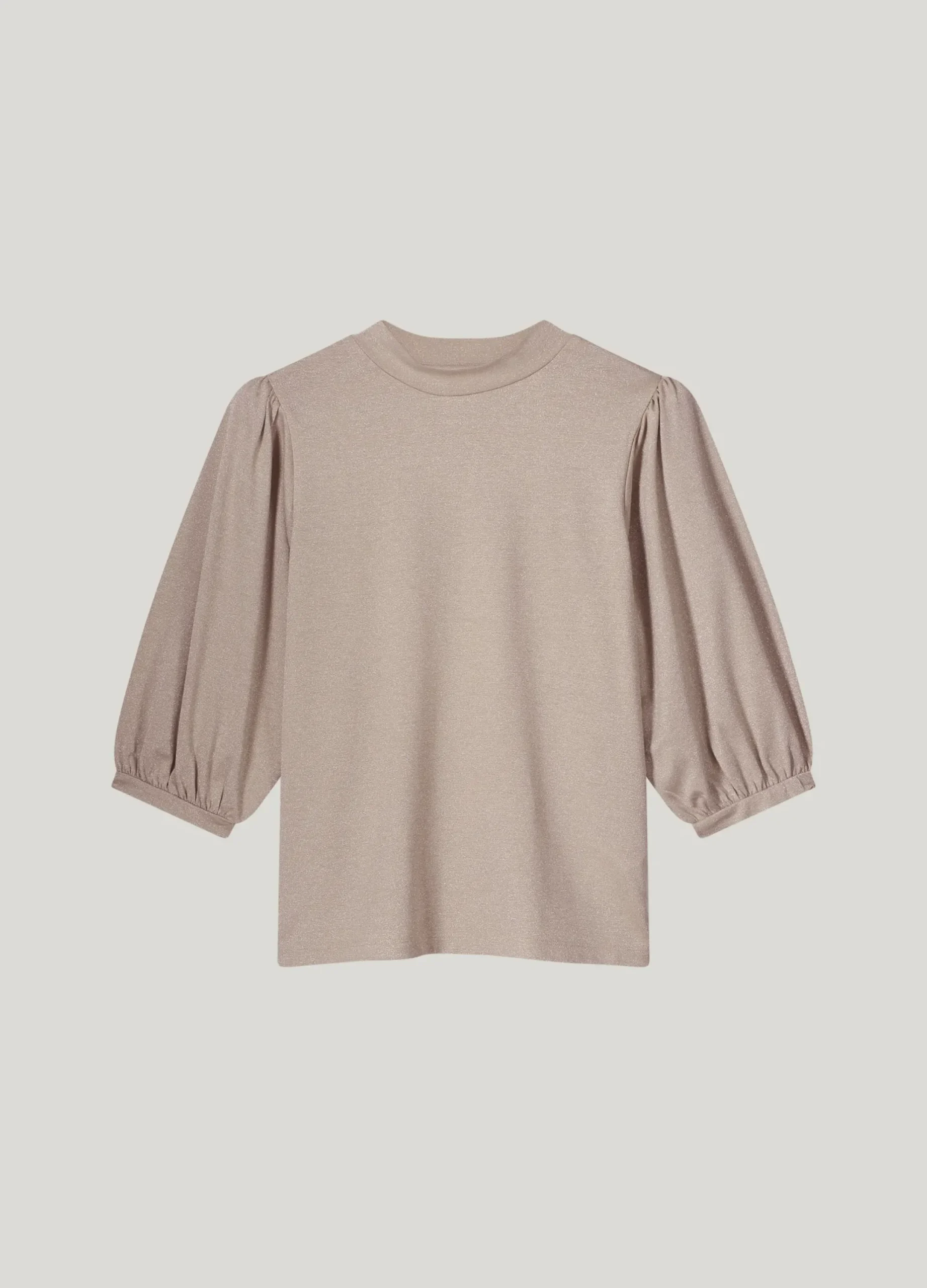 This top has three-quarter puff sleeves with a narrow hem. The top has a regular fit and is made of a soft, shiny viscose lurex fabric.