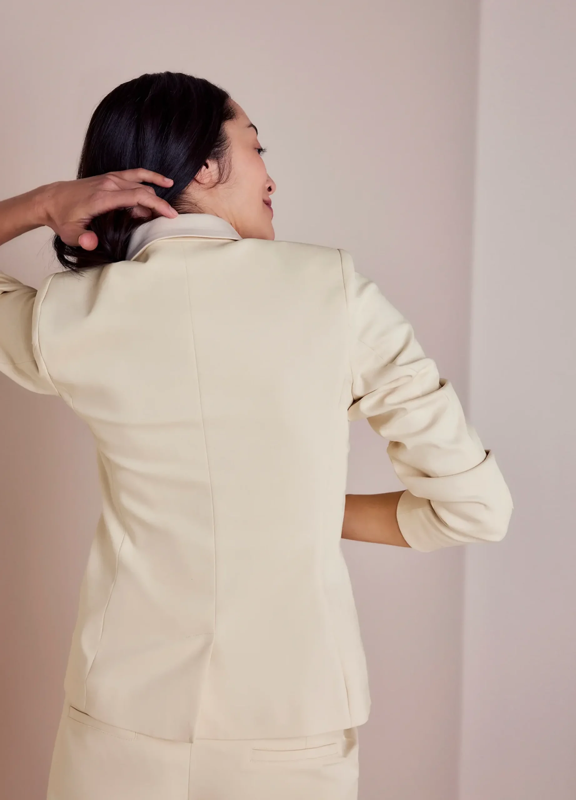 This blazer designed in a comfortable punto milano fabric. The fitted blazer has a lapel collar and piped pockets with flap.