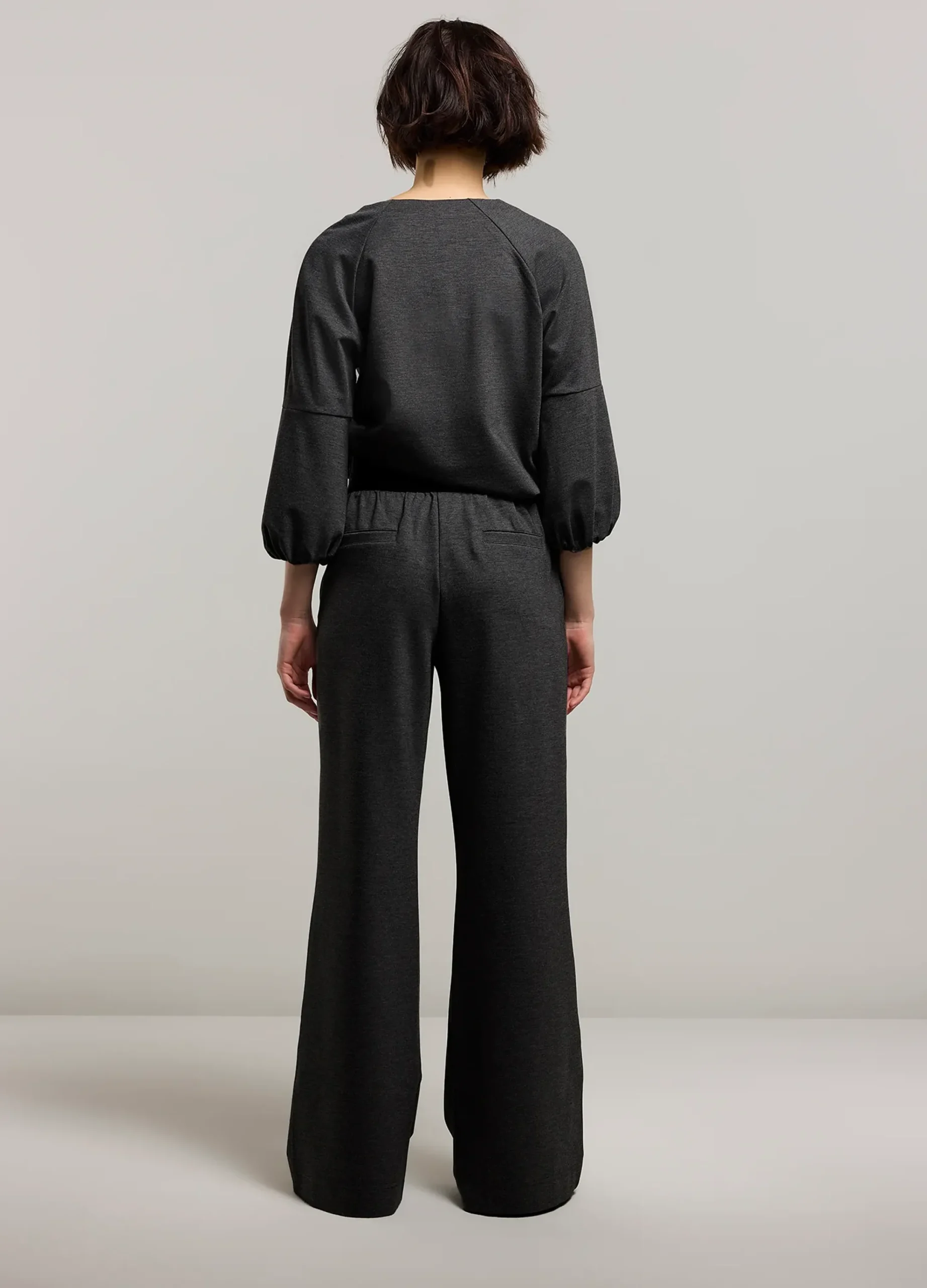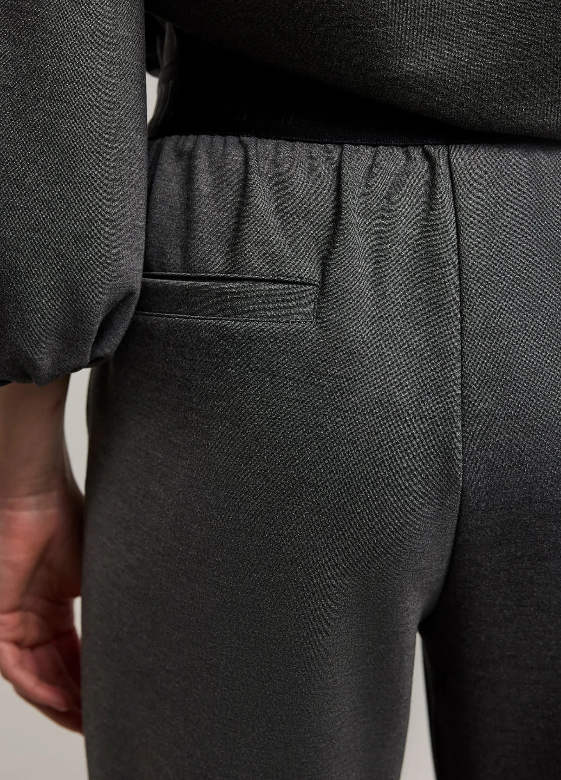 Bootcut trousers with a high, elasticated waist, made from comfortable Punto Milano fabric. The trousers have slightly tapered legs with press creases at the front.