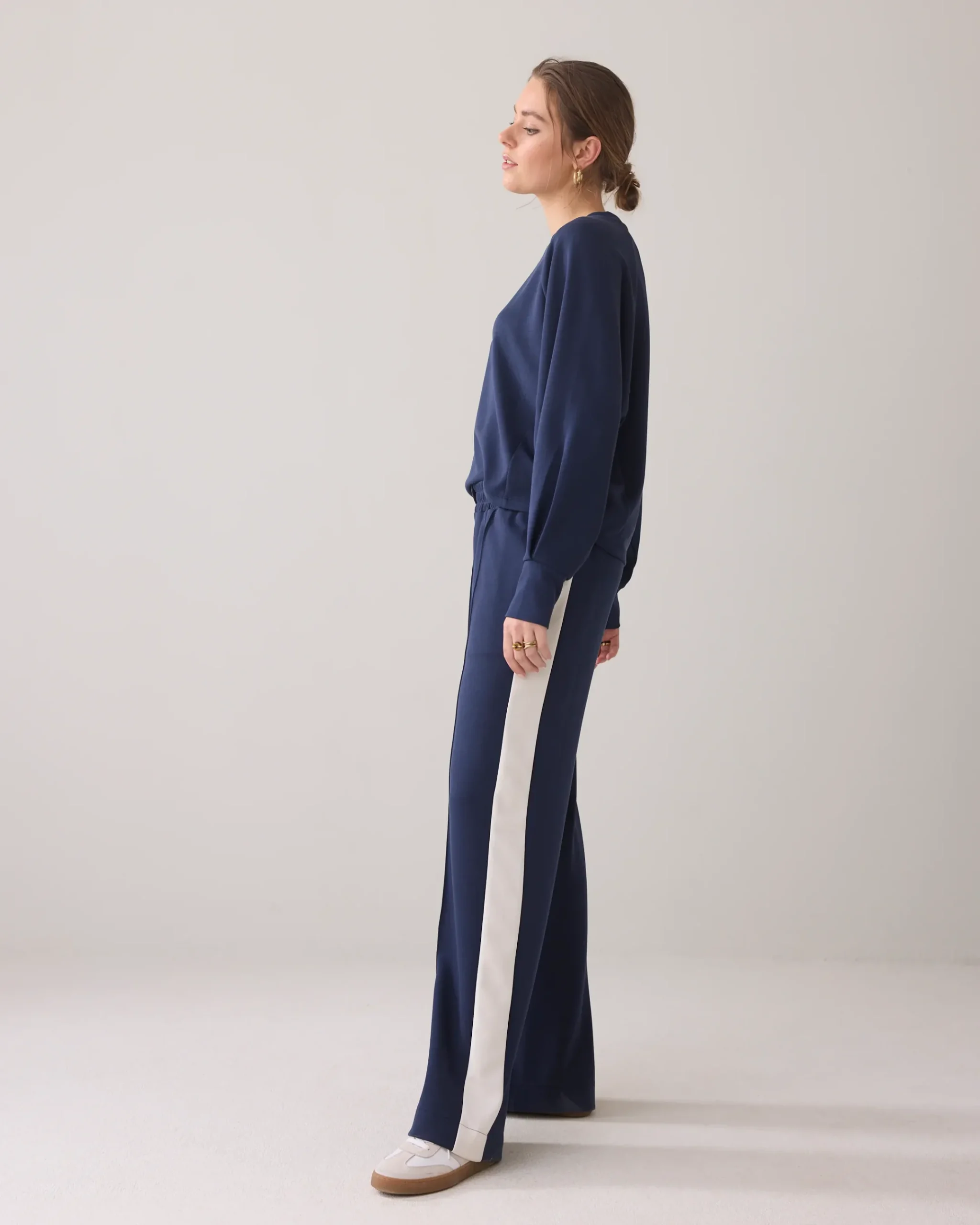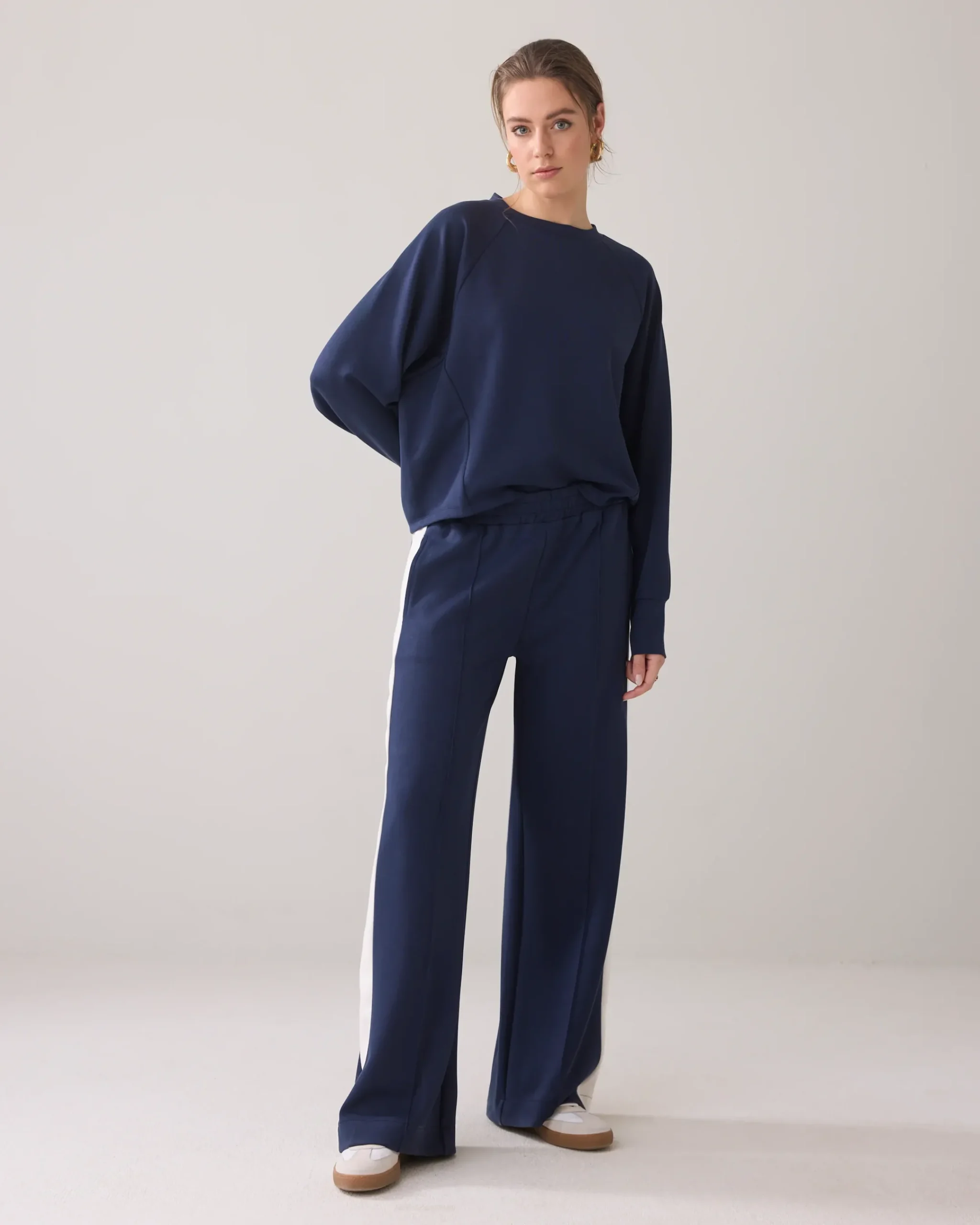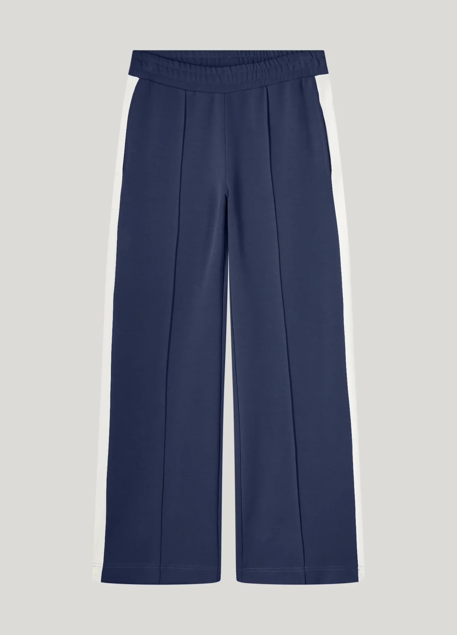 Made of soft scuba jersey, these sporty trousers feature wide legs with a contrasting stripe on the side seam. The trousers have an elasticated waistband and pintuck at the front.