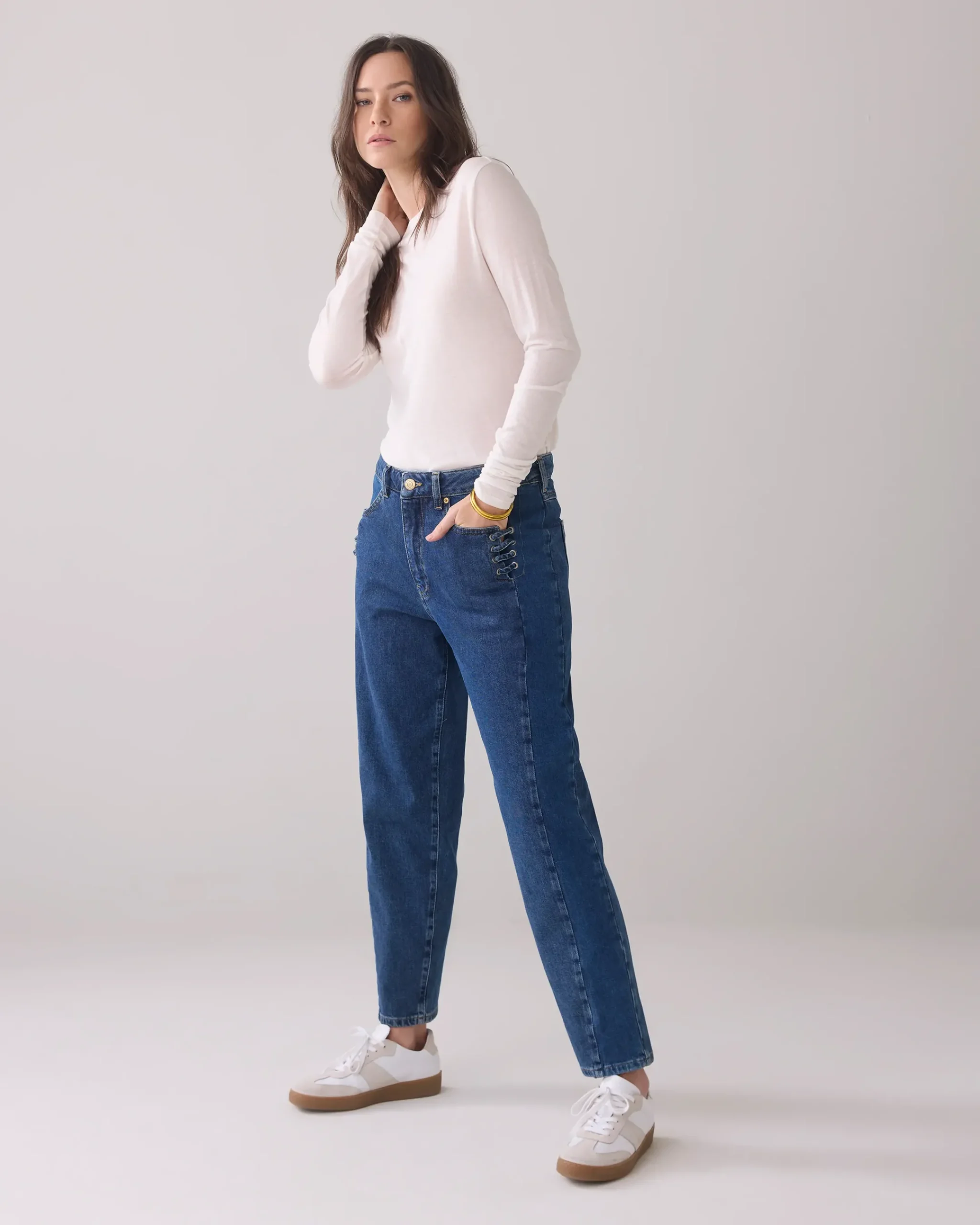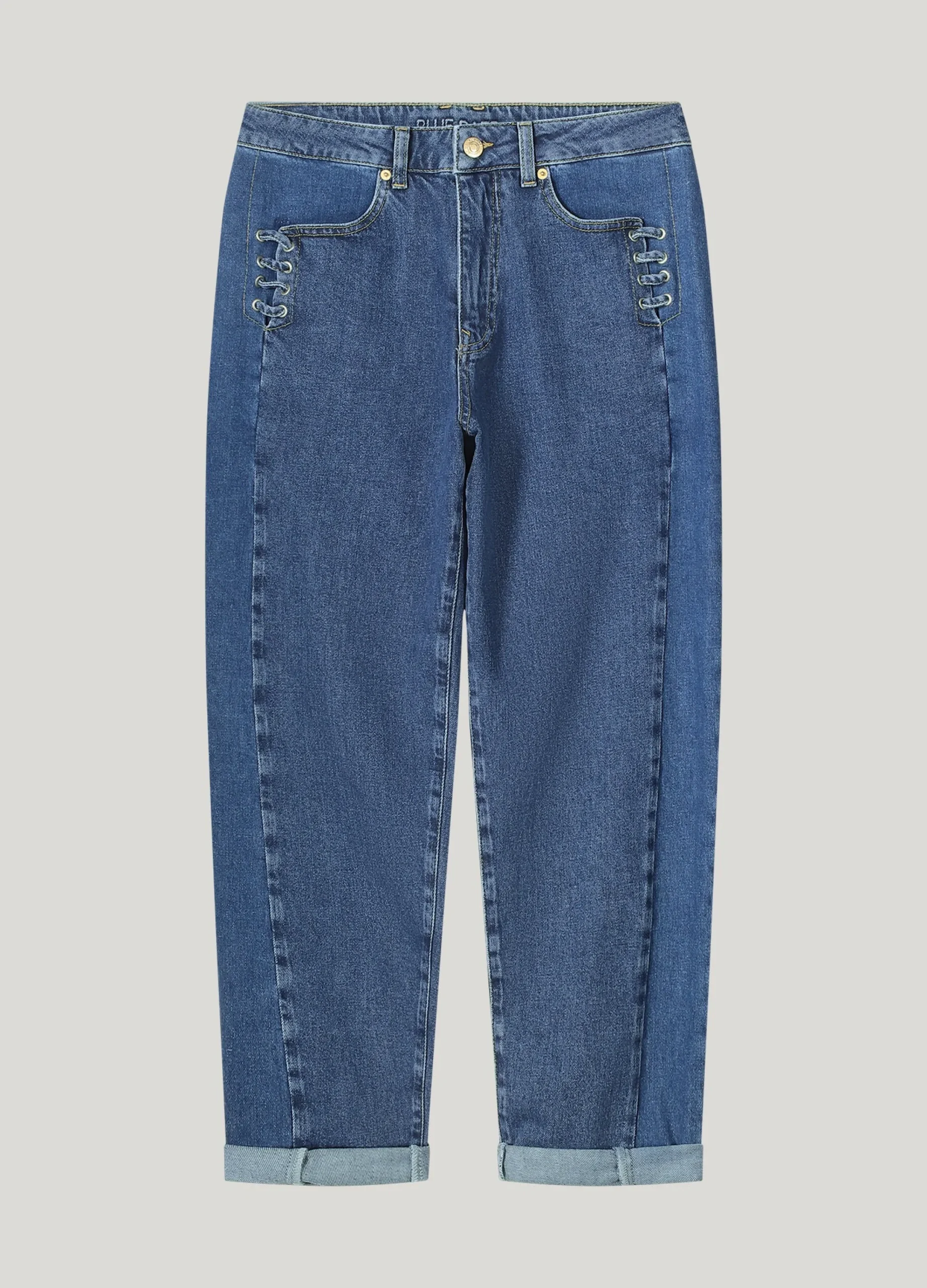 These tapered jeans in stretch denim have a high waist and relaxed fit on the hips. The trousers have rope details at the trouser pockets and are two-tone.