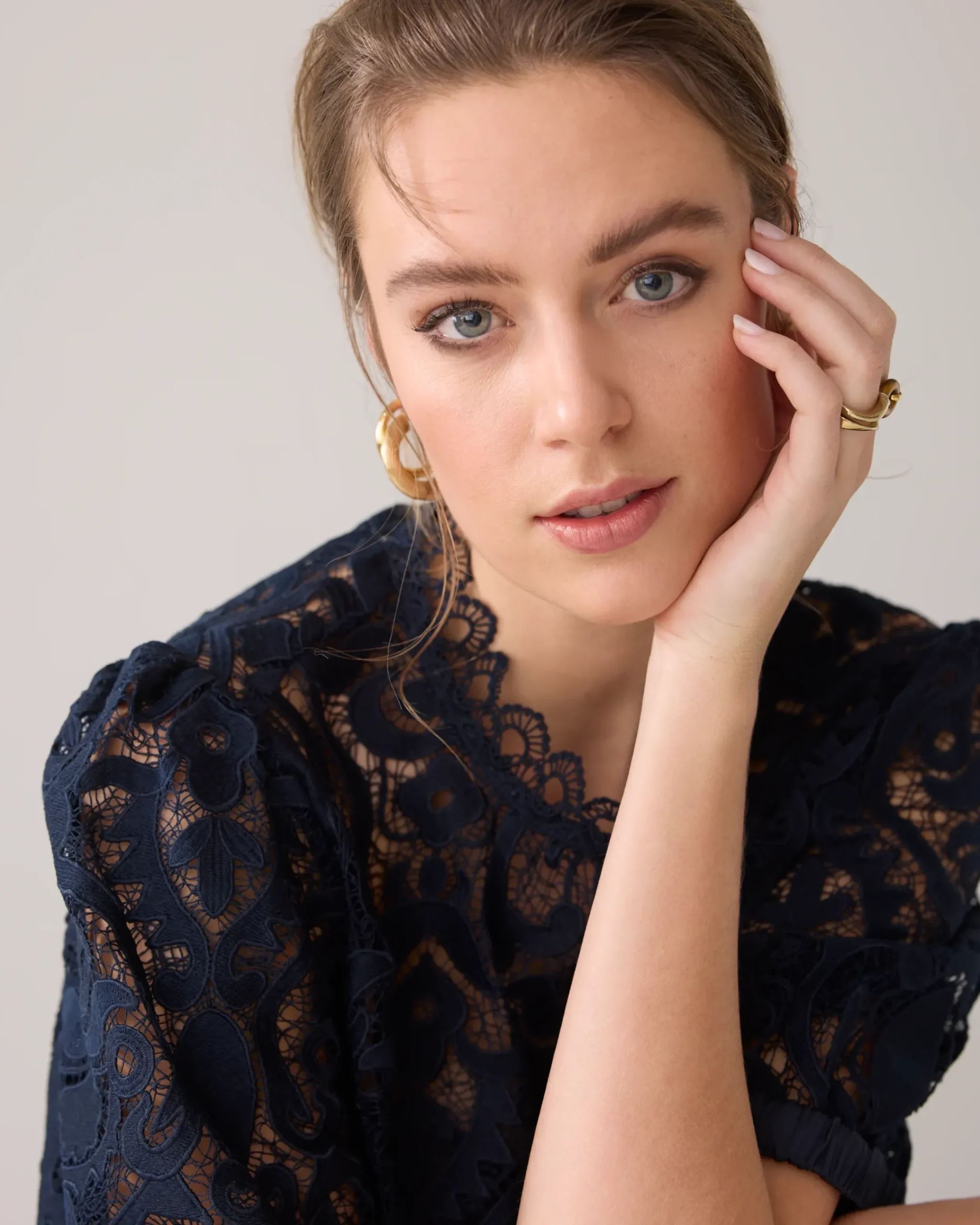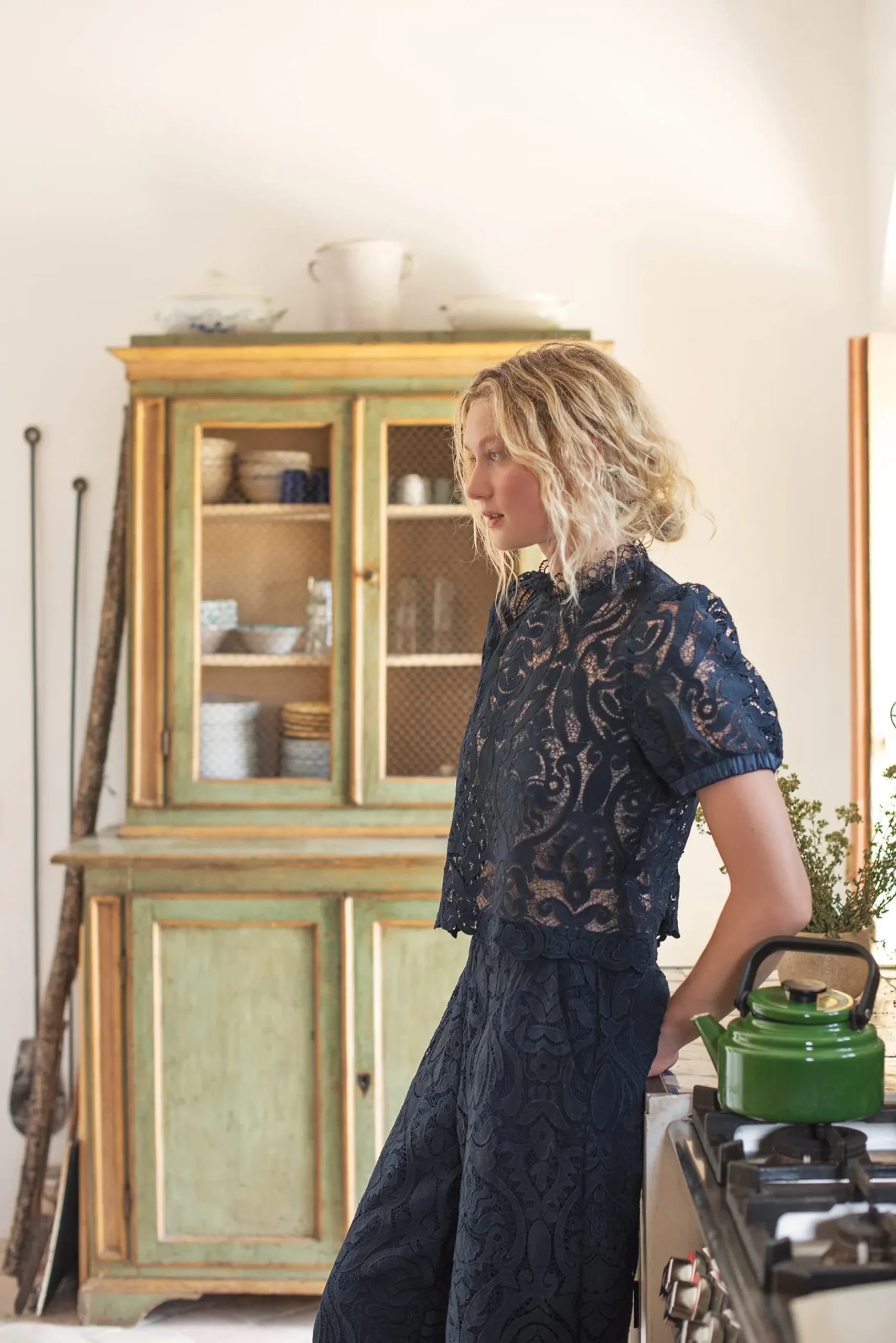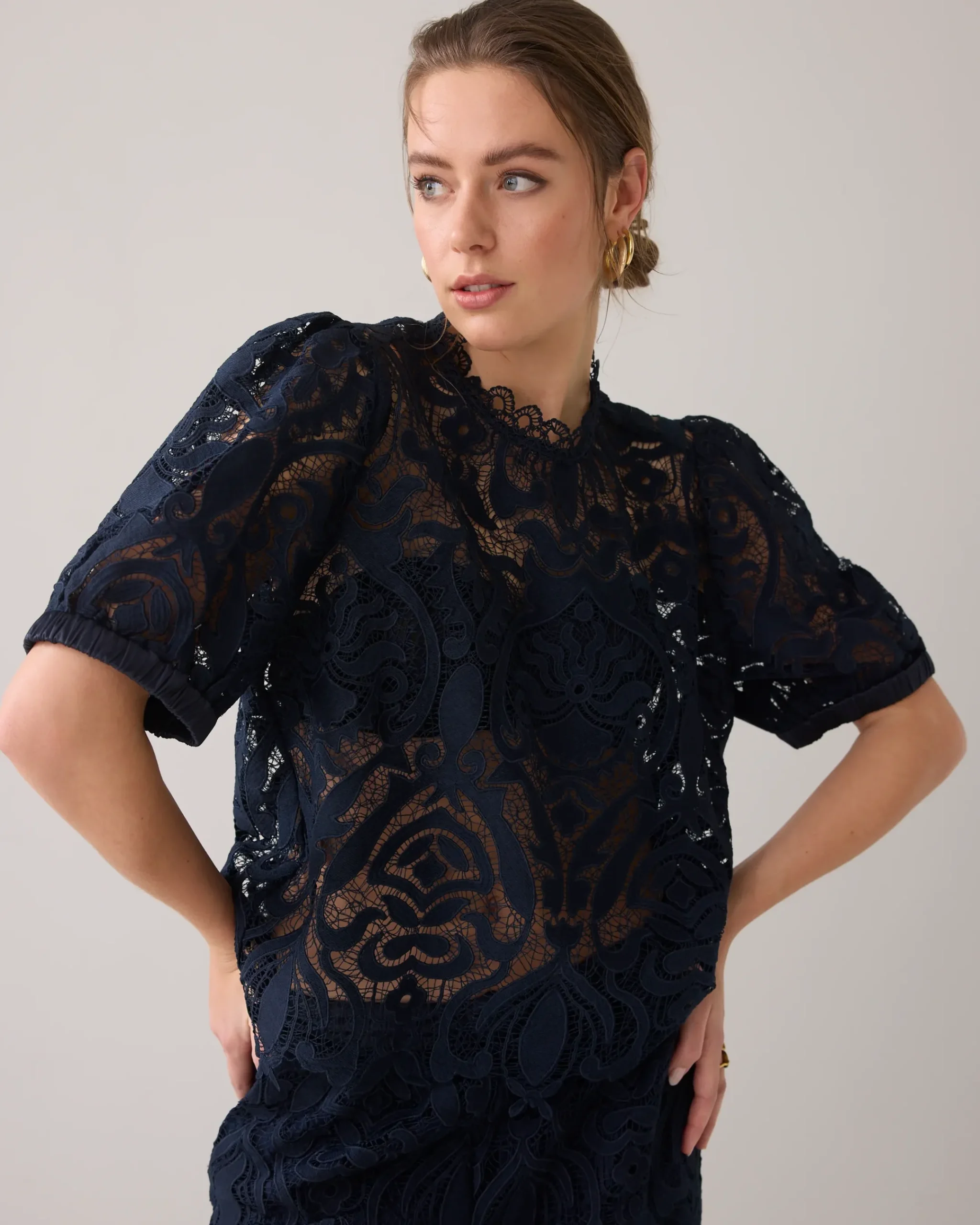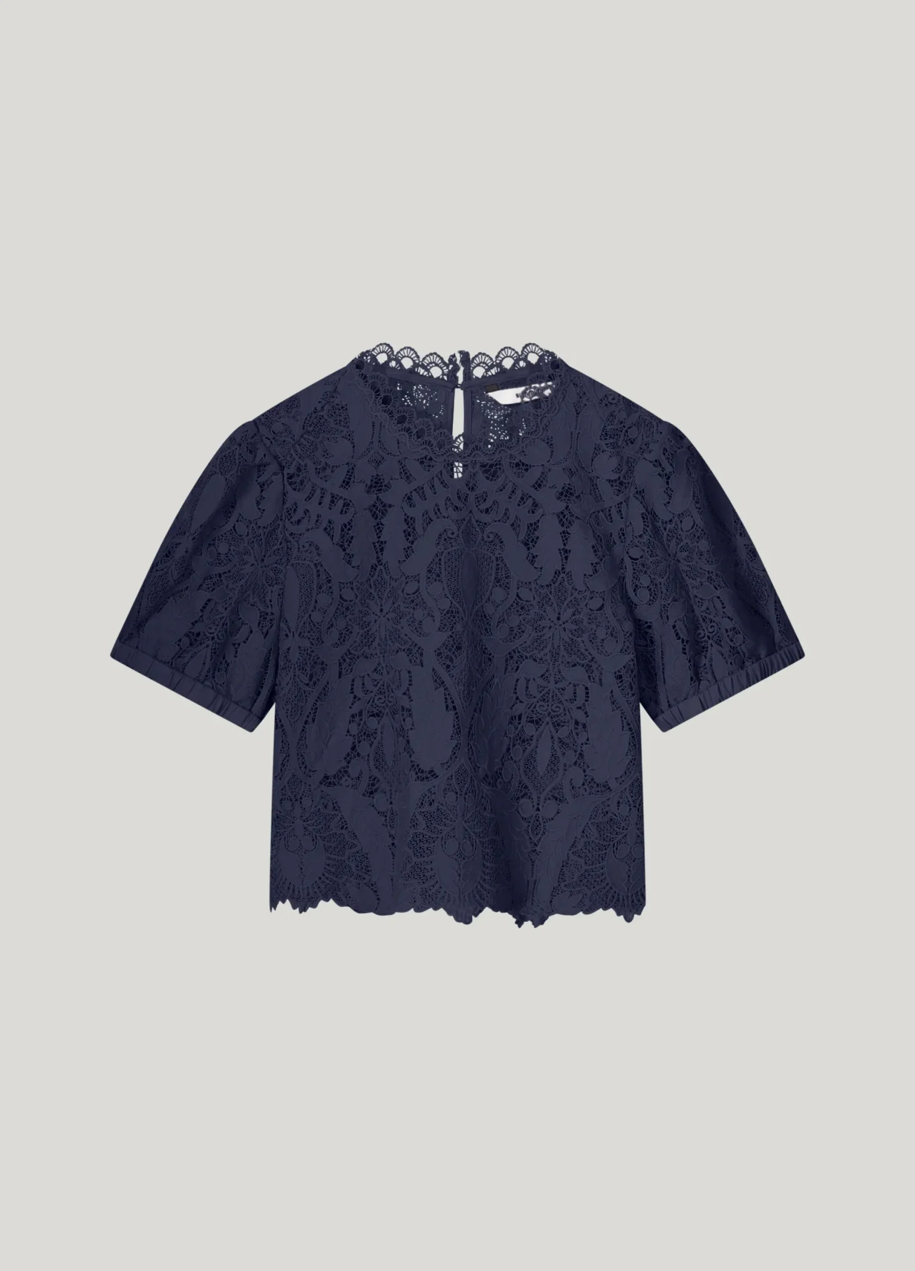 This top is made of transparent lace and has a scalloped finish at the neckline and bottom. The top has short puff sleeves and a round neckline with a zip fastening at the back.